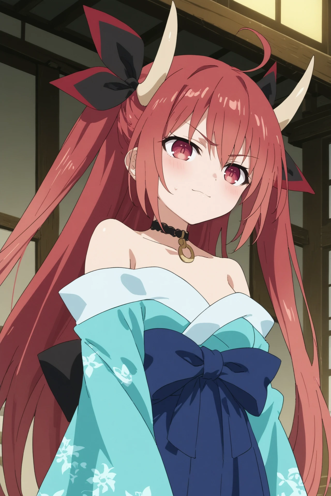 Astral dress : kotori itsuka, astral dress, long hair, red eyes, ribbon, bare shoulders, red hair, japanese clothes, horns, choker, kimono,