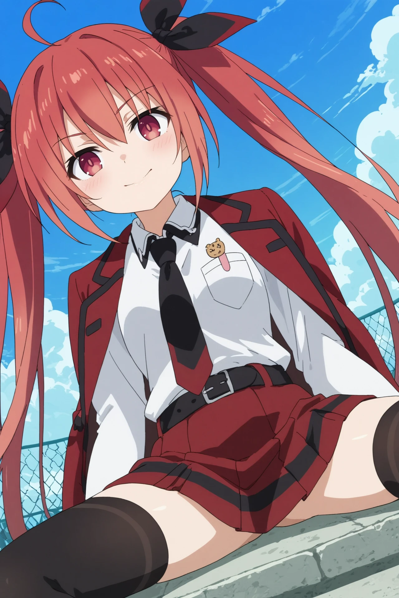 Jacket : ribbon, hair ribbon, skirt, shirt, thighhighs, school uniform, jacket, white shirt, necktie, belt, black thighhighs, zettai ryouiki, red skirt, jacket on shoulders, red jacket, long sleeves, white sleeves