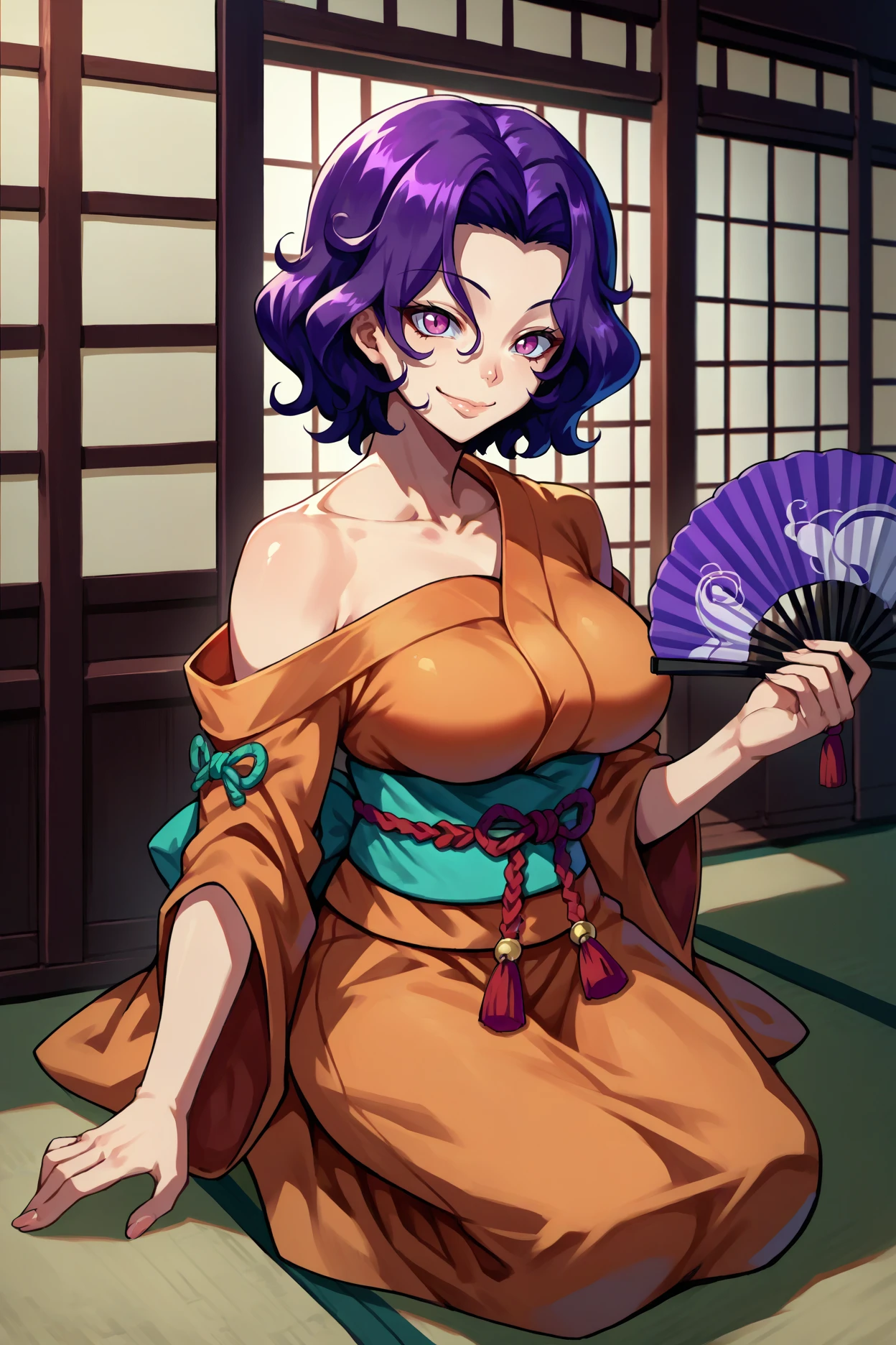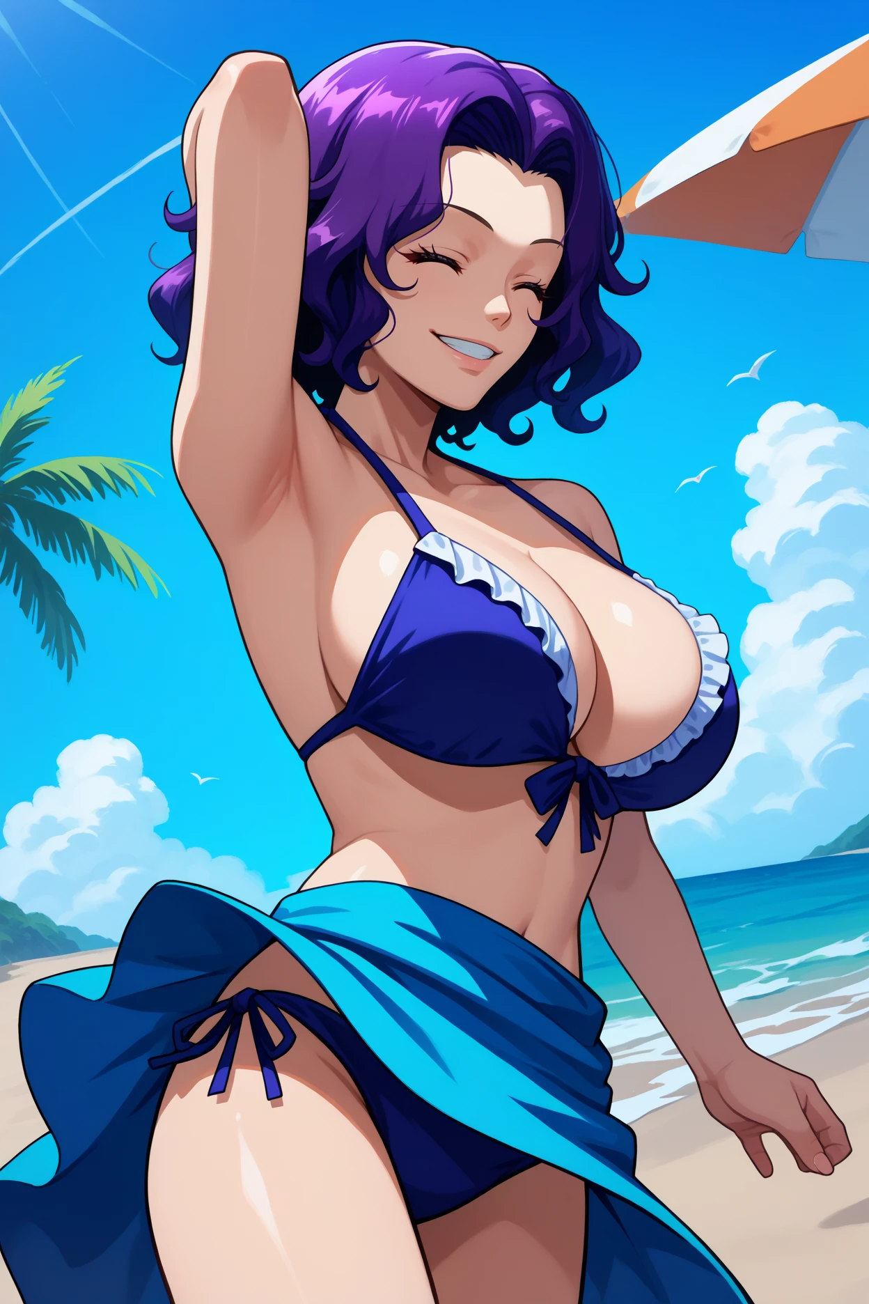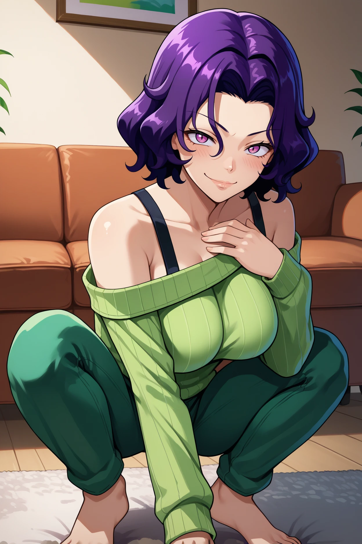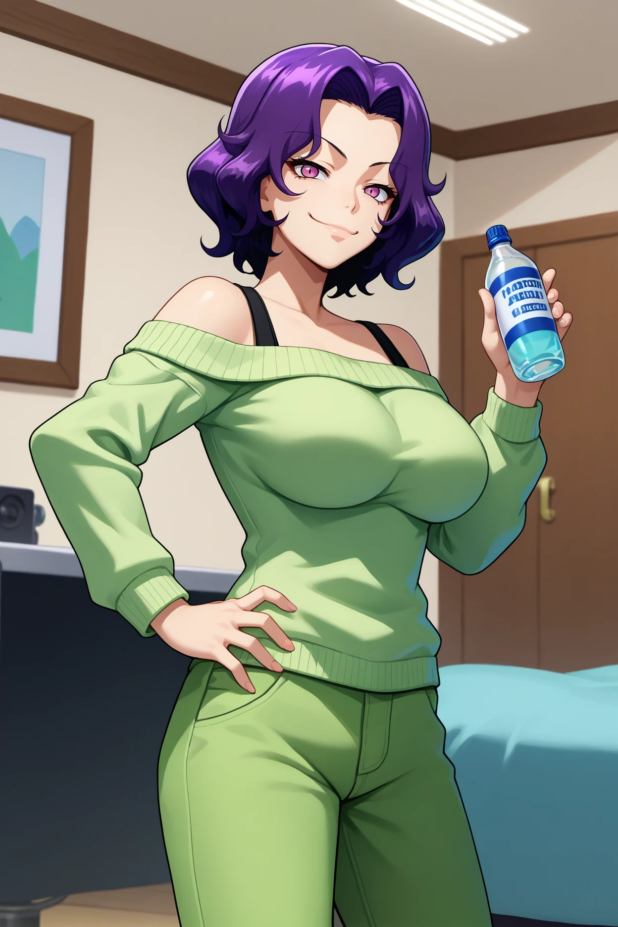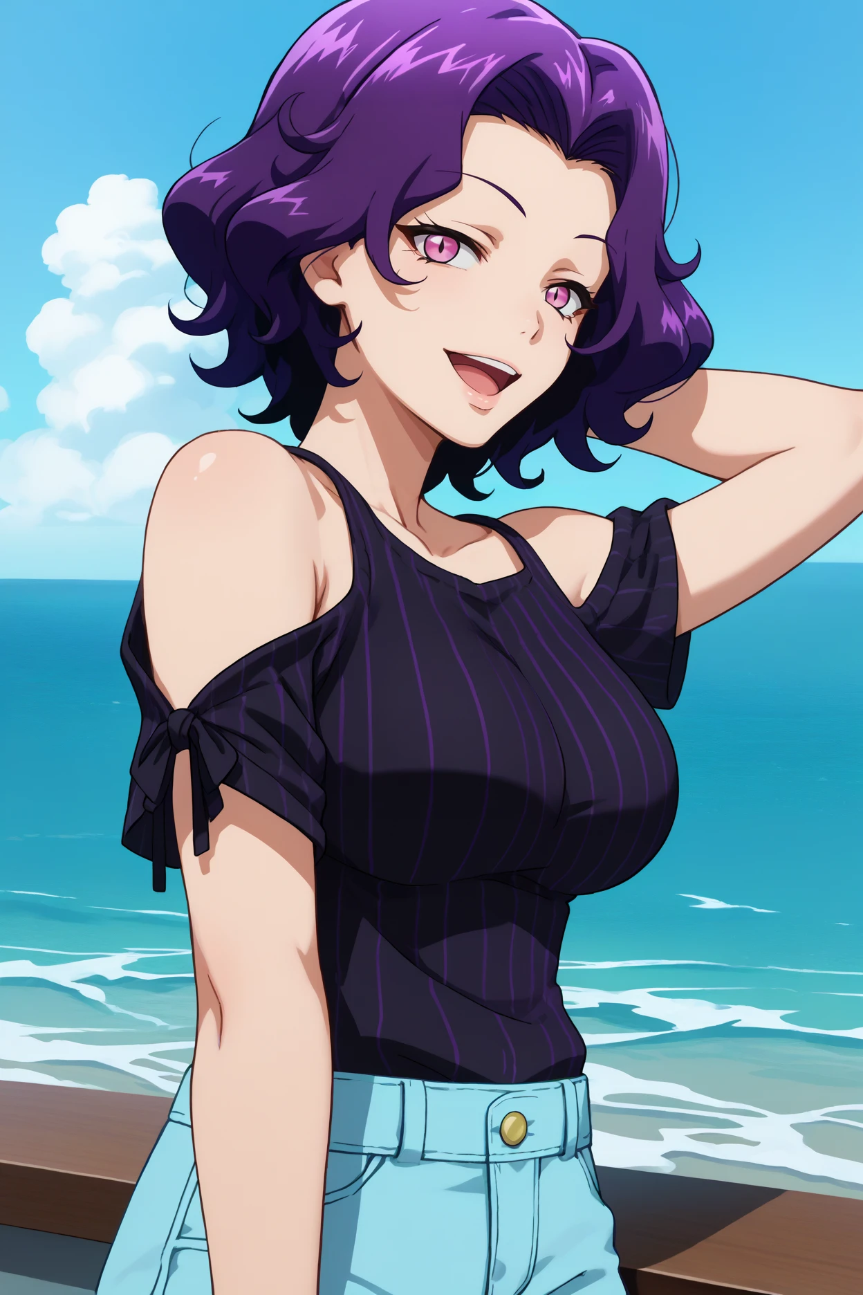 gbaz, purple hair, short hair, wavy hair, purple eyes, large breasts