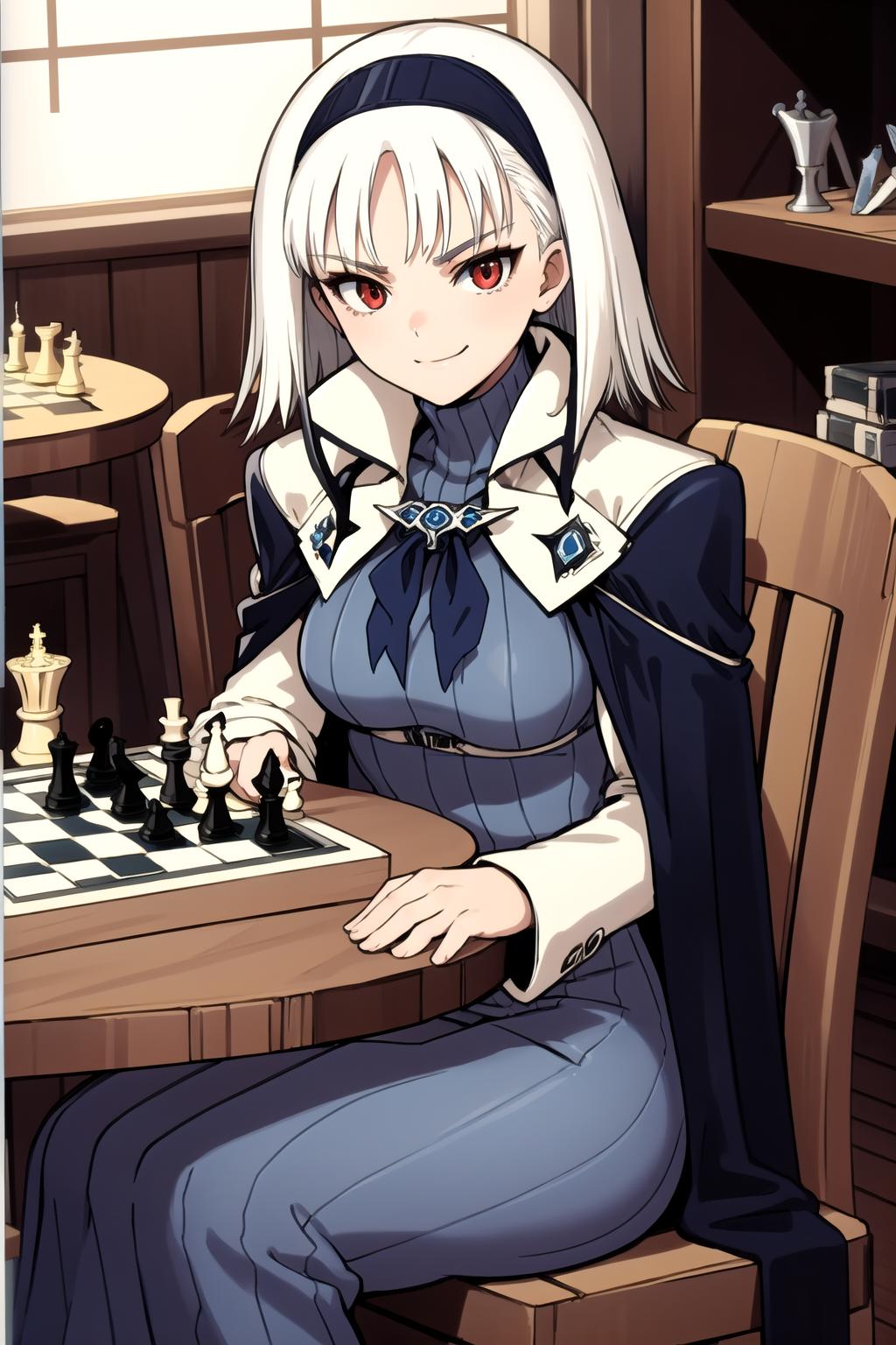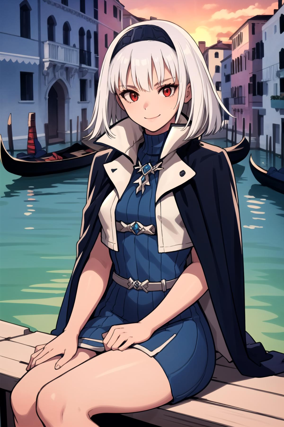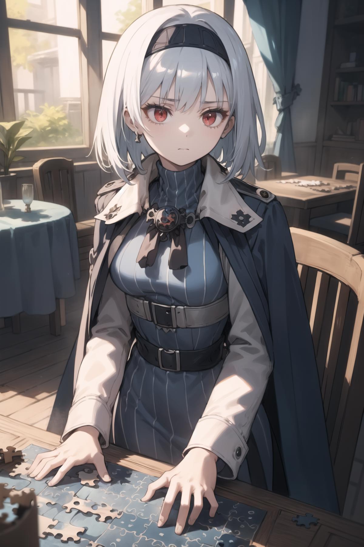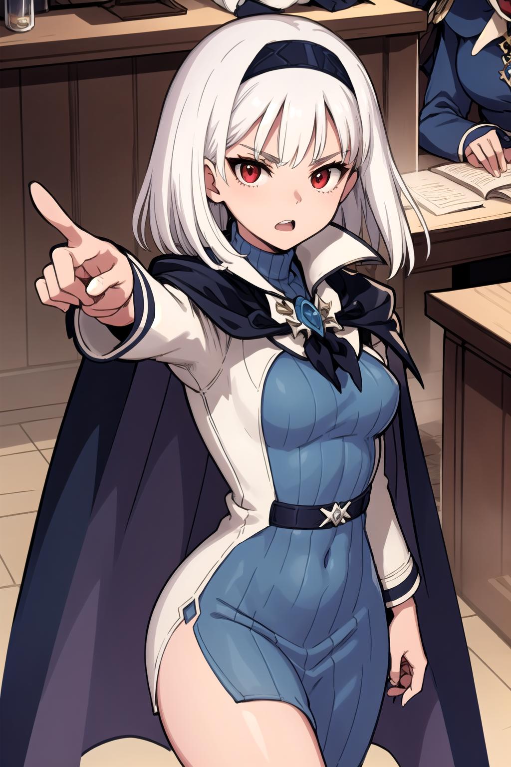stbn, hairband, red eyes, short hair, stcape, turtleneck, blue dress