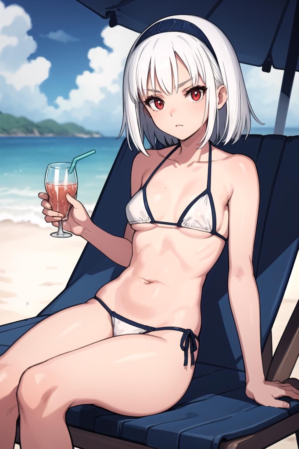 stbn, hairband, red eyes, short hair, bnbikini, (white bikini:0.85)