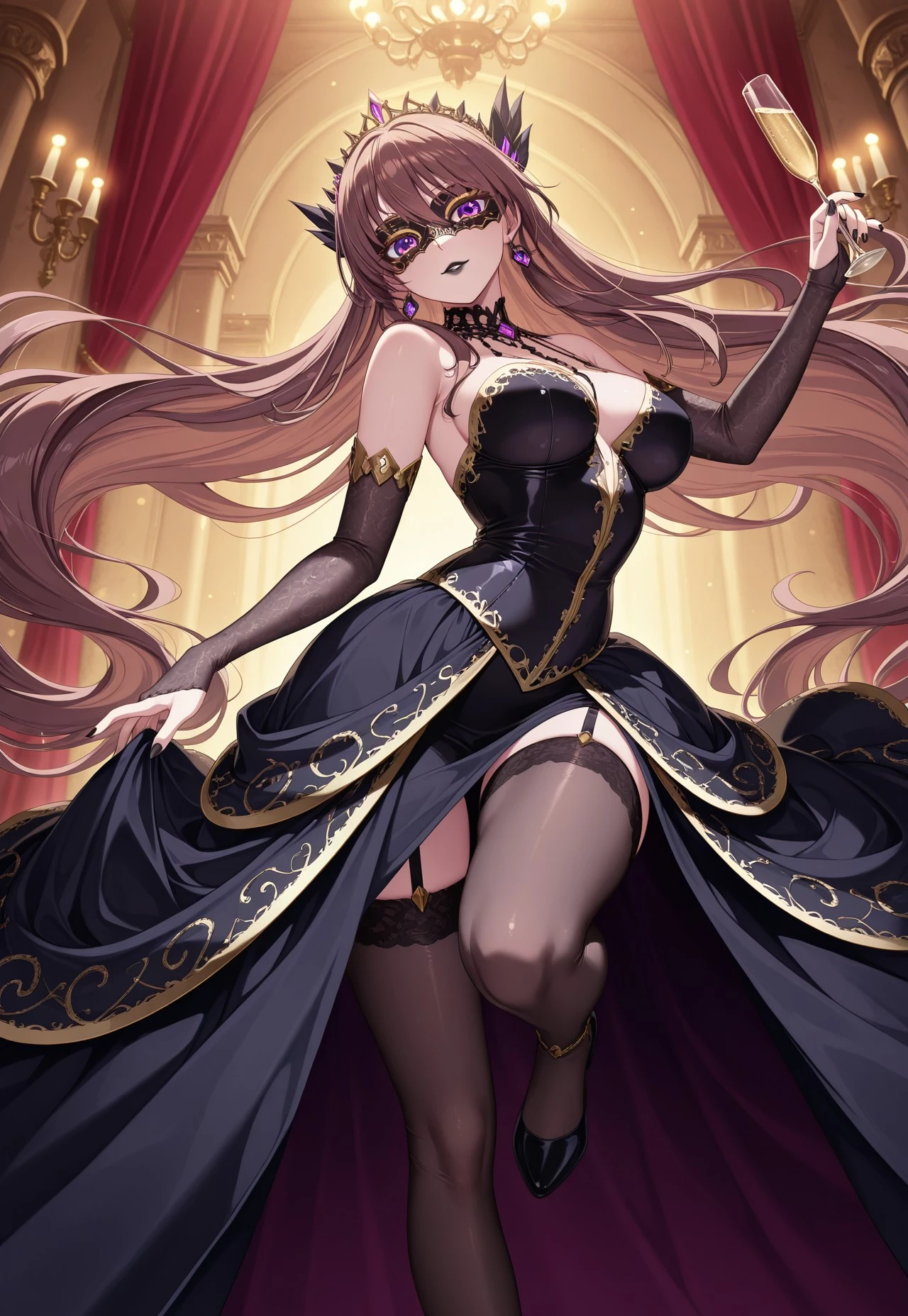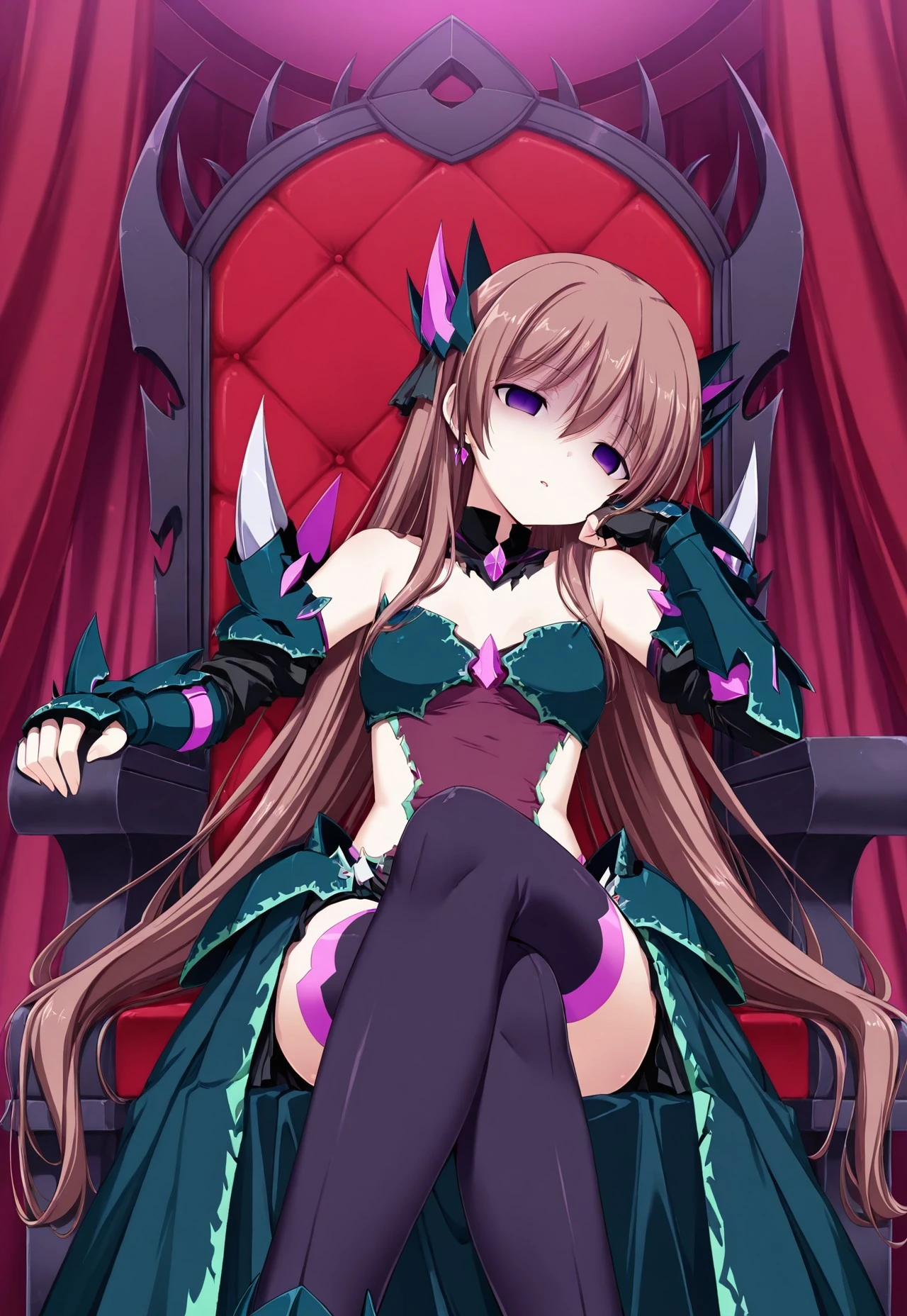 Corrupted form : corrupted form,empty eyes,hair tie,horned hair ornament,white and pink thigh high stockings,blue knight boots, pink waist cape,bracers,armored bra,lace band,skirt,corrupted armor,