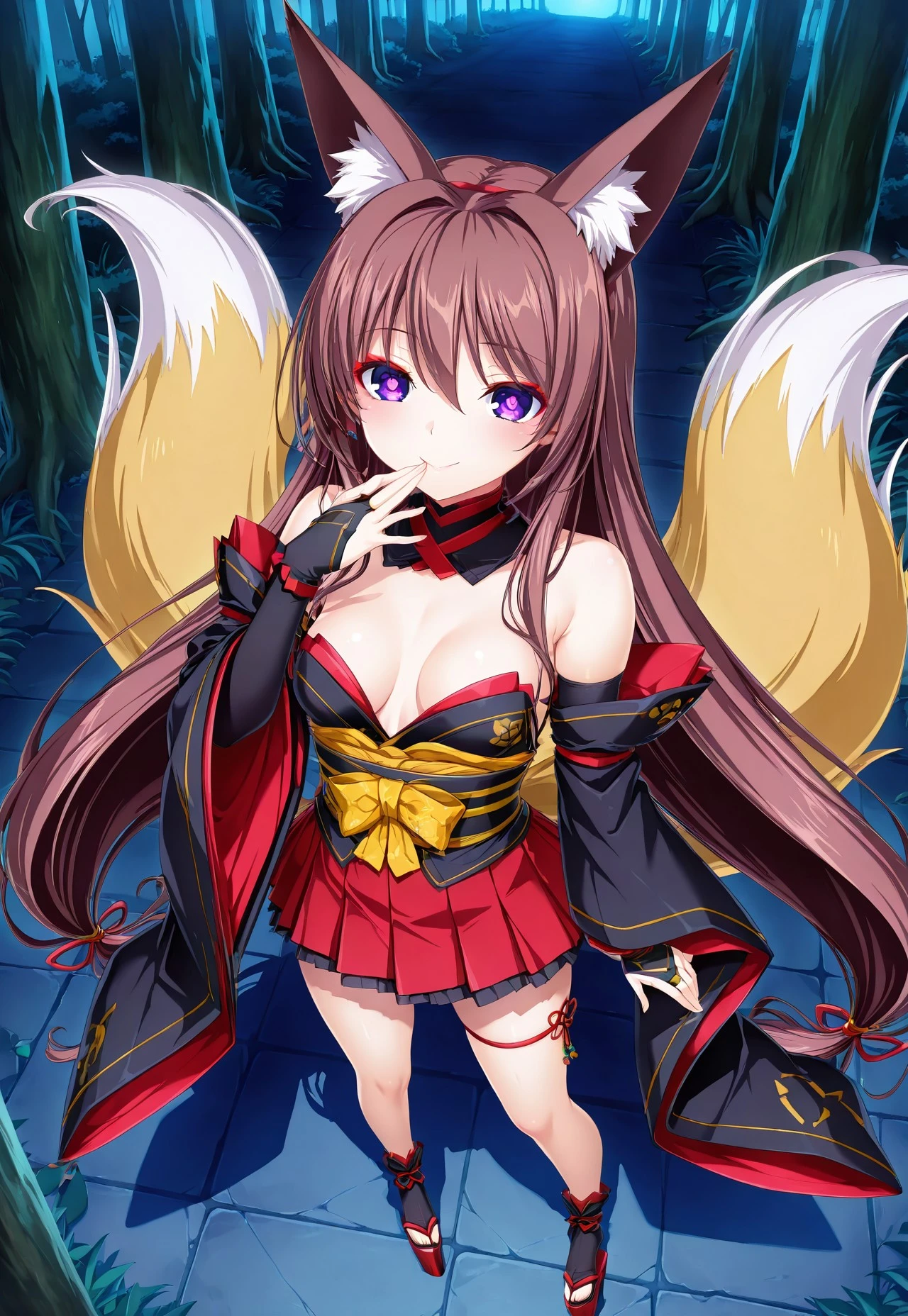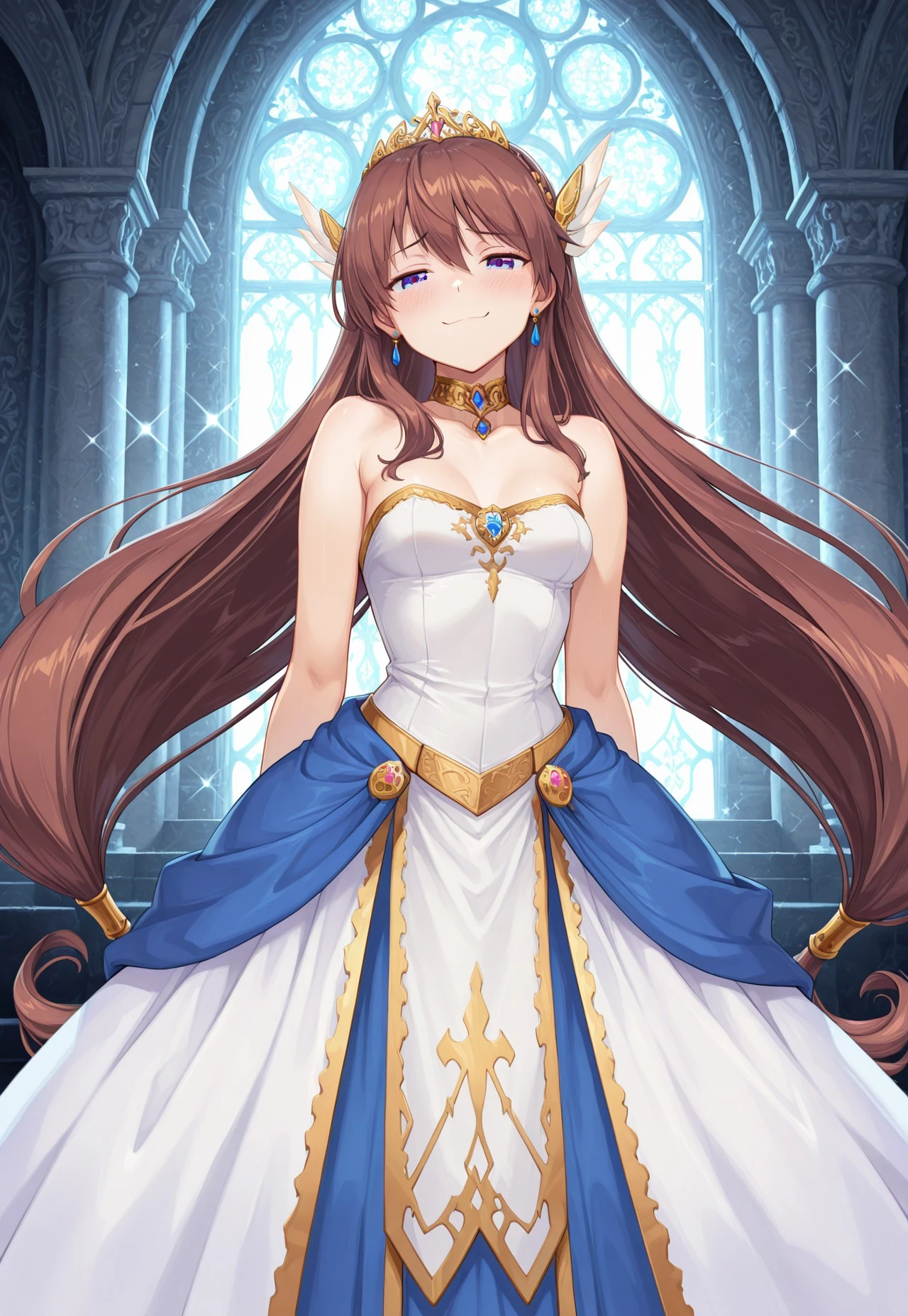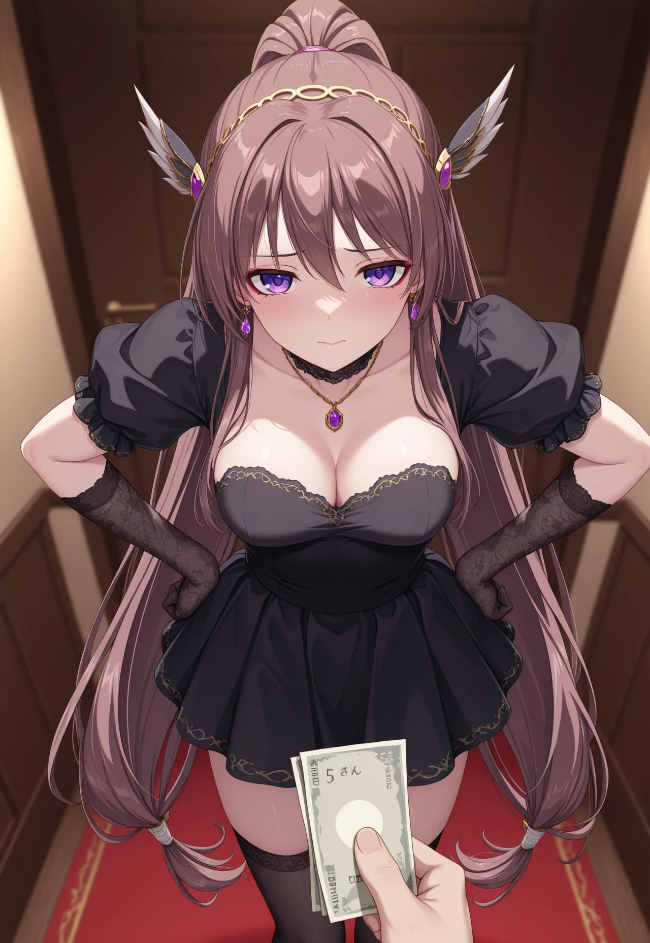 Body : very long hair,brown hair,sidehair,spiky bangs,twin tails,violet eyes,