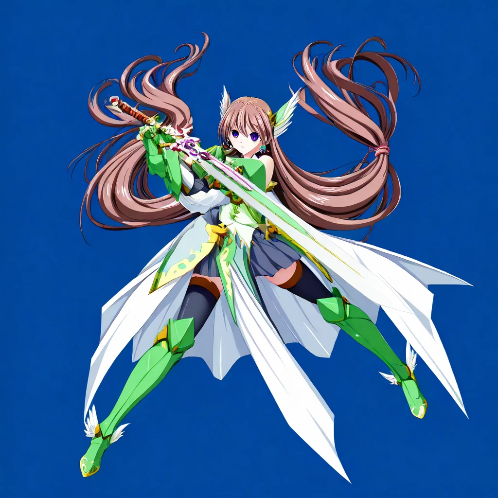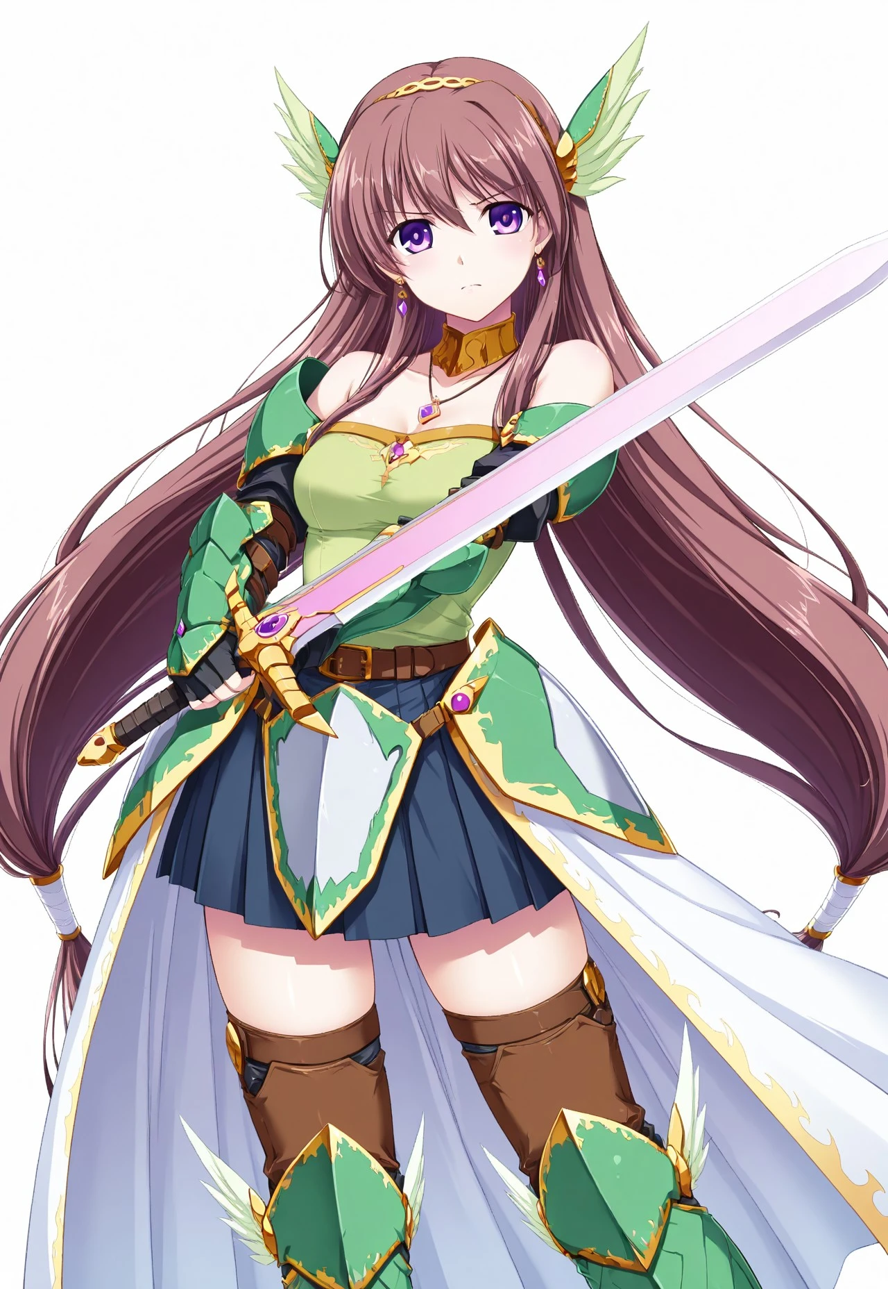 Normal form (adjust by putting of what doesn't suit you) : hair tie,pendant earrings,winged hair ornament,pleated skirt,sabaton,spaulders,golden hairband,thigh high stockings,green winged knight boots, white waist cape,green tank top with motives