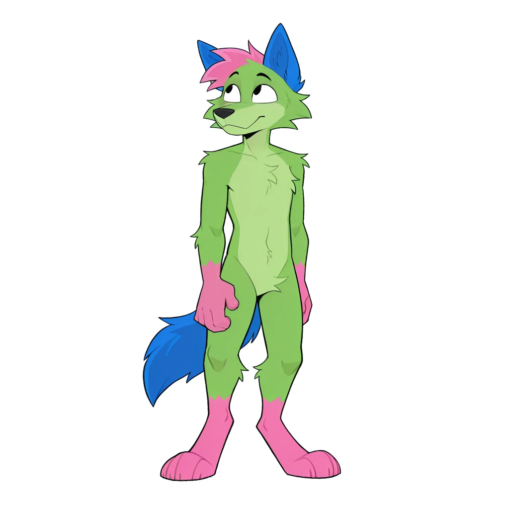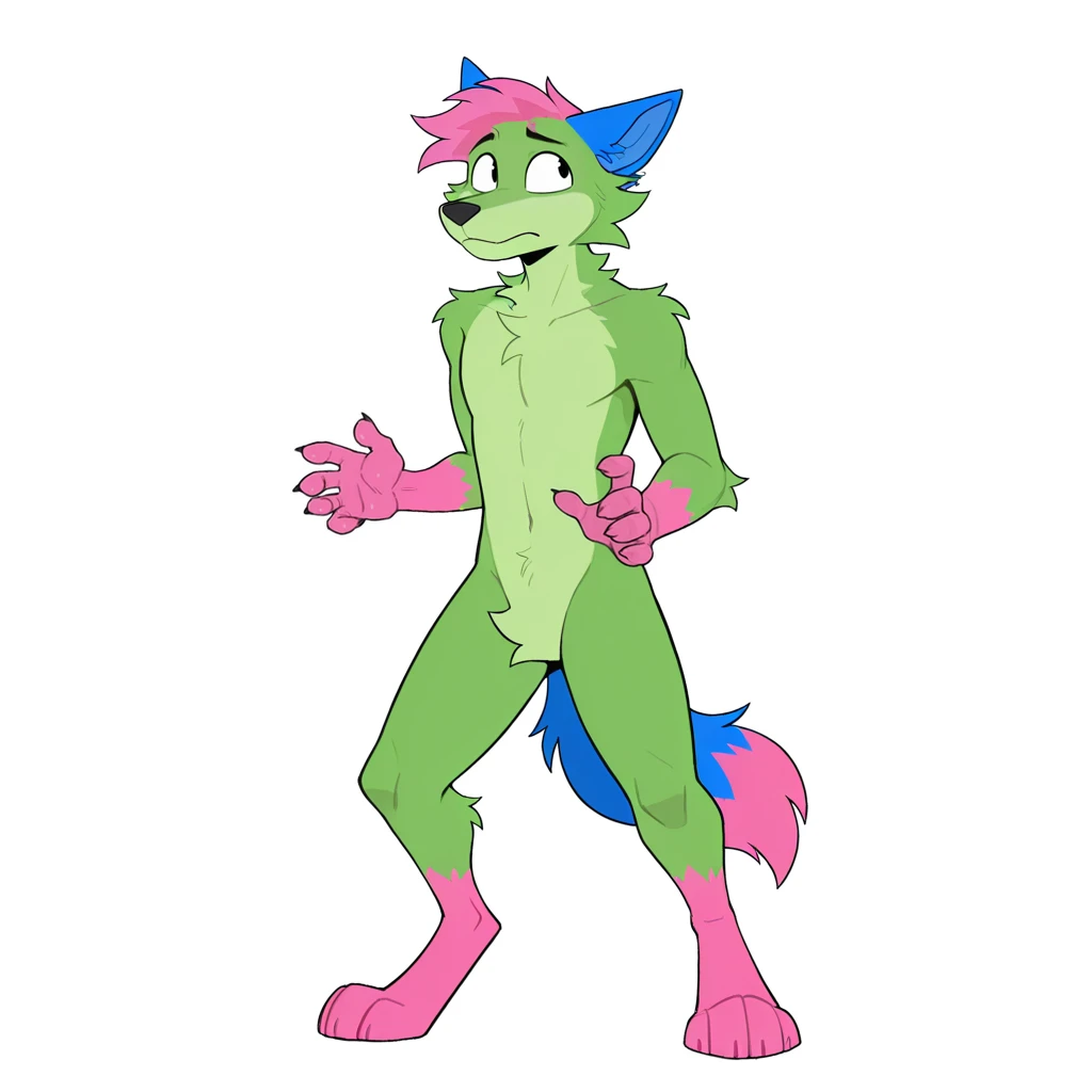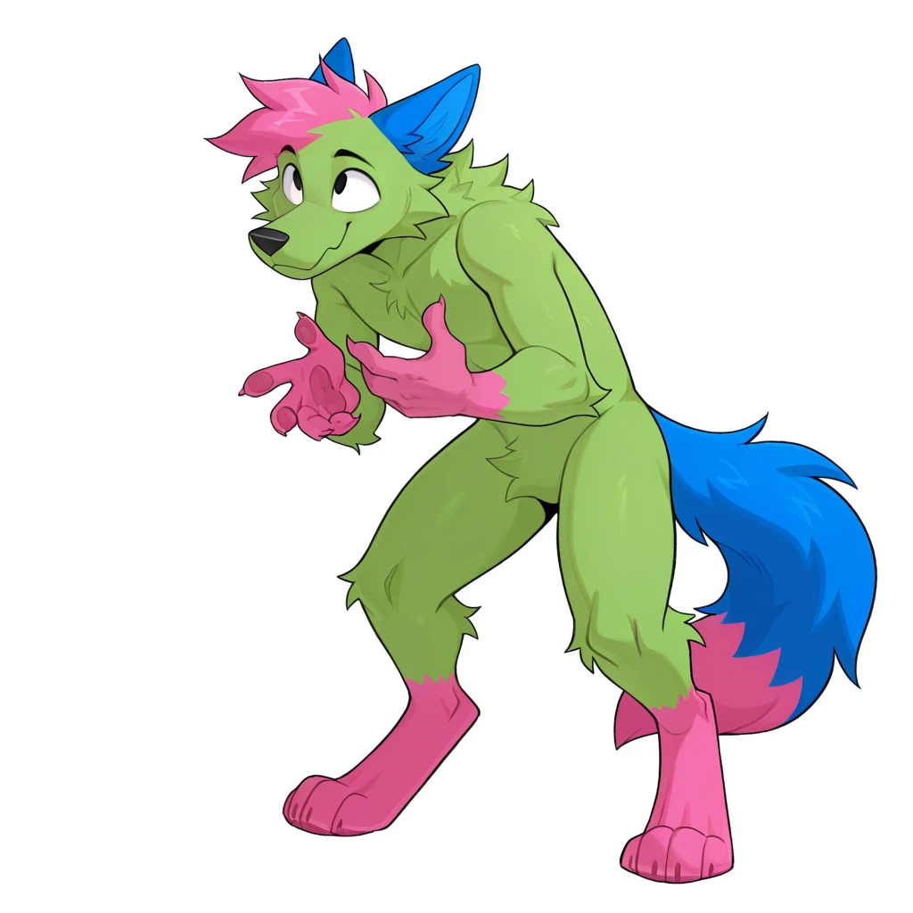 donttouchmypizza, kevin (nyanwolf), canine, green body, pink head tuft, blue ears, black eyes, pink hands, paws, pink feet, pink tail tip, blue tail
