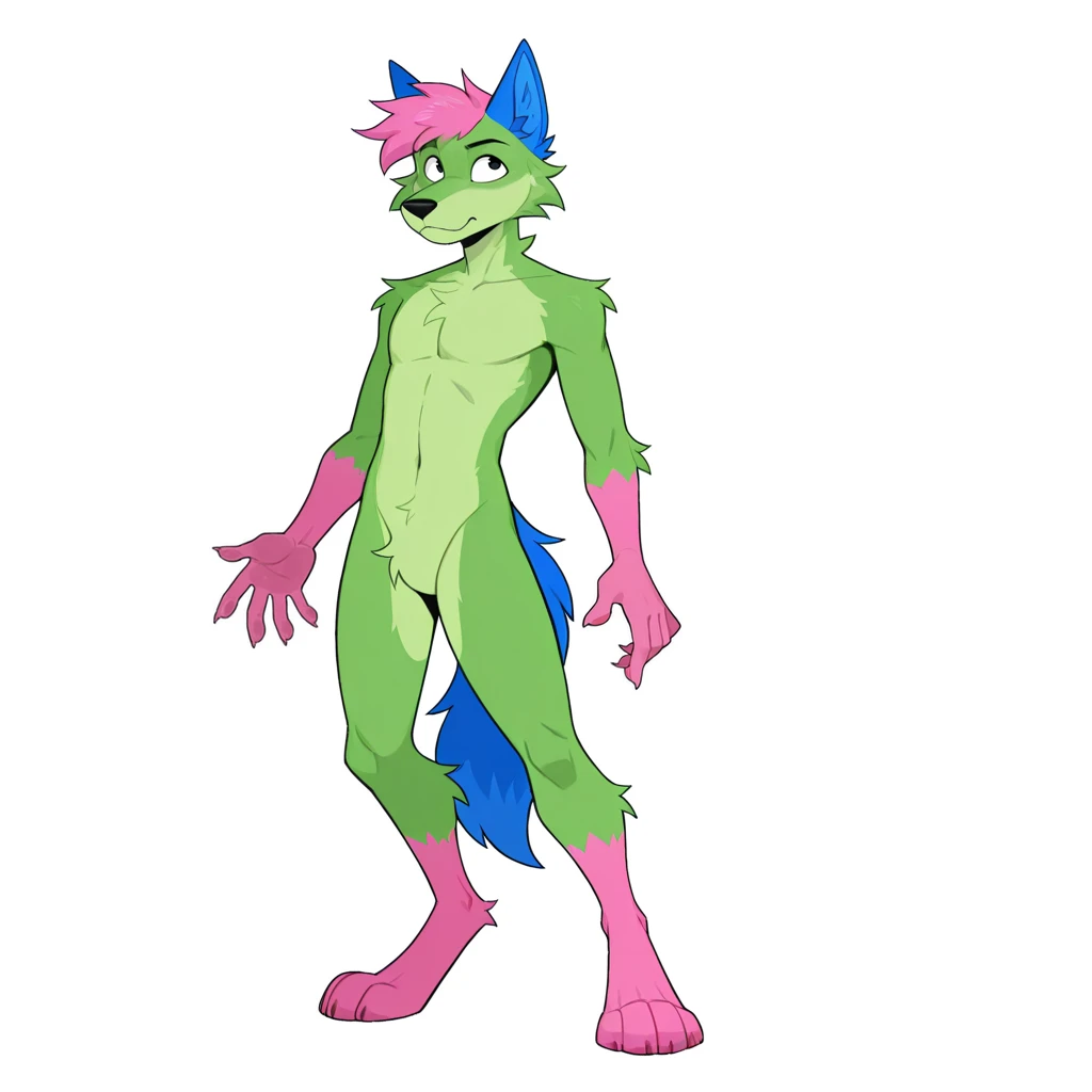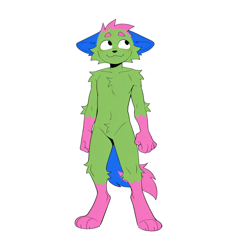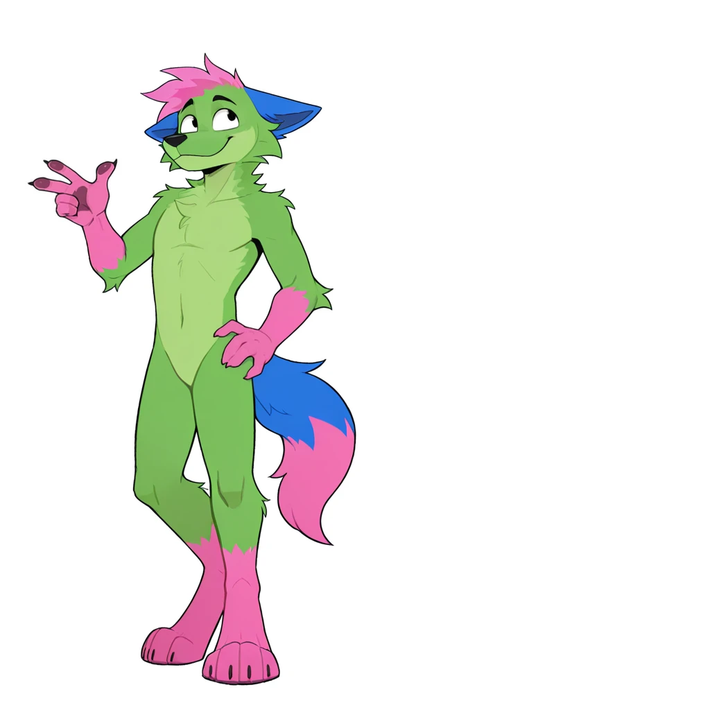 donttouchmypizza, kevin (nyanwolf), canine, green body, pink head tuft, blue ears, black eyes, pink hands, paws, pink feet, pink tail tip, blue tail