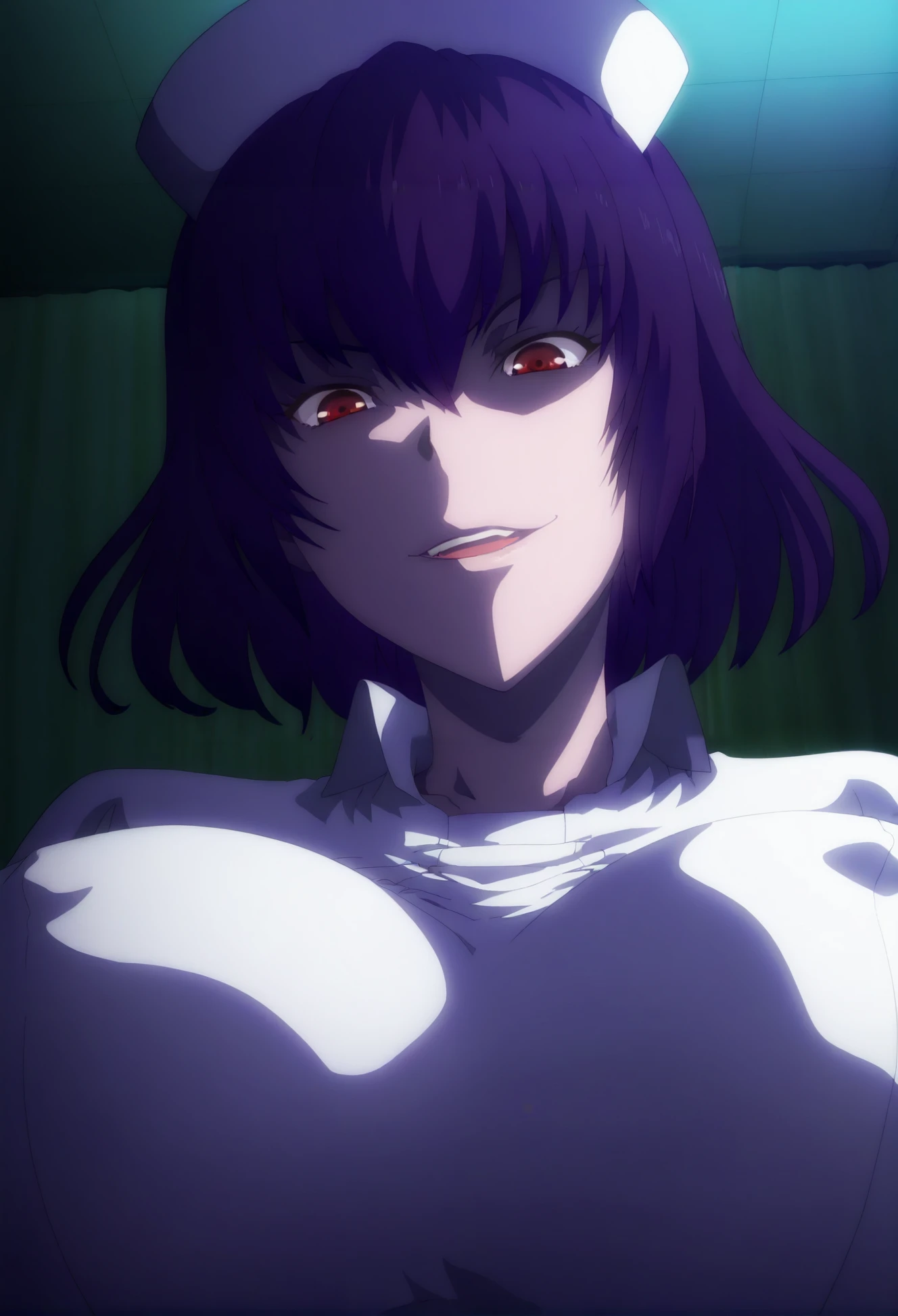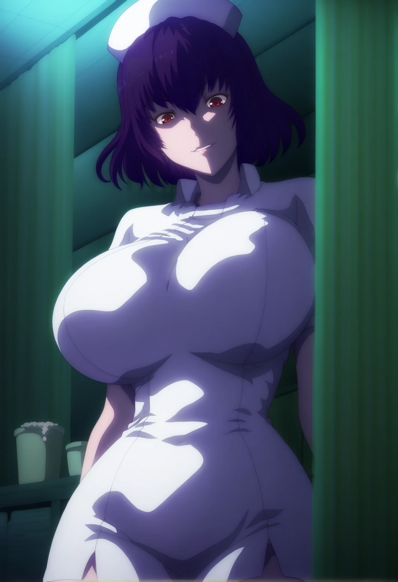 Kurokawa,1girl,solo,purple hair,red eyes,nurse cap,nurse,short hair,huge breasts,
