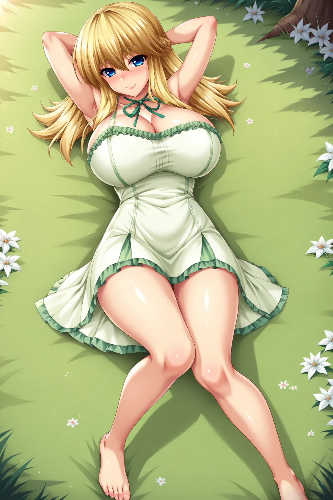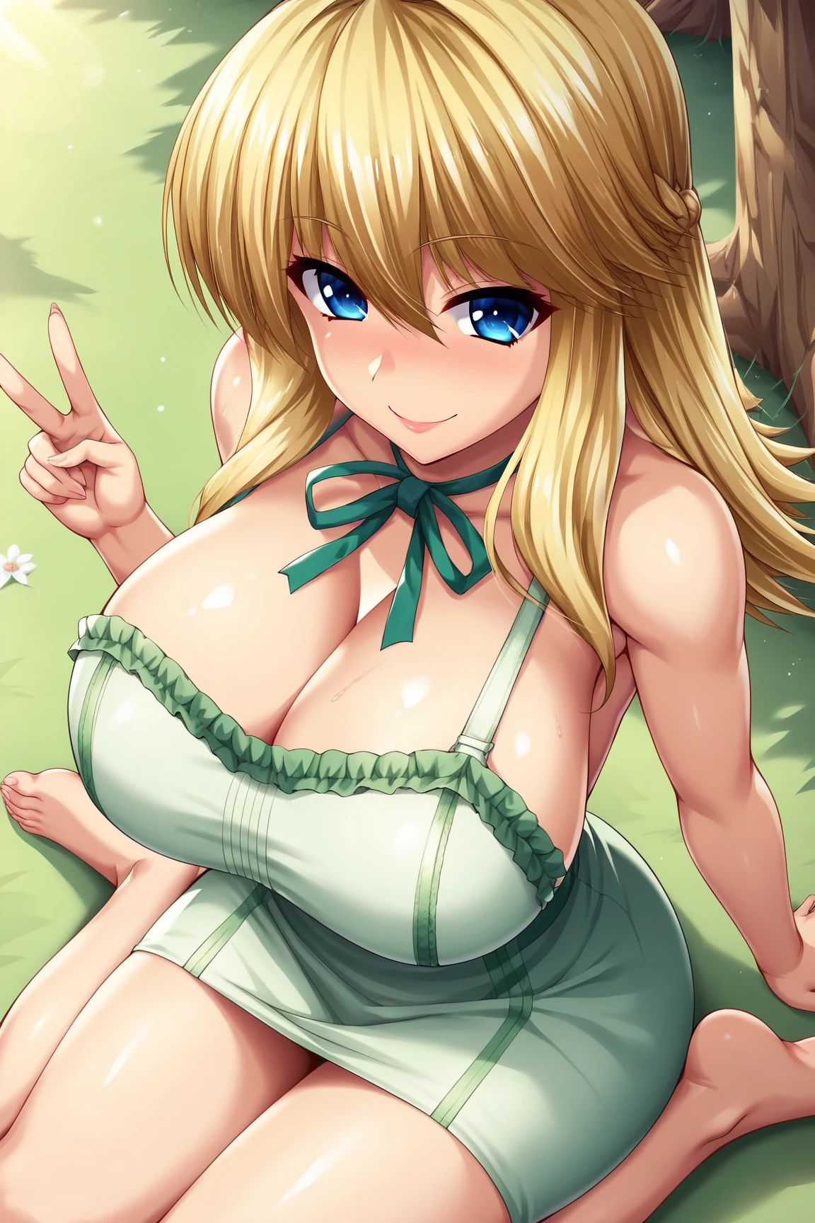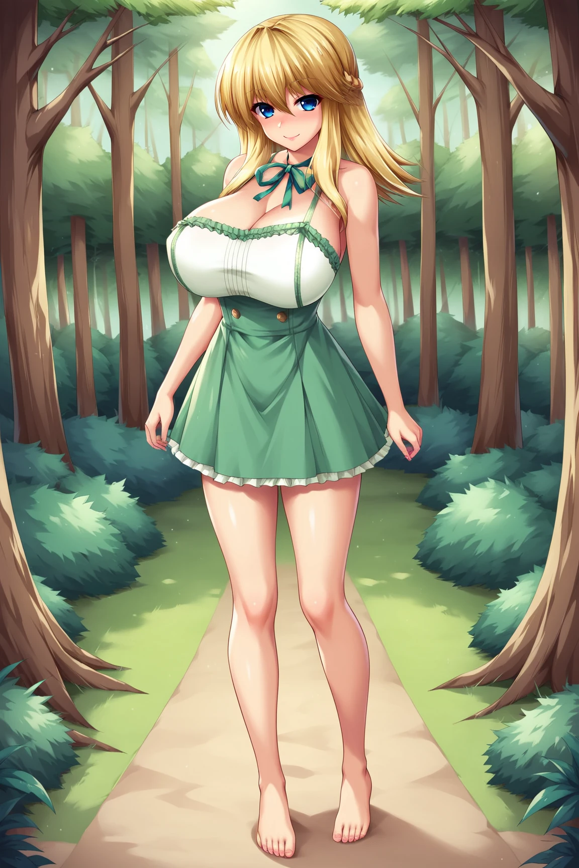 ManatsuEnoshimaSRPXL, blue eyes, blonde hair, long hair, hair between eyes, bangs, braid, huge breasts, green ribbon, bare shoulders, cleavage, green dress, green skirt, barefoot