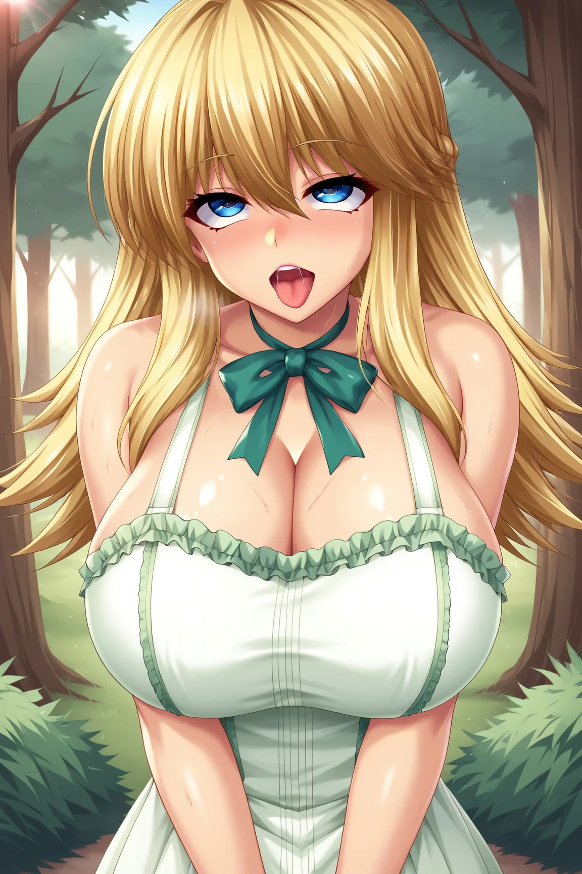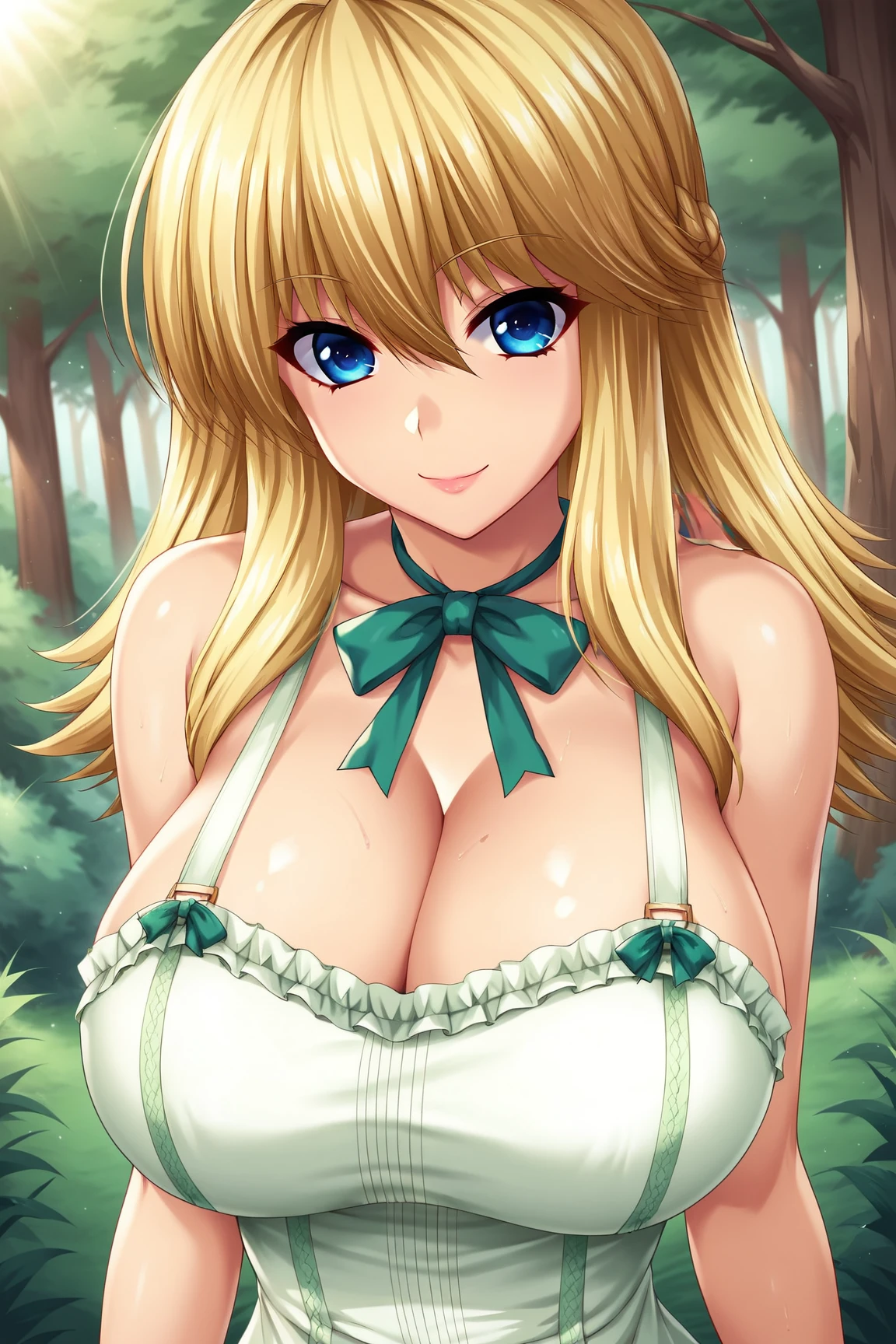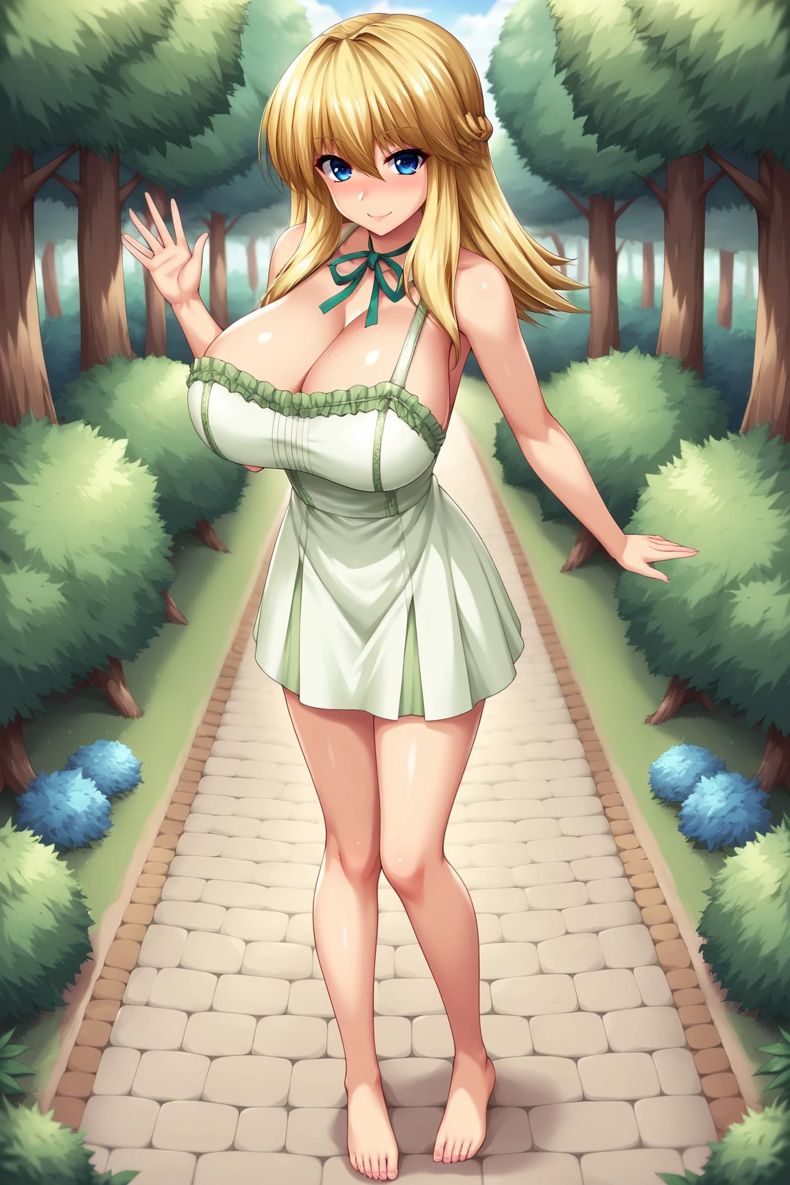 ManatsuEnoshimaSRPXL, blue eyes, blonde hair, long hair, hair between eyes, bangs, braid, huge breasts, green ribbon, bare shoulders, cleavage, green dress, green skirt, barefoot