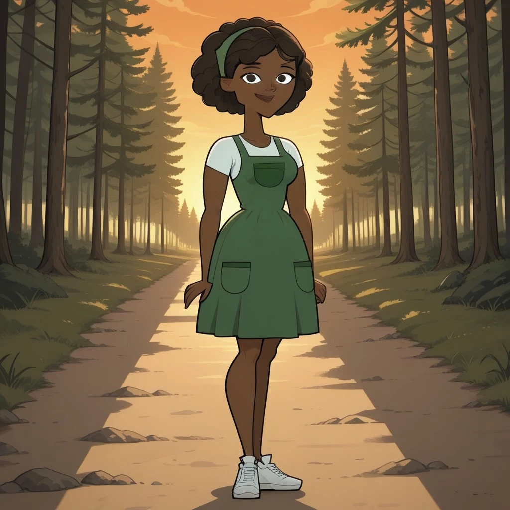 MilkOC, 1girl, dark skin, dark-skinned female, dark brown hair, green hairband, black eyes, lips, white shirt, green jumper dress with pocket, white sneakers
