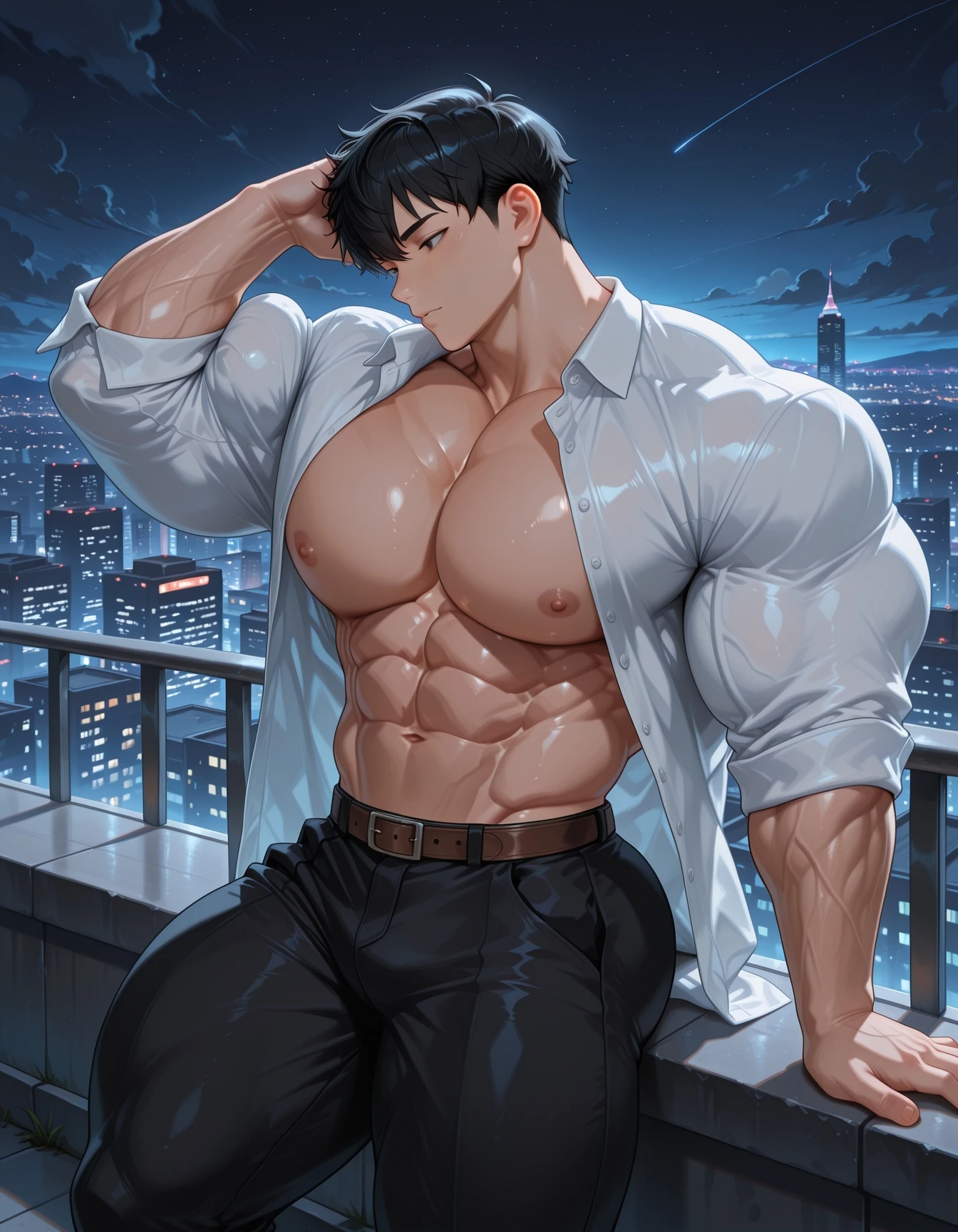 masterpiece, best quality, absurdres, highres, very aesthetic, high quality, detailed, insanely detailed, beautiful, very awa, muscular male, male focus, biceps, pectoralsNegative: