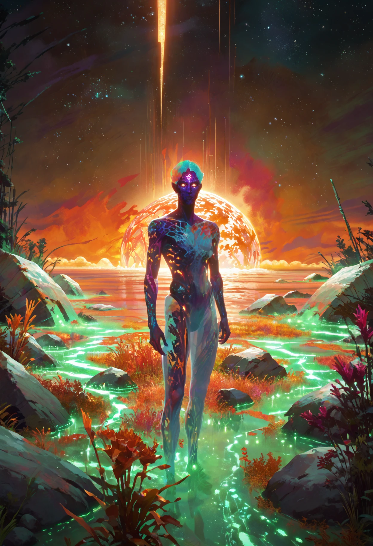 If you want the glowing style from that astral plane or whatever Viktor was in use this additional prompt: surreal, abstract, glowing, neon, glowing eyes, space, astral, space, stars, colored skin, see-through body, glowing hair, glowing skin,