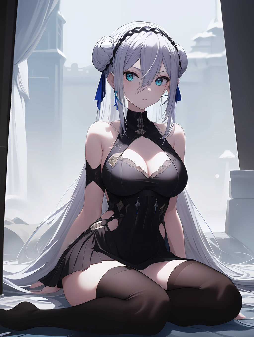 Basic Tags: victoriabrightshield, medium breasts, white hair, bangs, straight hair, long hair, , aqua eyes, hair between eyes, double bun, hair bun, black headband, blue hair ribbon,