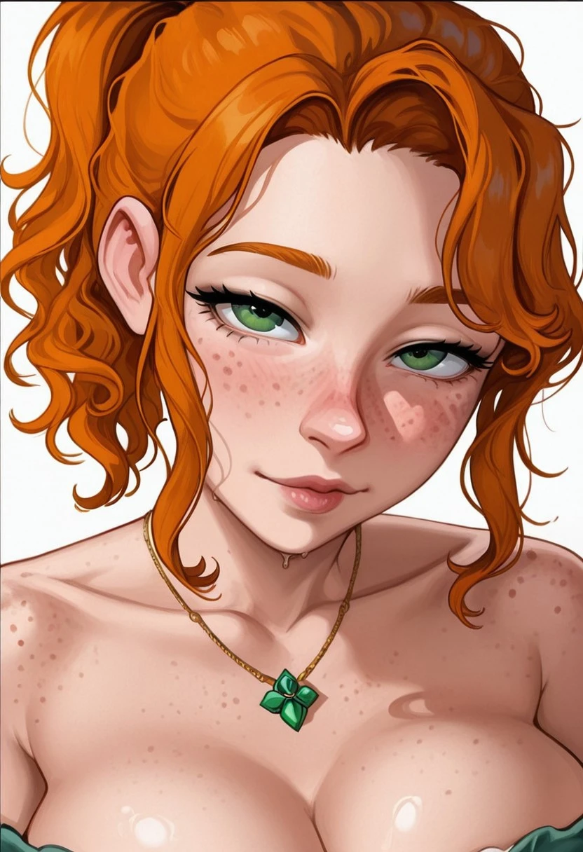 Robin_sdv, green eyes, freckles, blush, lips, orange hair, ponytail, necklace, large breasts,
