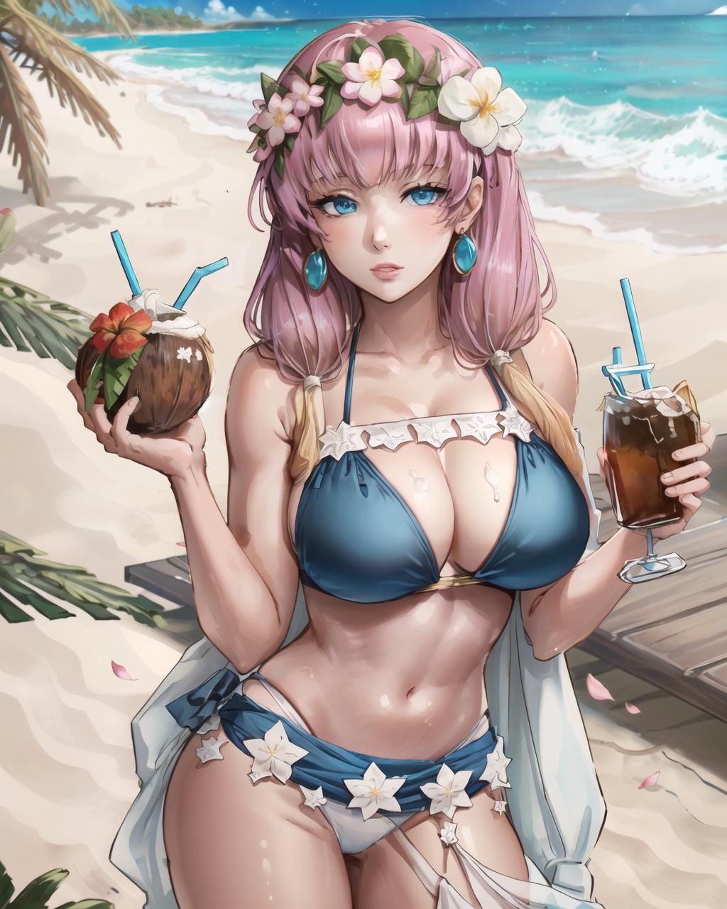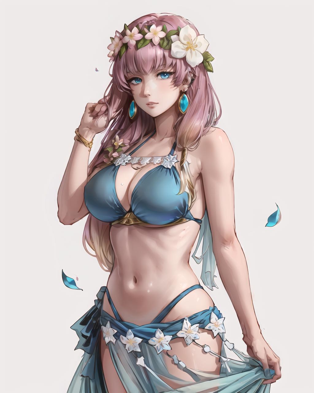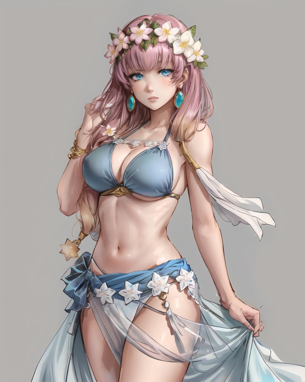 For summer alt use gunnthrasummer, jewelry, swimsuit, flower, earrings, petals, blue bikini, head wreath, sarong. Add holdind coconut, drinking straw for further resemblance