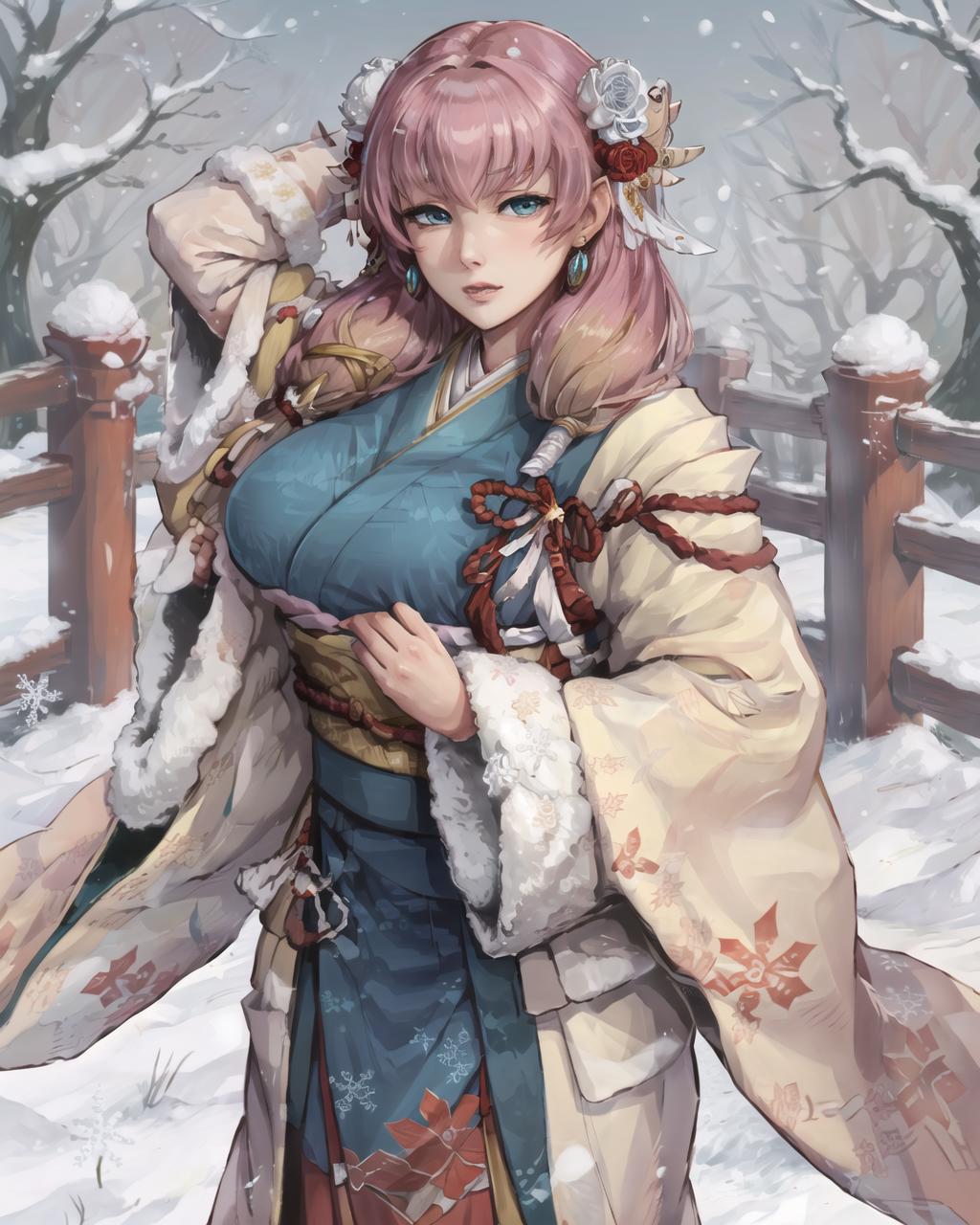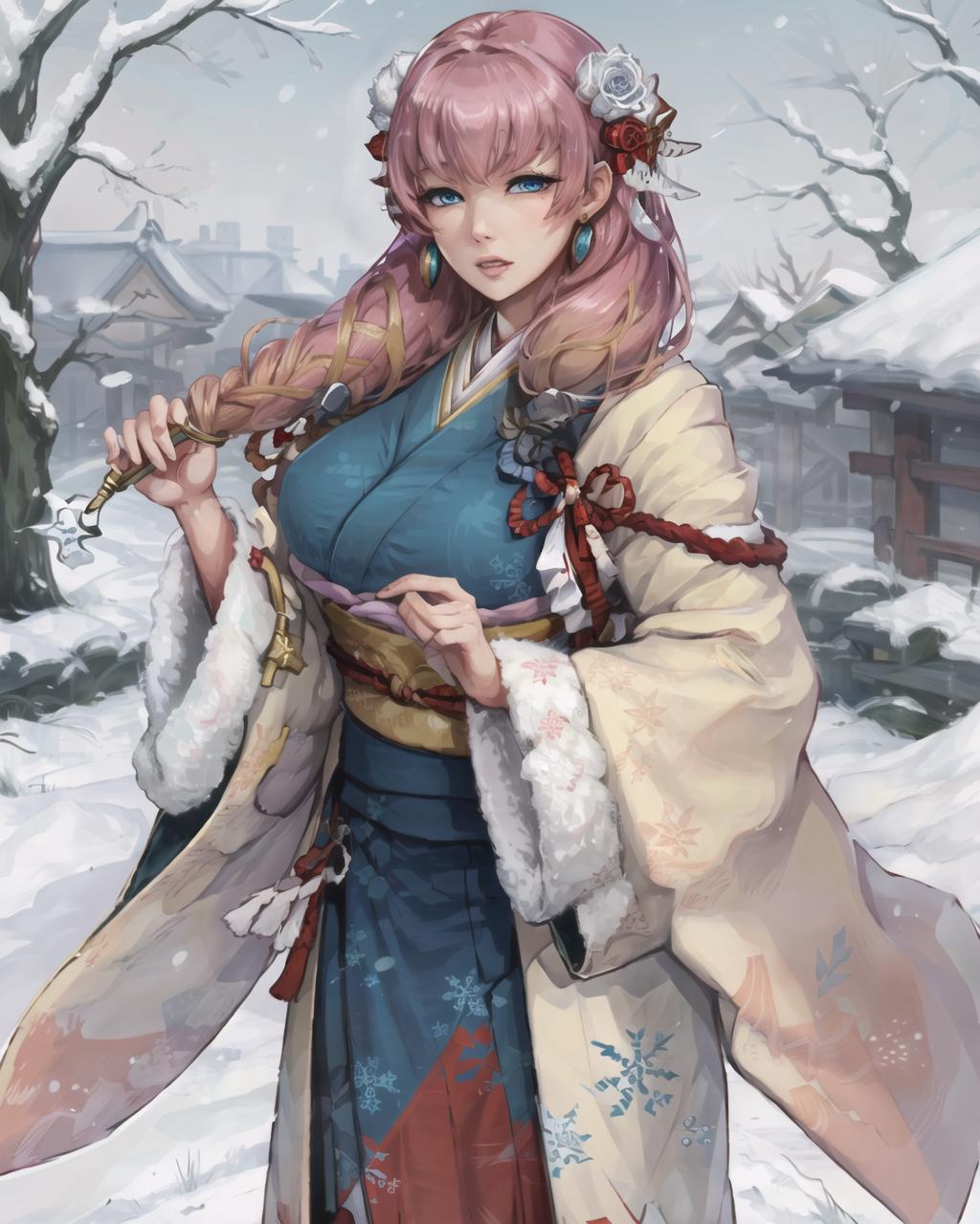 For winter alt use gunnthrawinter, long sleeves, jewelry, flower, earrings, japanese clothes, wide sleeves, sash, fur trim, obi, blue kimono, snowflake print. you can add holding sword