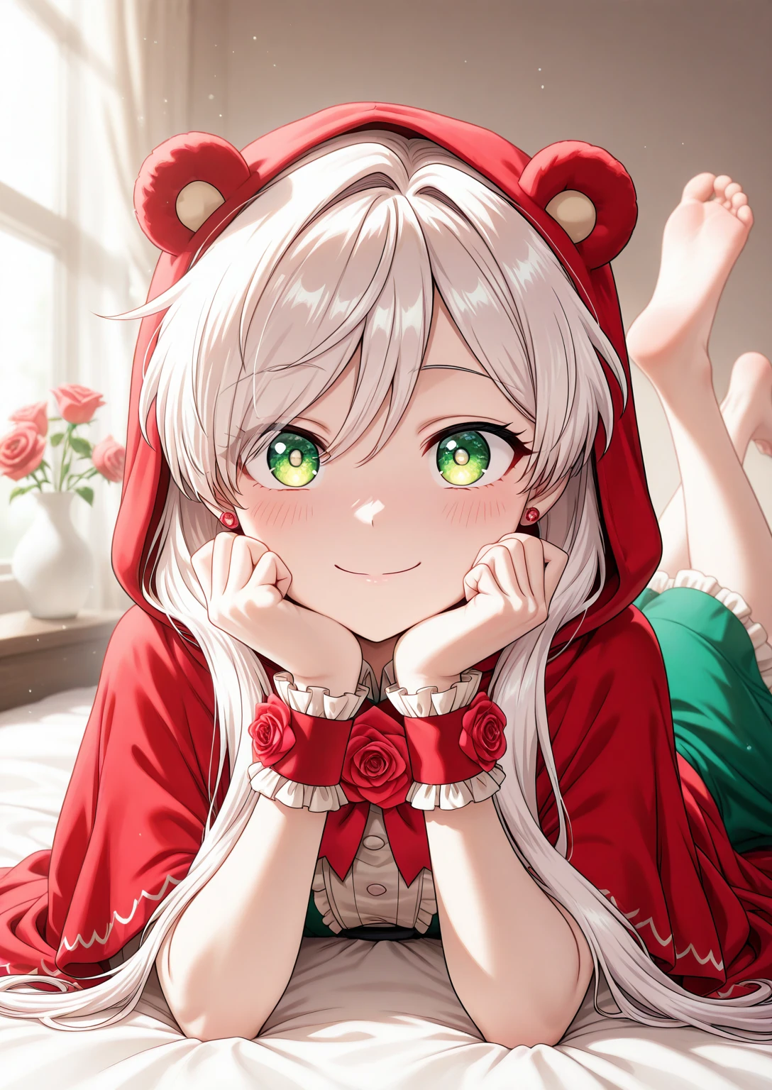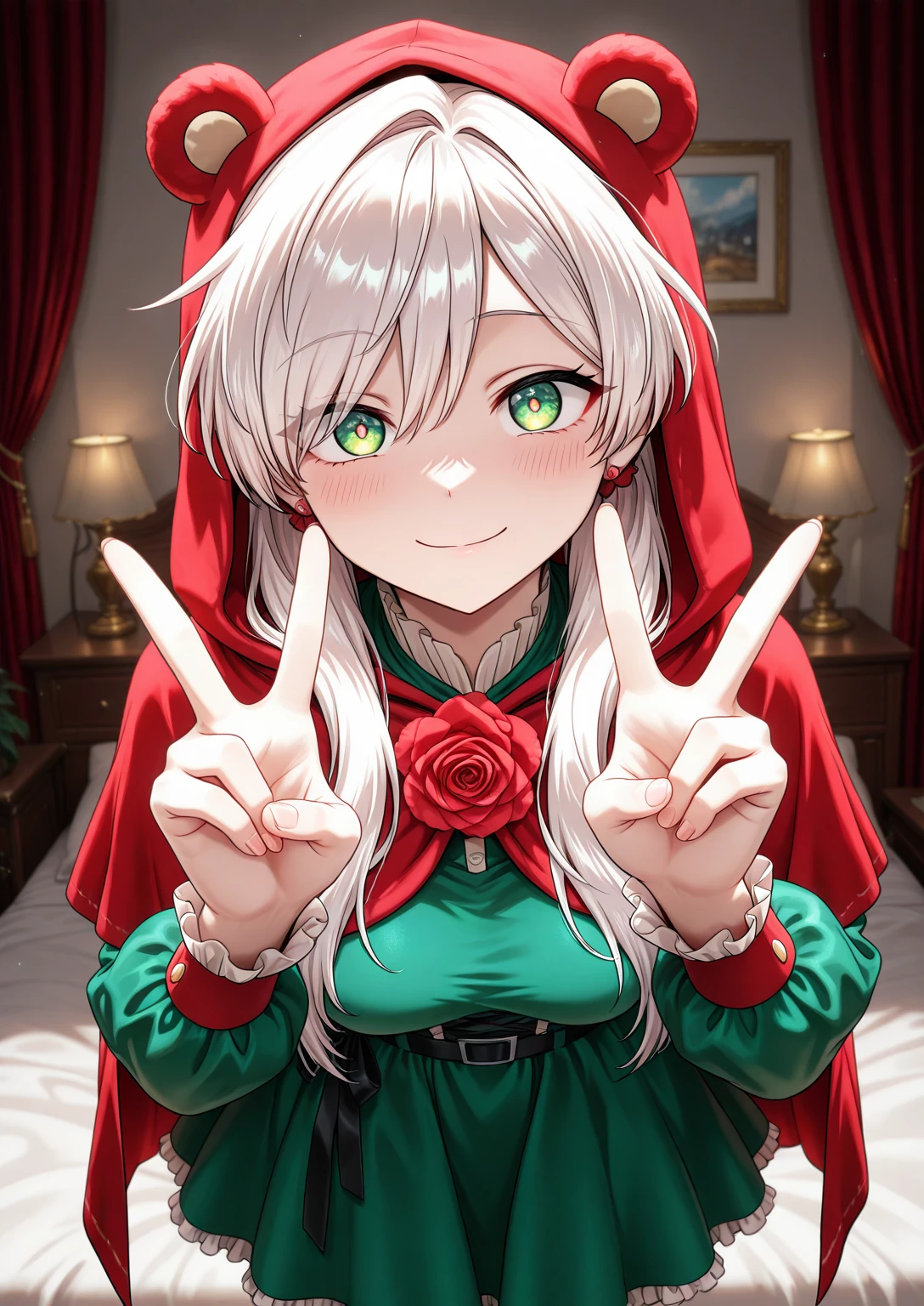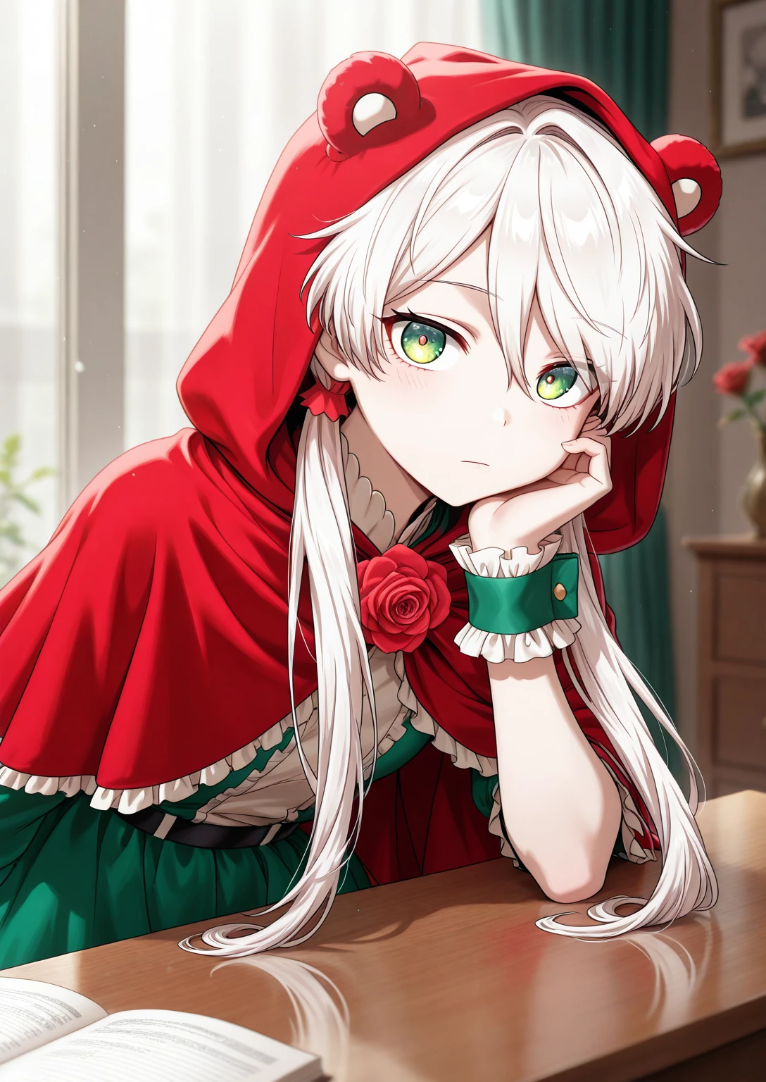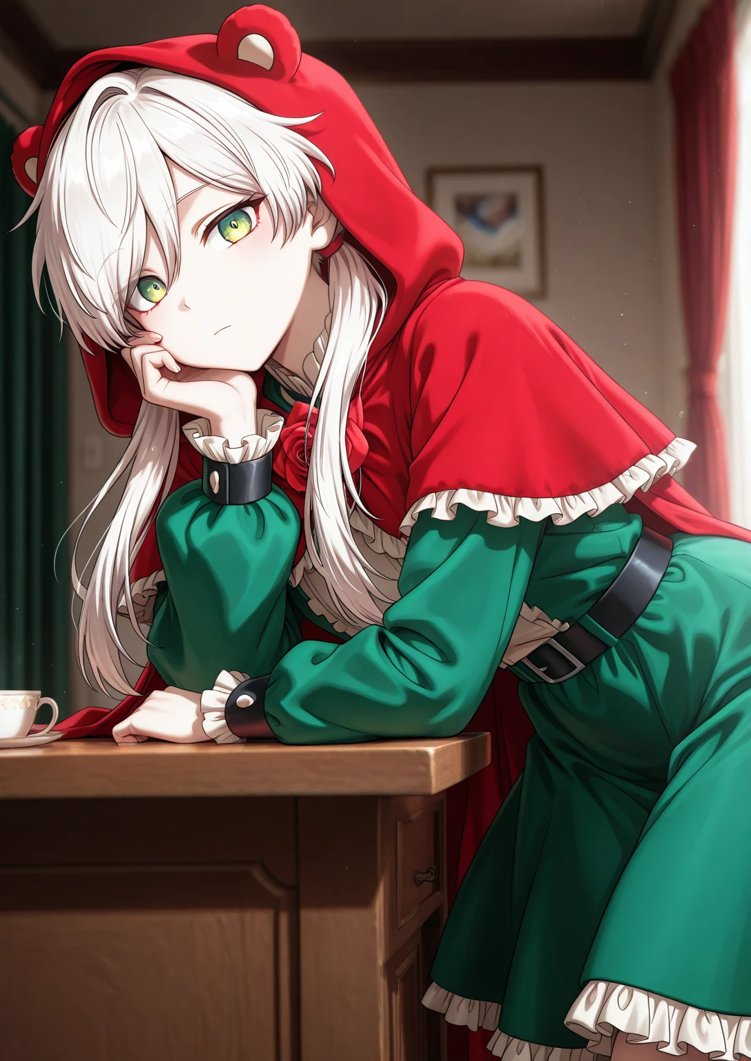 Isabel, green eyes, long hair, white hair, twin side locks, (red сloak:1.2), hood up, bear ears сloak, hooded cloak, rose brooch, green dress, frilled cuffs, layered skirt