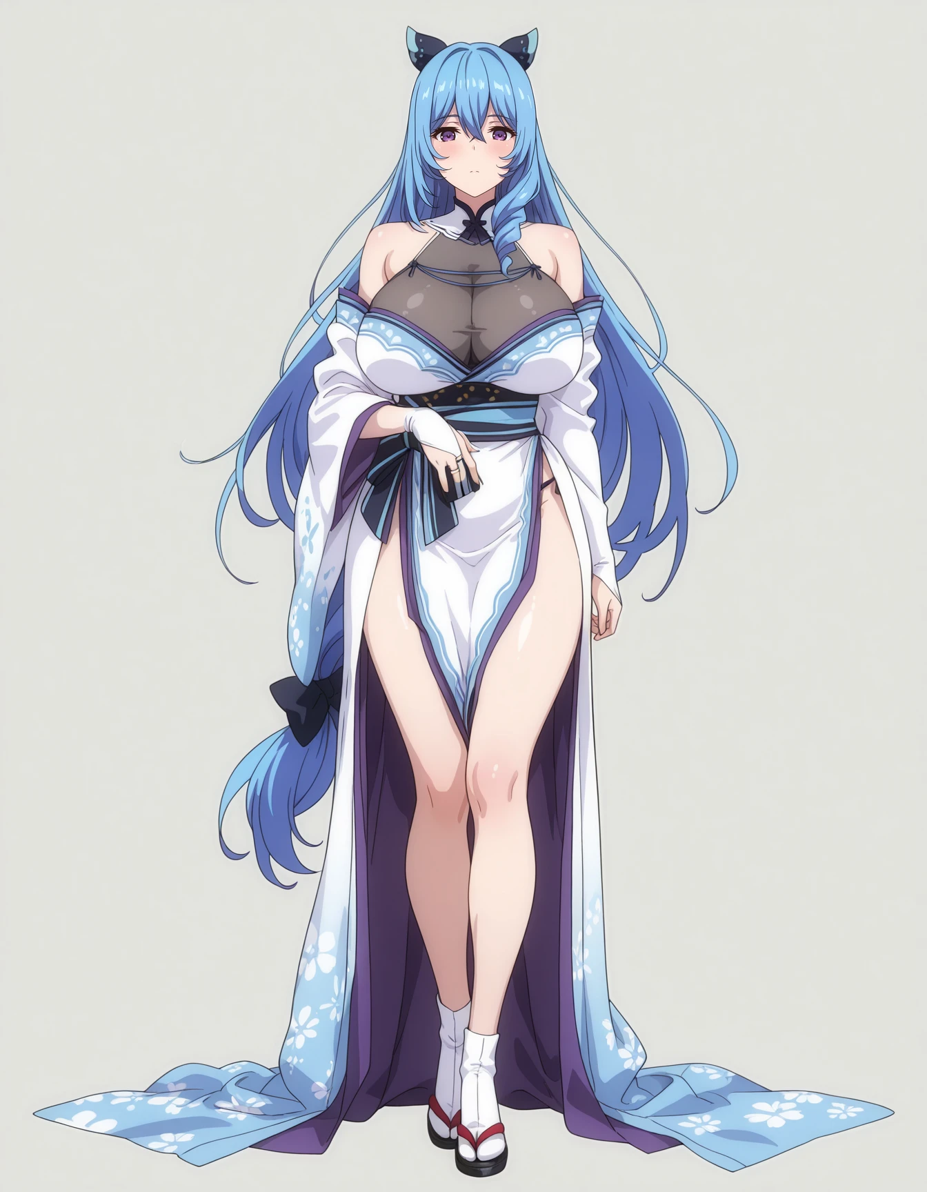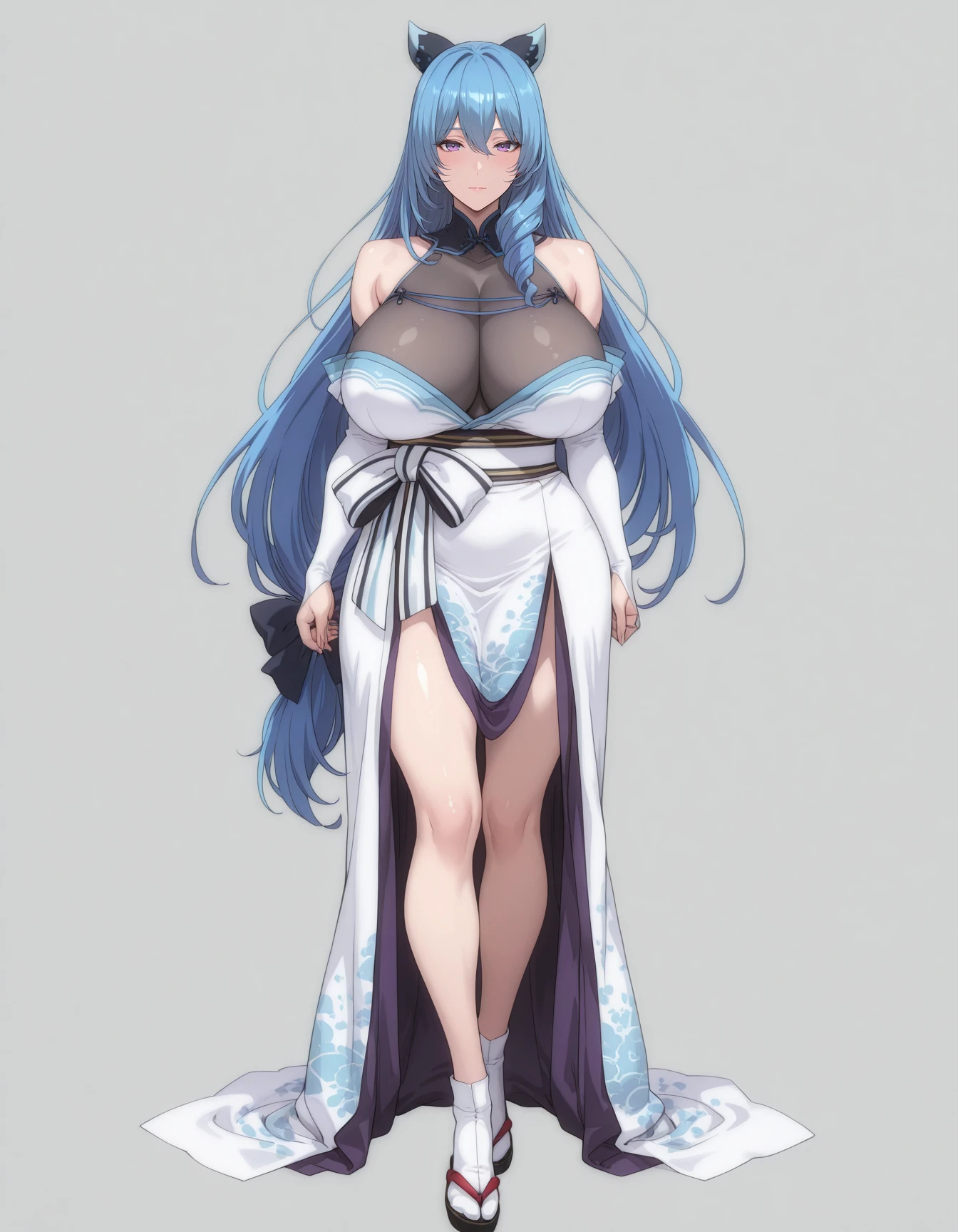 mai_mamamai,mature_female,very_long_hair,blue_hair,purple_eyes,large_breasts,hair_bow,japanese_clothes,see-through,bridal_gauntlets,tabi,zouriRecommend preferred Strength: 0.7~1.
