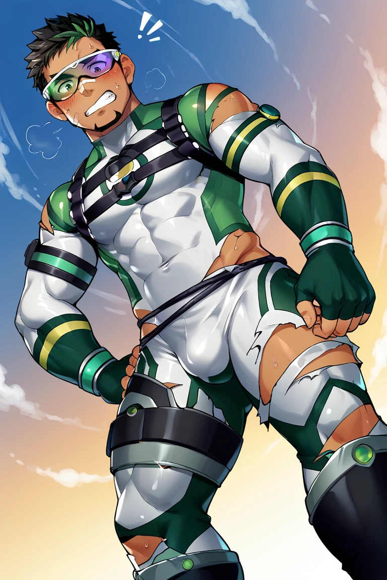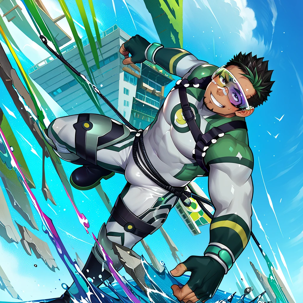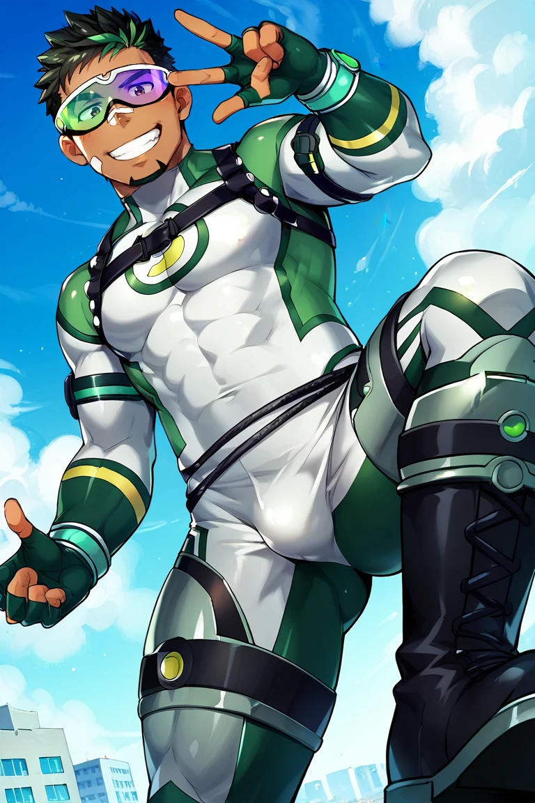 LAHKyoichi_outfit01, Kyoichi hero bodysuit, Element Teacher bodysuit, greybodysuit, three-tone bodysuit, grey/green/black bodysuit, multicolor bodysuit, eye visor, green-purple eye visor, fingerless gloves, black chest harness, jump rope around waist, thighs armor, legs armor, black boots