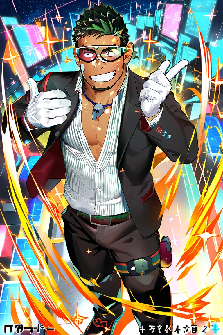 LAHKyoichi_outfit04, pink eye visor, Active Agent Kyoichi, formal wear, vertical stripe collared shirt, white/green striped shirt, partially unbuttoned shirt, whistle around neck, black blazer, open blazer, white gloves, black pants, thigh strap, black shoes