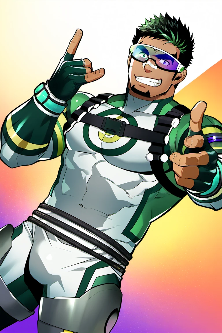 Prompt: short hair, black hair, green streaked hair, sideburns, black eyes, goatee, tan skin, white bandaid on nose