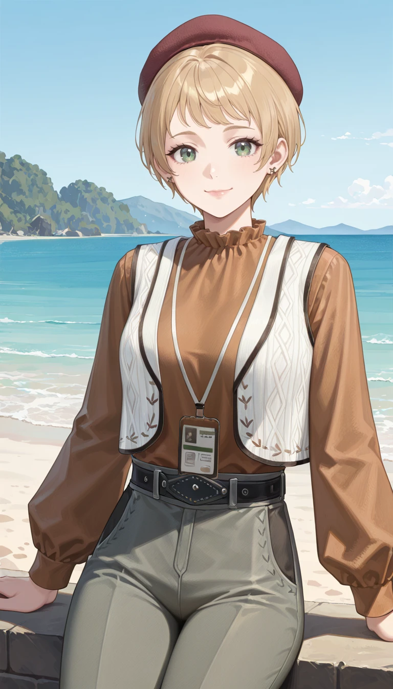Outfit: earrings, beret, id card, shirt, puffy long sleeves, sleeveless jacket, open jacket, belt, pants, dark brown footwear
