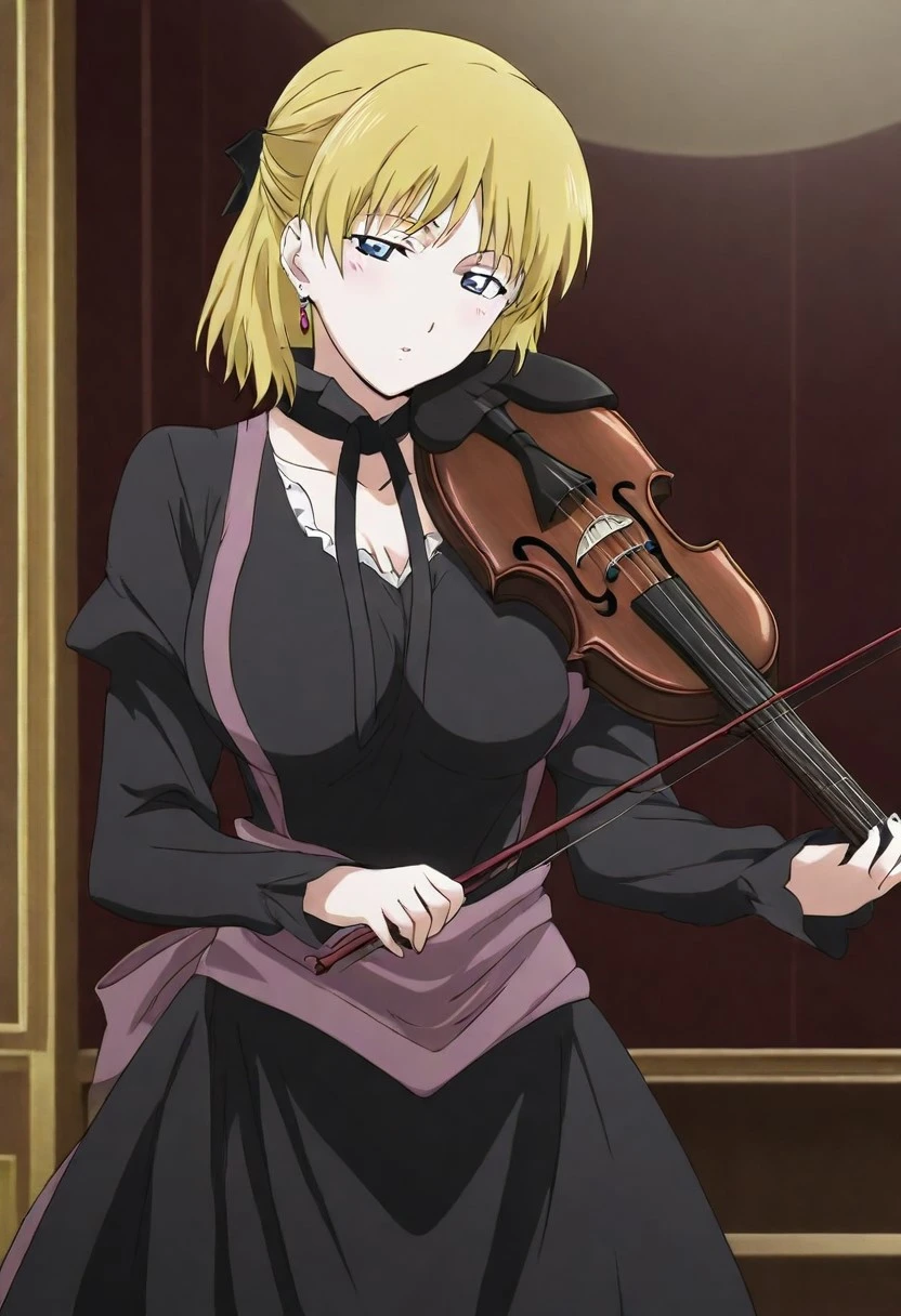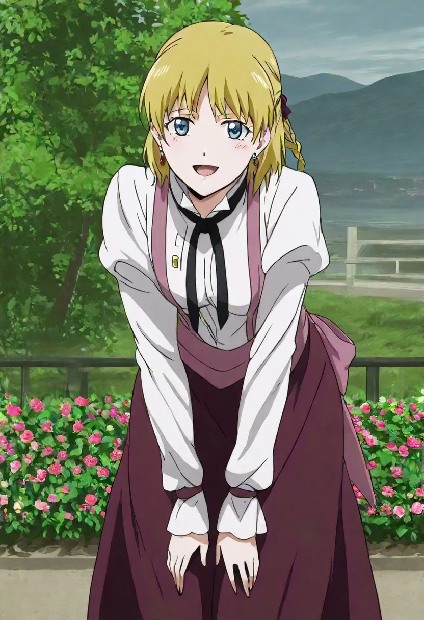 1girl, solo, LedaBB, blonde hair, blue eyes, hair between eyes, tied hair, short hair, little braid hair, earrings, white shirt, long sheeves, long skirt, pink sash, boots