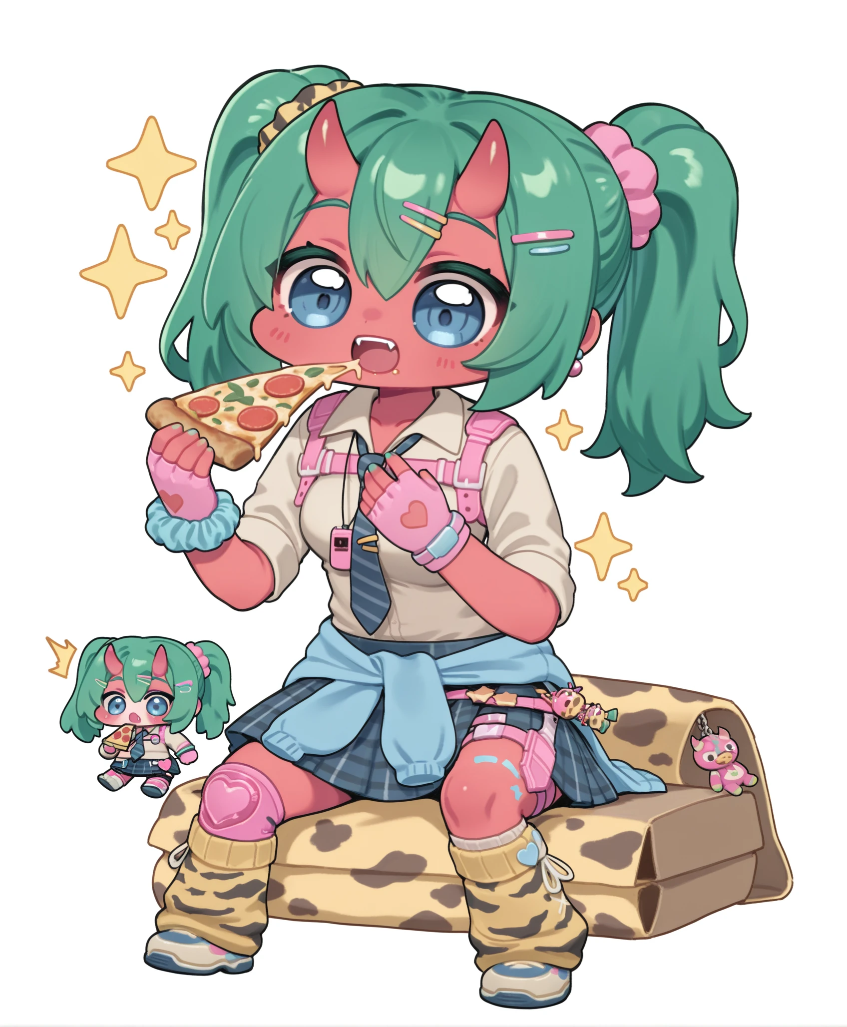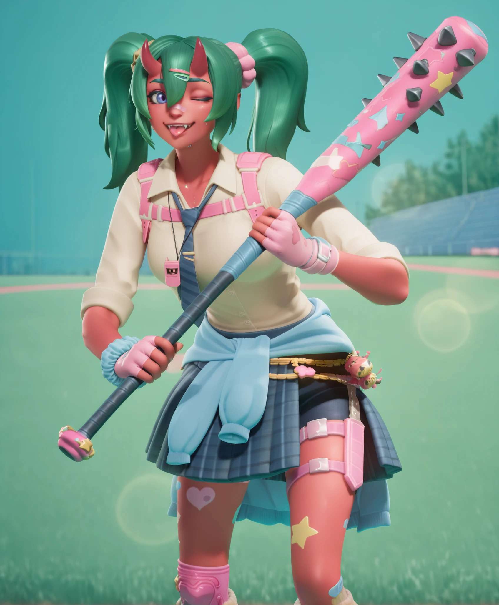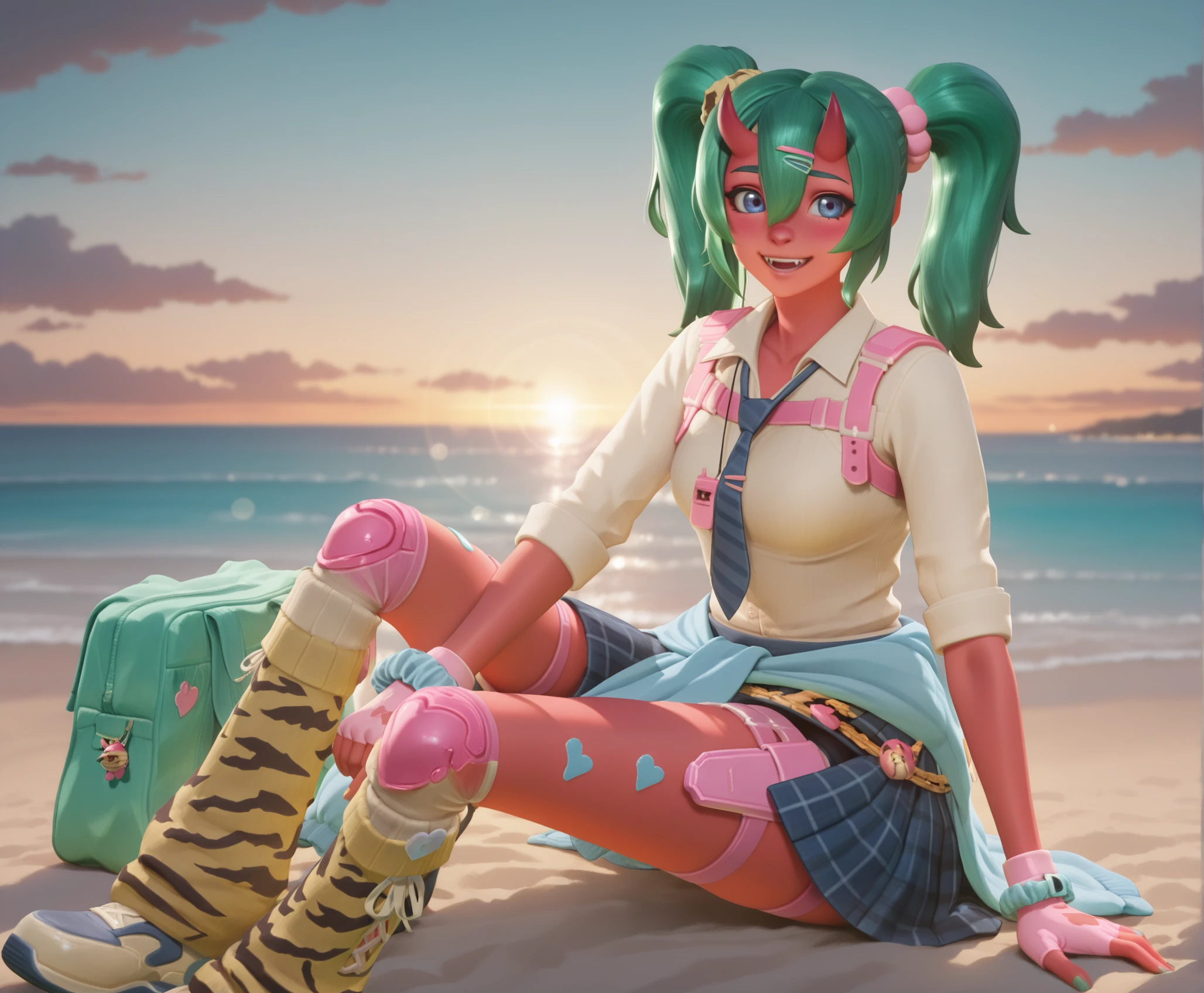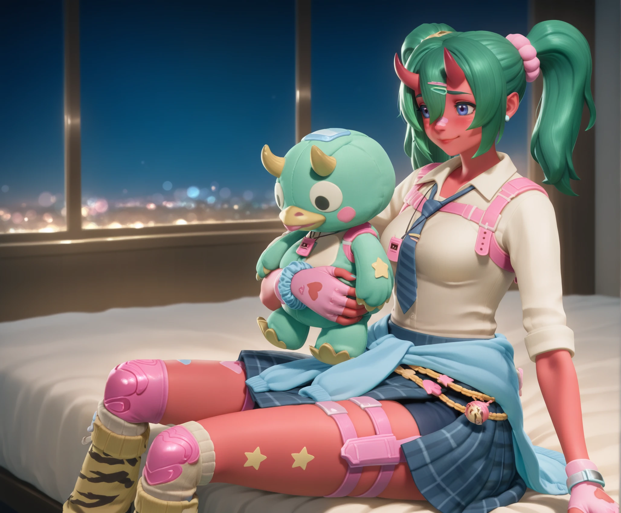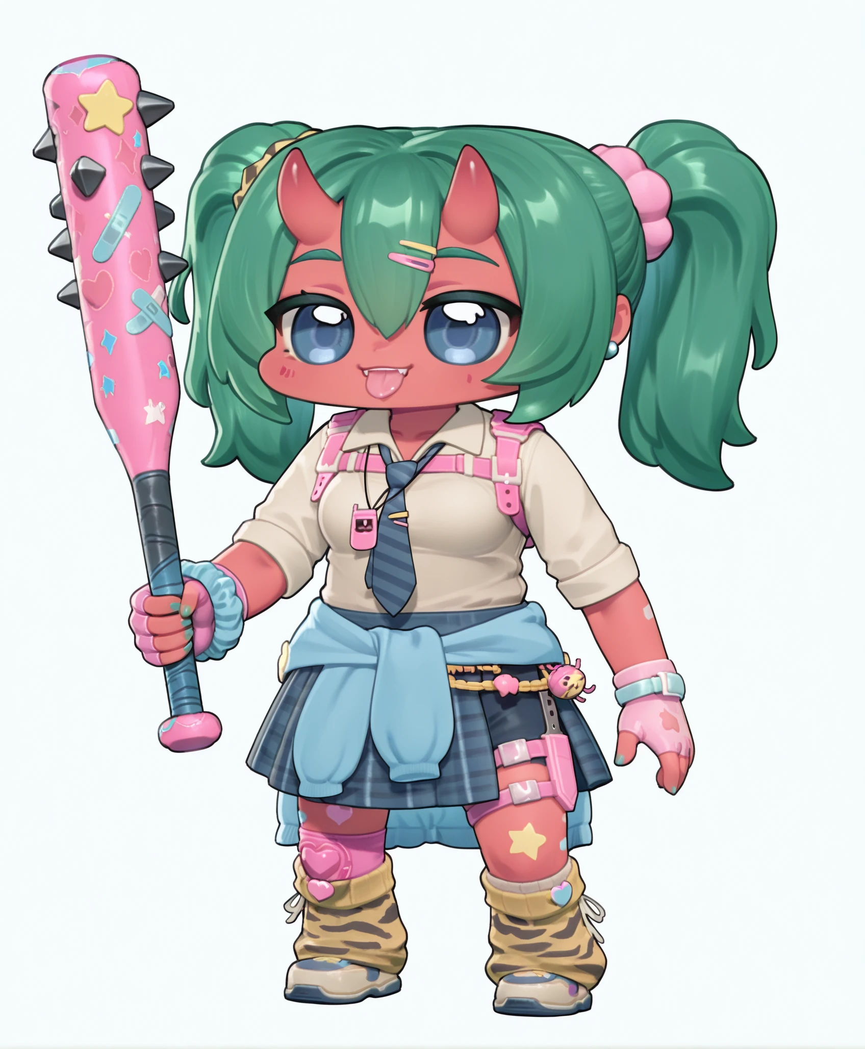 fortnite_nemia_lego, 1girl, solo, green hair, twintails, ponytail, long hair, bangs, hair between eyes, hair over one eye, ears, horns, oni horns, single horn, red skin, pink skin, blue eyes, parted lips, bandaid, bandaid on nose, bandaid on thighs, breasts, shirt, school uniform, necktie, plaid skirt, thighhighs, socks, loose socks, boots, jewelry, earrings, bracelet, charm, belt, gloves, fingerless gloves, knee pads, leg warmers, collarbone, solo, colored skin, hair ornament, hairclip, scrunchie, holster, striped necktie, clothes around waist, oni, plaid, charm (object), blue necktie, sweater around waist, animal print, heart, shoes, star (symbol), thigh holster