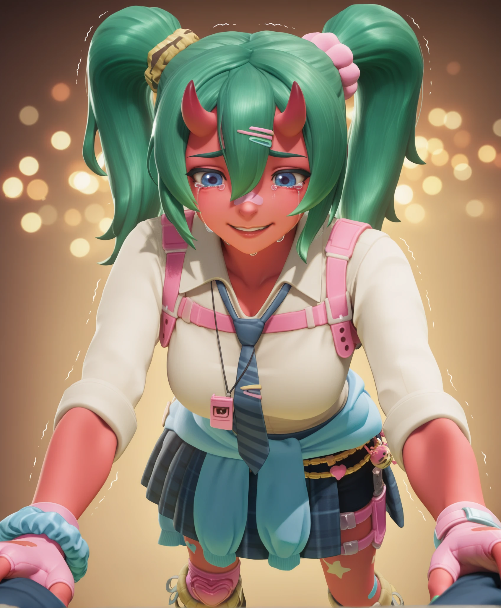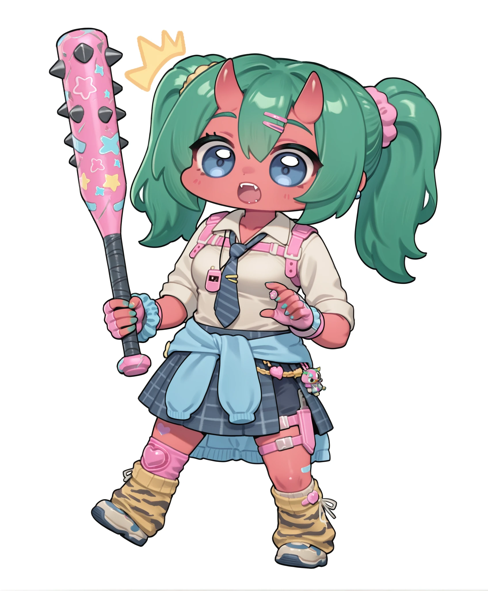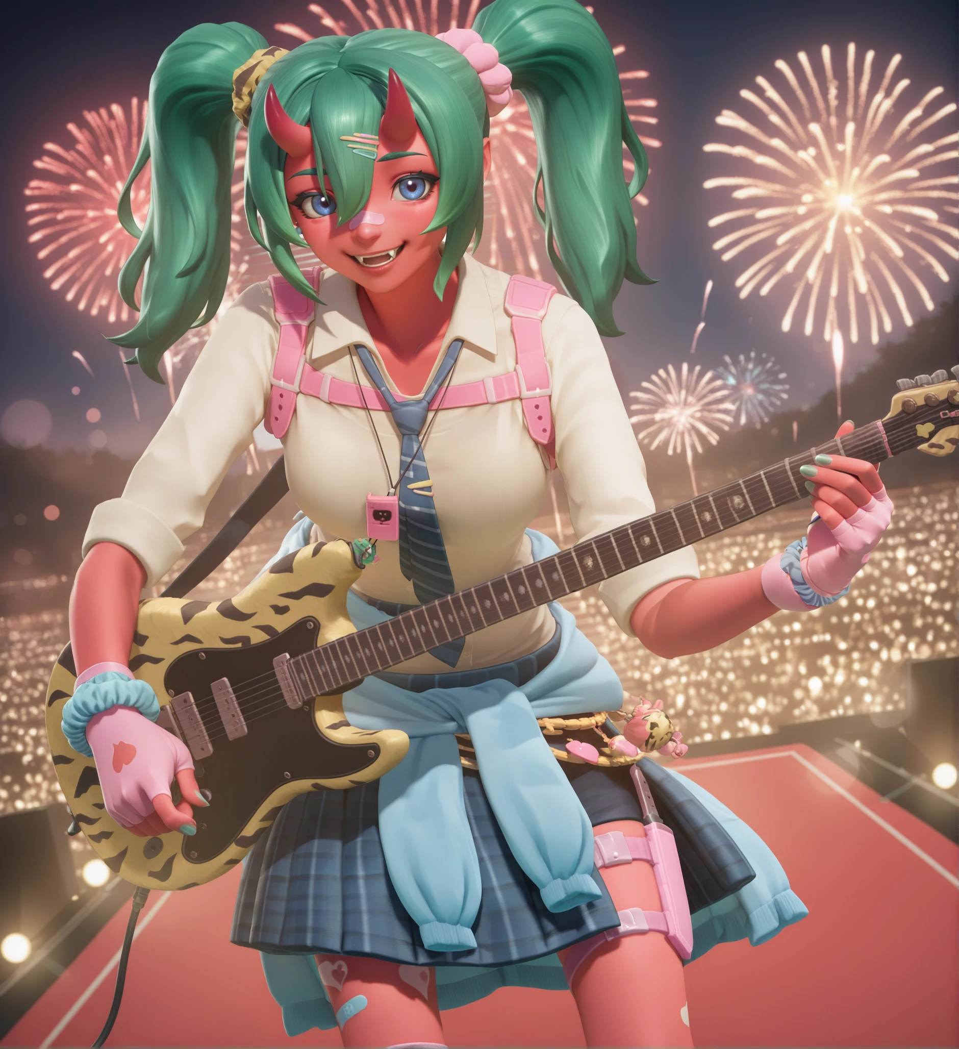 fortnite_nemia, 1girl, solo, green hair, twintails, ponytail, long hair, bangs, hair between eyes, hair over one eye, ears, horns, oni horns, single horn, red skin, pink skin, blue eyes, parted lips, bandaid, bandaid on nose, bandaid on thighs, breasts, shirt, school uniform, necktie, plaid skirt, thighhighs, socks, loose socks, boots, jewelry, earrings, bracelet, charm, belt, gloves, fingerless gloves, knee pads, leg warmers, collarbone, solo, colored skin, hair ornament, hairclip, scrunchie, holster, striped necktie, clothes around waist, oni, plaid, charm (object), blue necktie, sweater around waist, animal print, heart, shoes, star (symbol), thigh holster