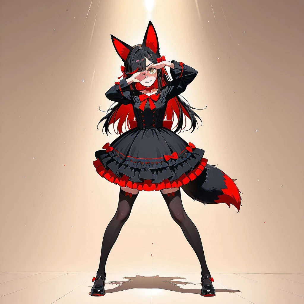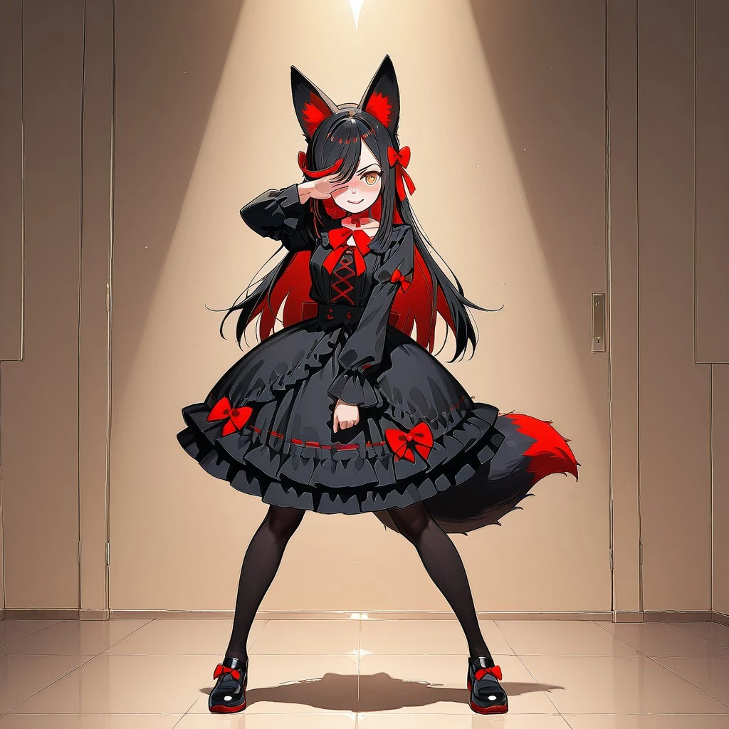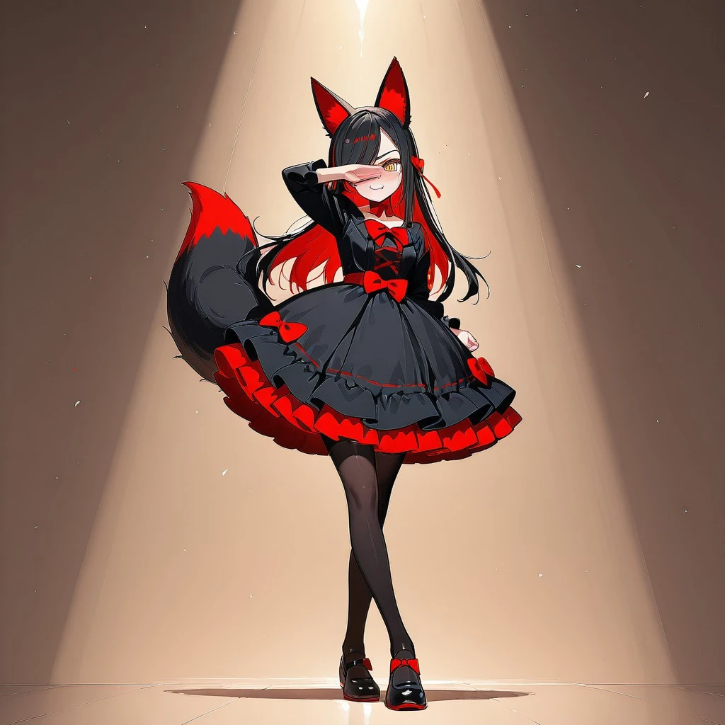 A gothic foxgirl with a striking red and black color palette. She wears a frilly gothic lolita dress adorned with red bows and intricate lace. Her long black hair features red highlights, matching her vivid red fox ears (with red inner fur) and fluffy fox tail with a red tip. Golden eyes, a confident or mysterious expression, and elegant poses round out her dark yet enchanting presence. Ideal for fantasy, anime, or magical girl aesthetics.