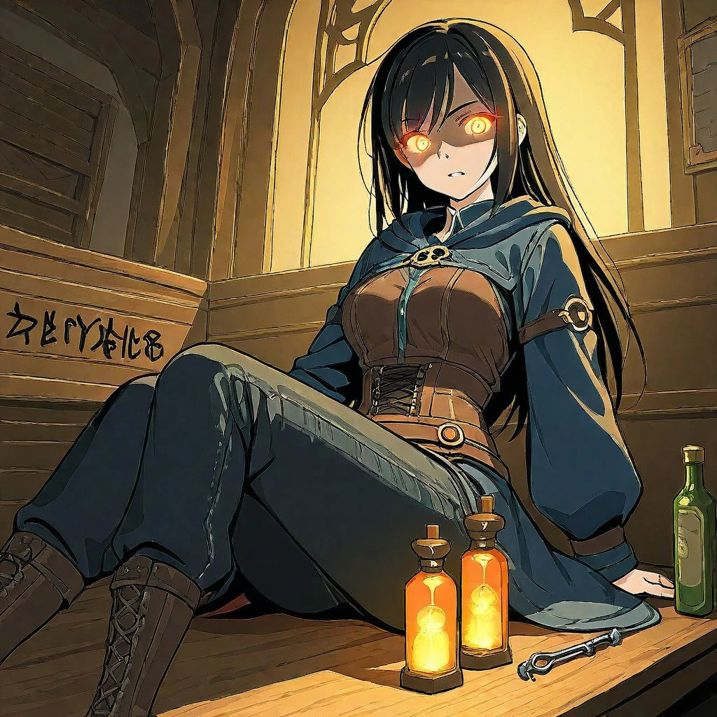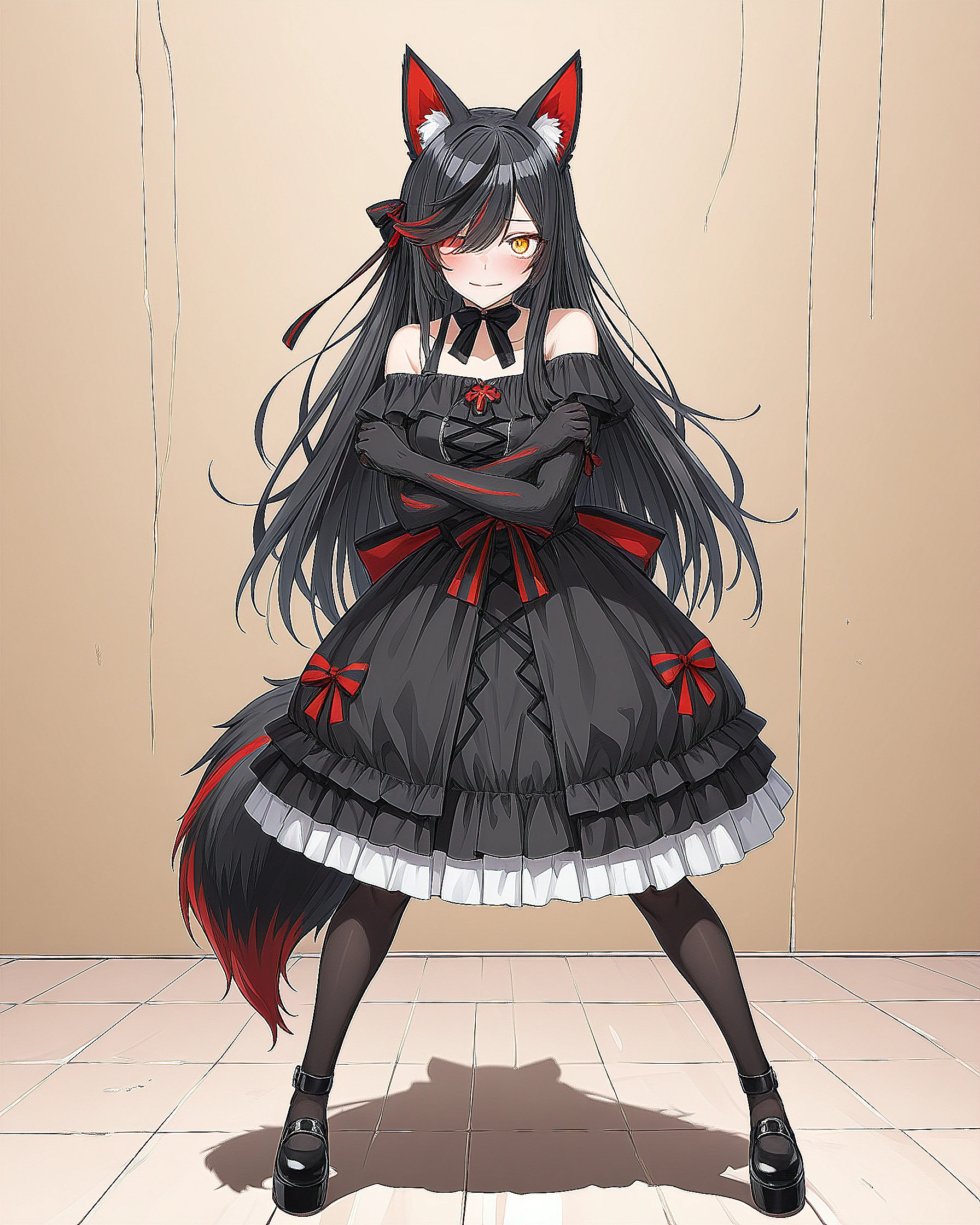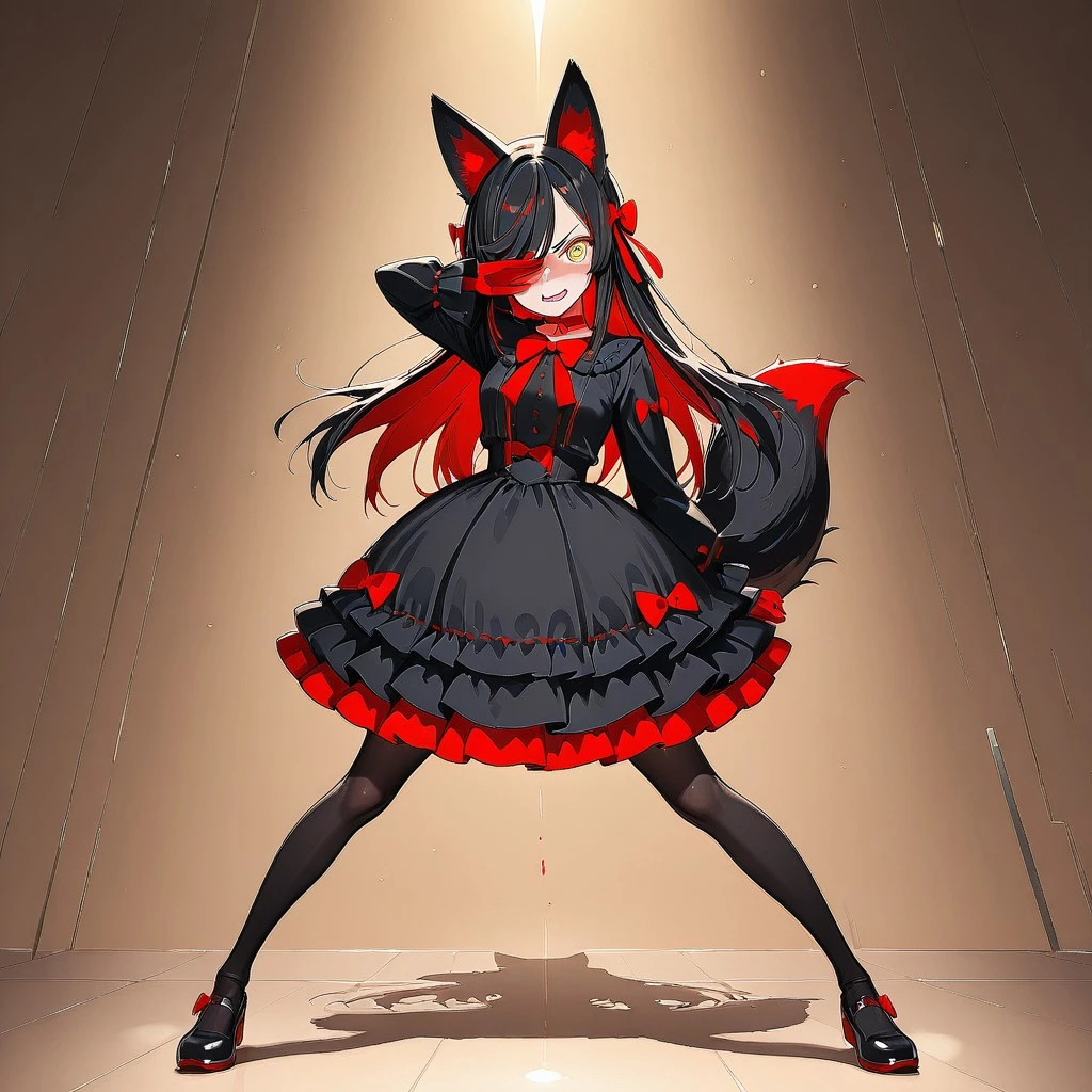 A gothic foxgirl with a striking red and black color palette. She wears a frilly gothic lolita dress adorned with red bows and intricate lace. Her long black hair features red highlights, matching her vivid red fox ears (with red inner fur) and fluffy fox tail with a red tip. Golden eyes, a confident or mysterious expression, and elegant poses round out her dark yet enchanting presence. Ideal for fantasy, anime, or magical girl aesthetics.