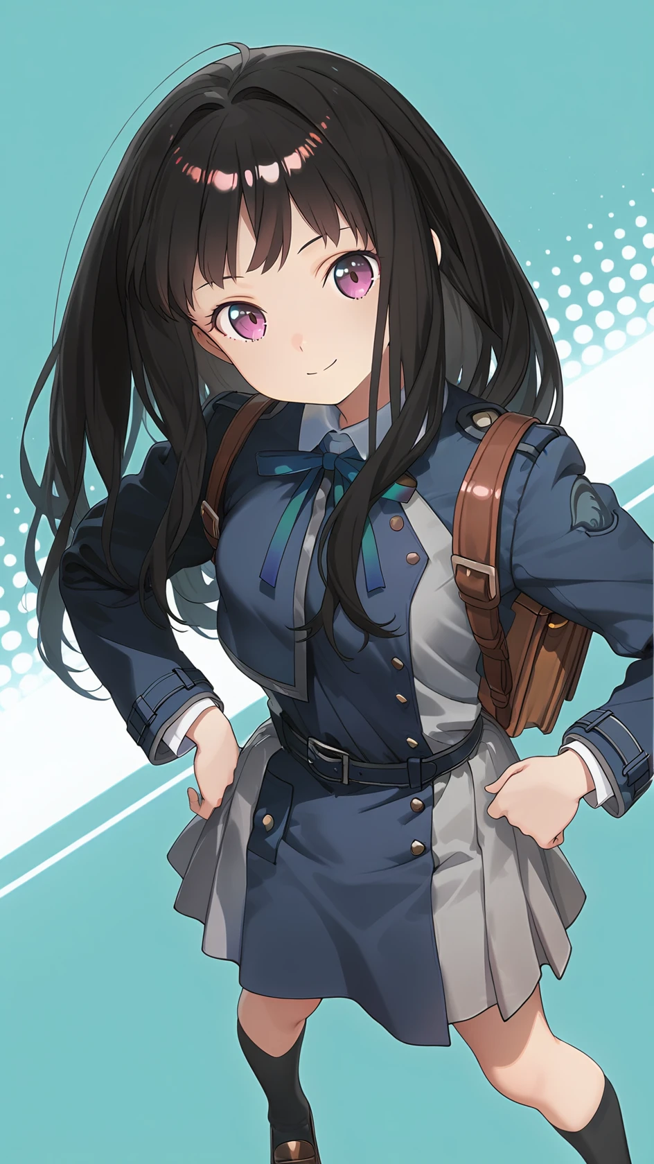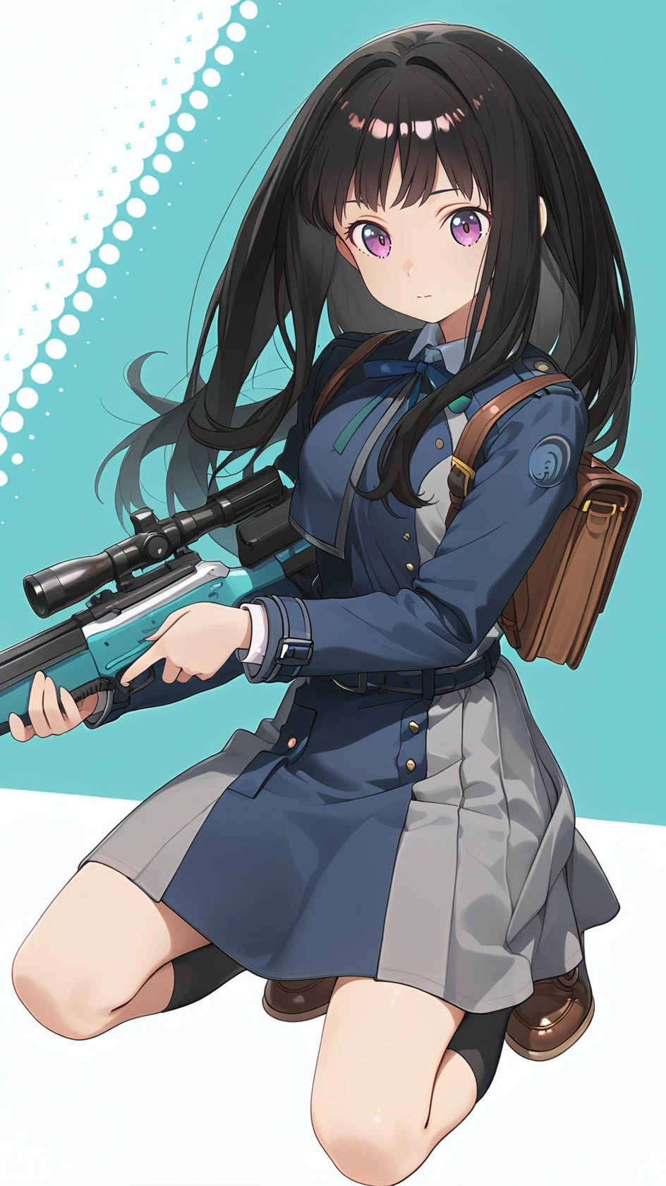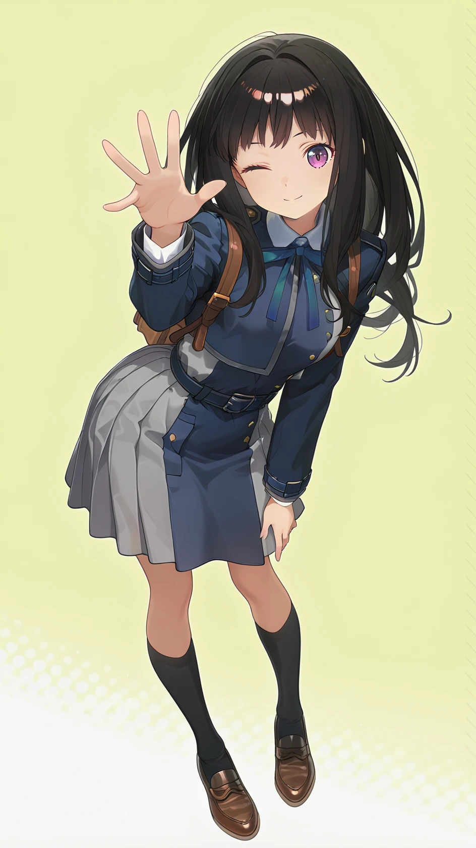 long hair, bangs, purple eyes, black hair, shirt, long sleeves, dress, ribbon, school uniform, white shirt, shoes, socks, collared shirt, belt, bag, kneehighs, neck ribbon, blue dress, brown footwear, backpack, blue ribbon, black socks, loafers, green ribbon, pleated dress, grey dress, two-tone dress, blue belt, lycoris uniform,