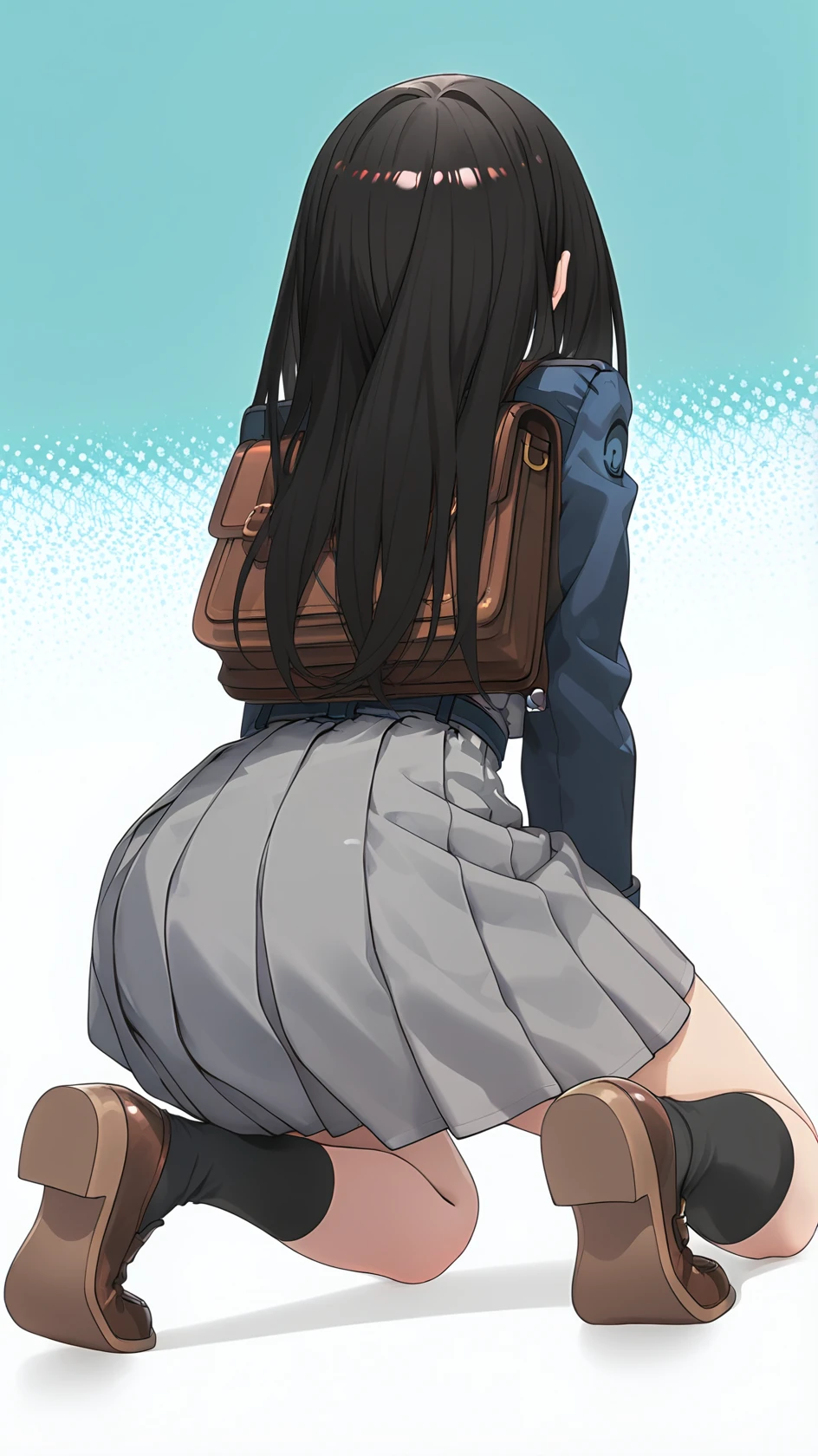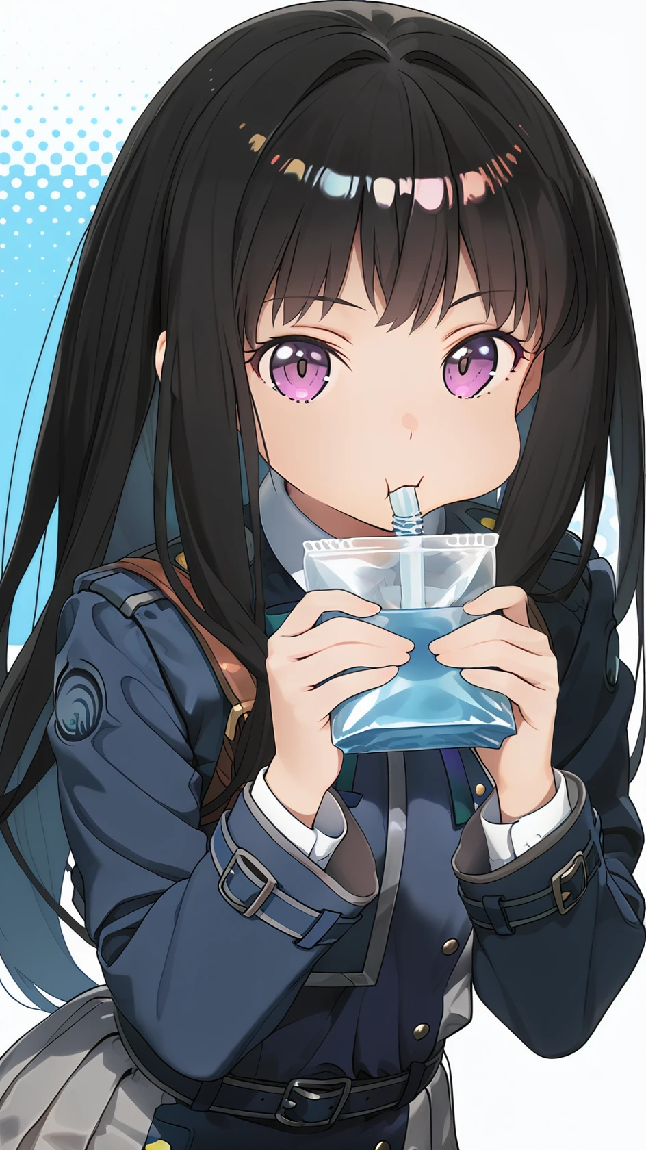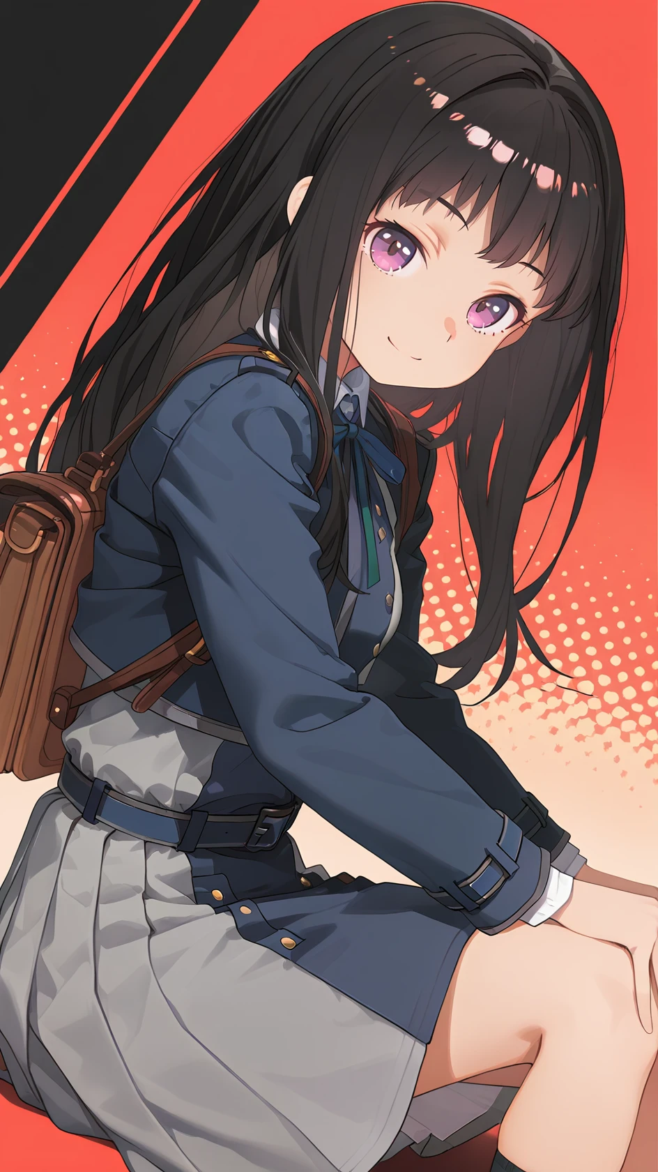 long hair, bangs, purple eyes, black hair, shirt, long sleeves, dress, ribbon, school uniform, white shirt, shoes, socks, collared shirt, belt, bag, kneehighs, neck ribbon, blue dress, brown footwear, backpack, blue ribbon, black socks, loafers, green ribbon, pleated dress, grey dress, two-tone dress, blue belt, lycoris uniform,