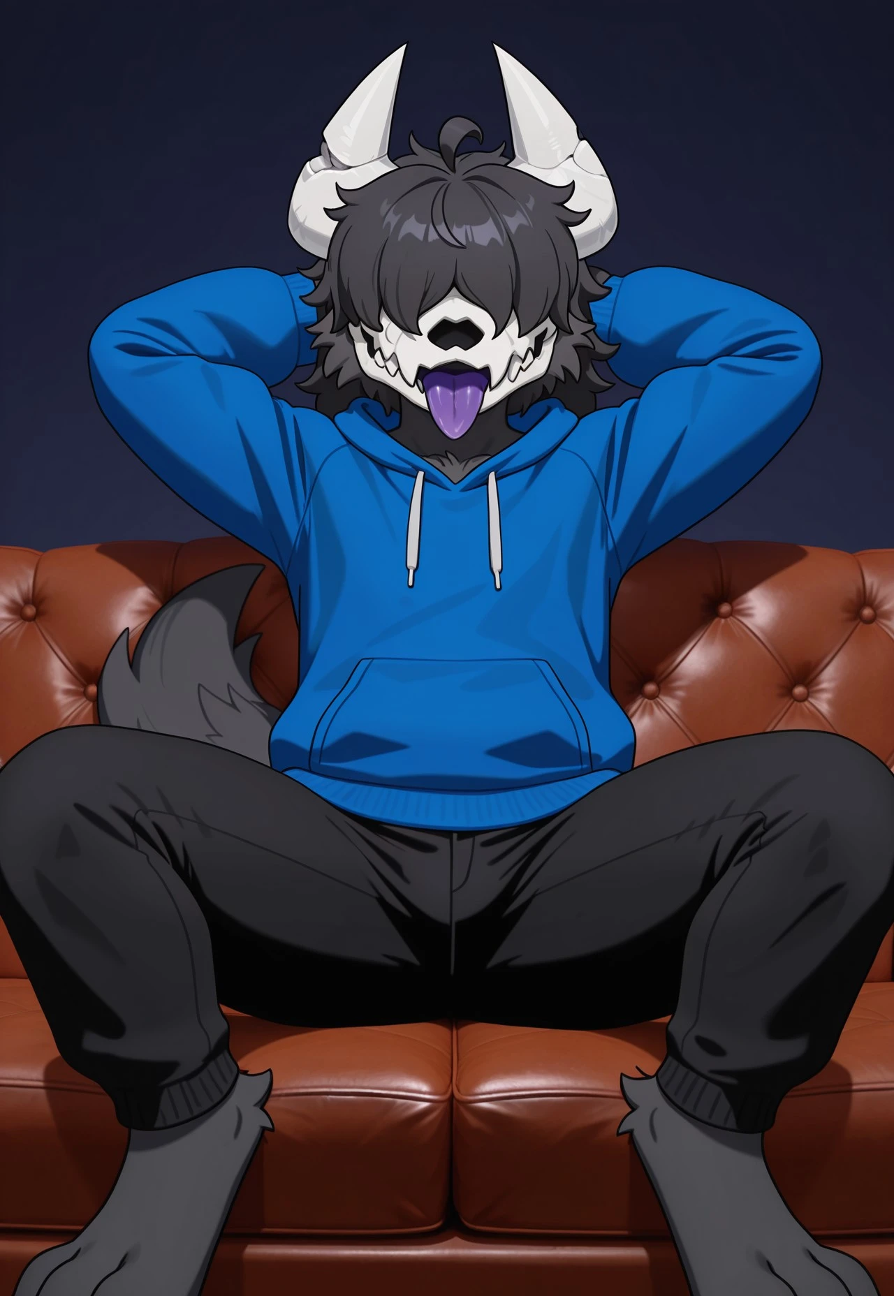 Kurrozz,hair_over_eyes,fluffy,covered eyes,wolf_tail,furry,black_hair,animal_skull,black_skin,deer_skull,broken_horn,buffahorn,horns,tail,teeth,upper_teeth_only,blue_hoodie,Black_pant