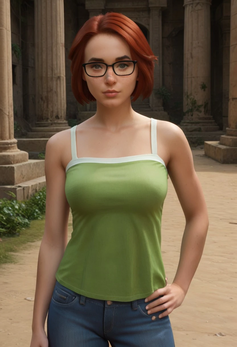 glasses, green shirt, bare shoulders, tank top, blue pants, jeans,