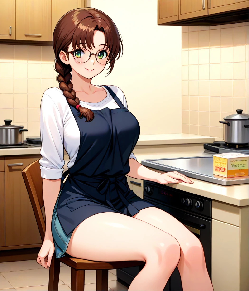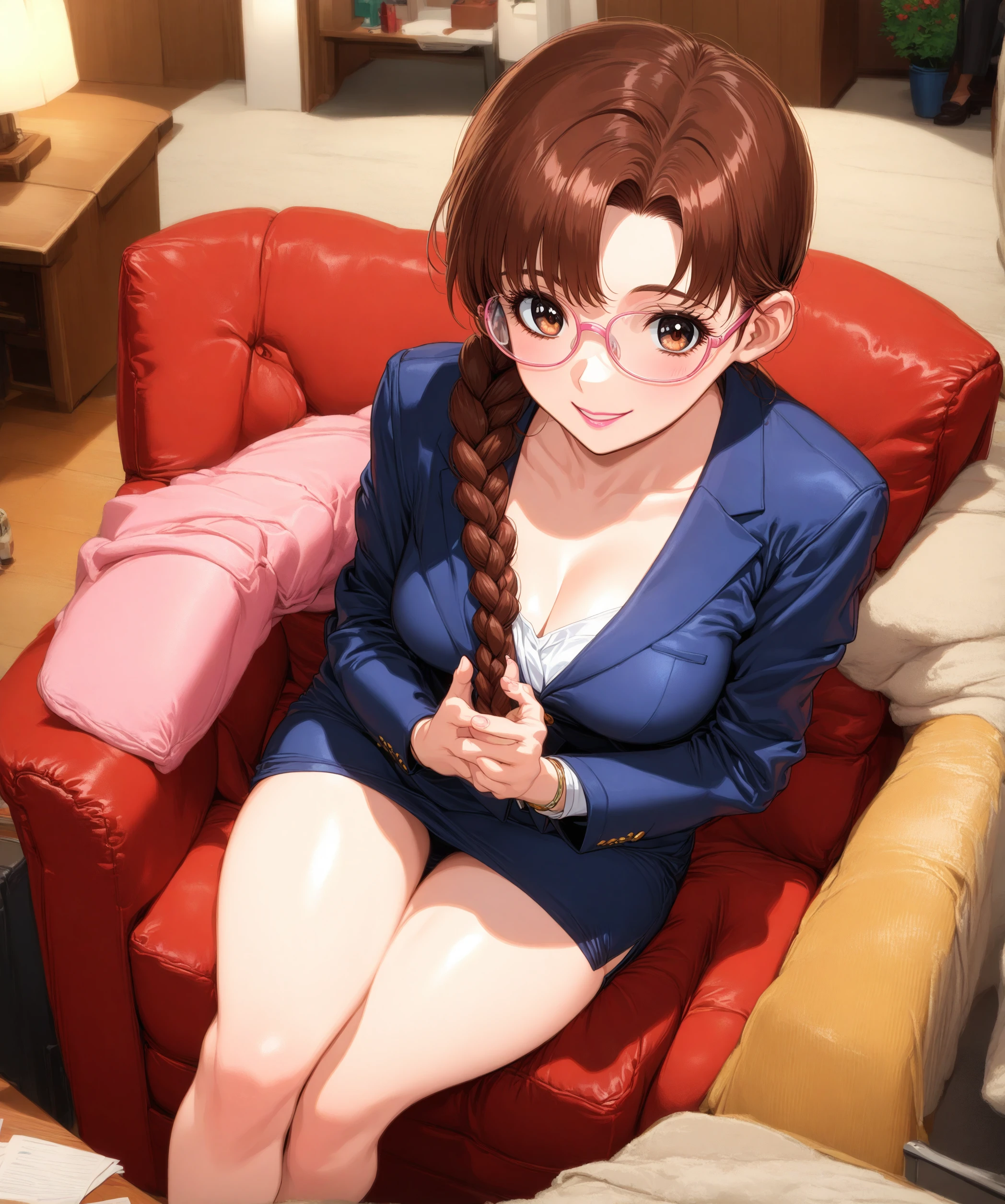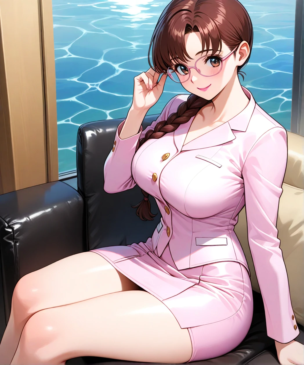 ayumi_arima,long hair,brown hair,25 year old woman,large_breast, one pigtail,pink lip, glasses,pink suit,one braid,short skirt,