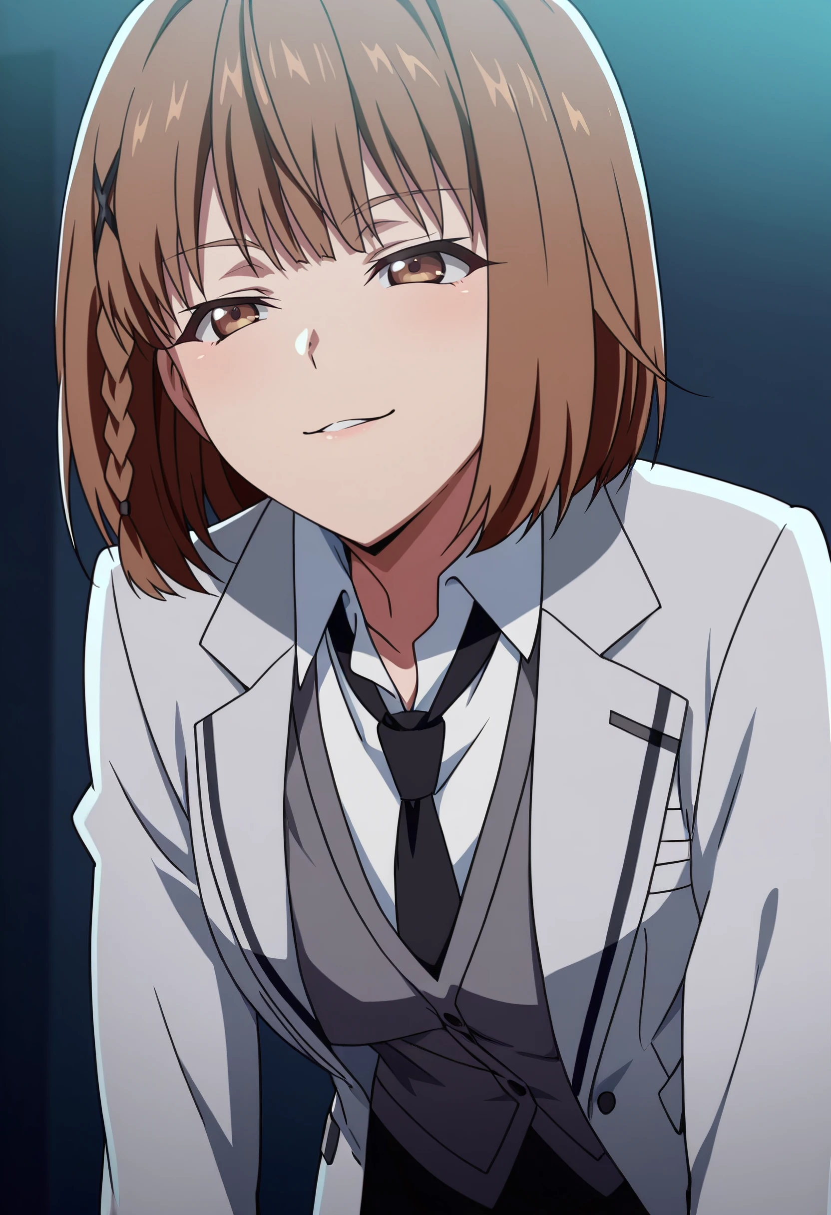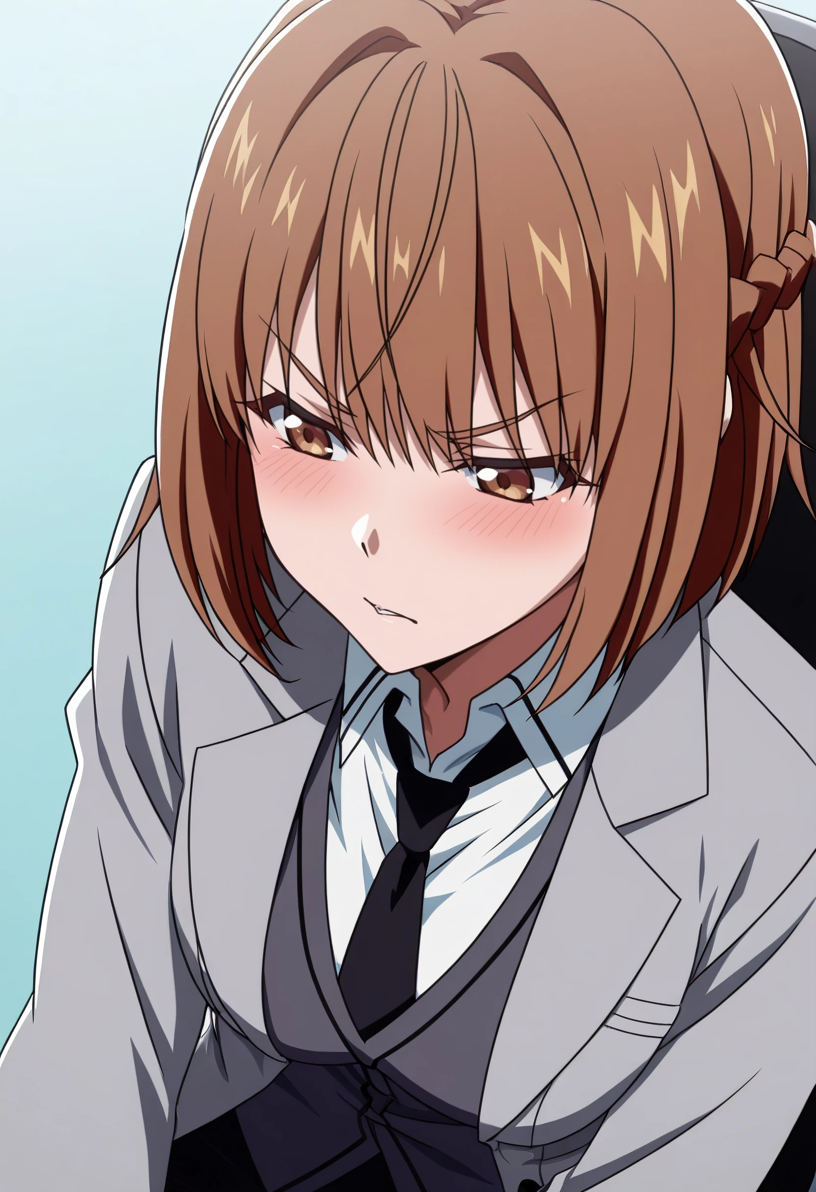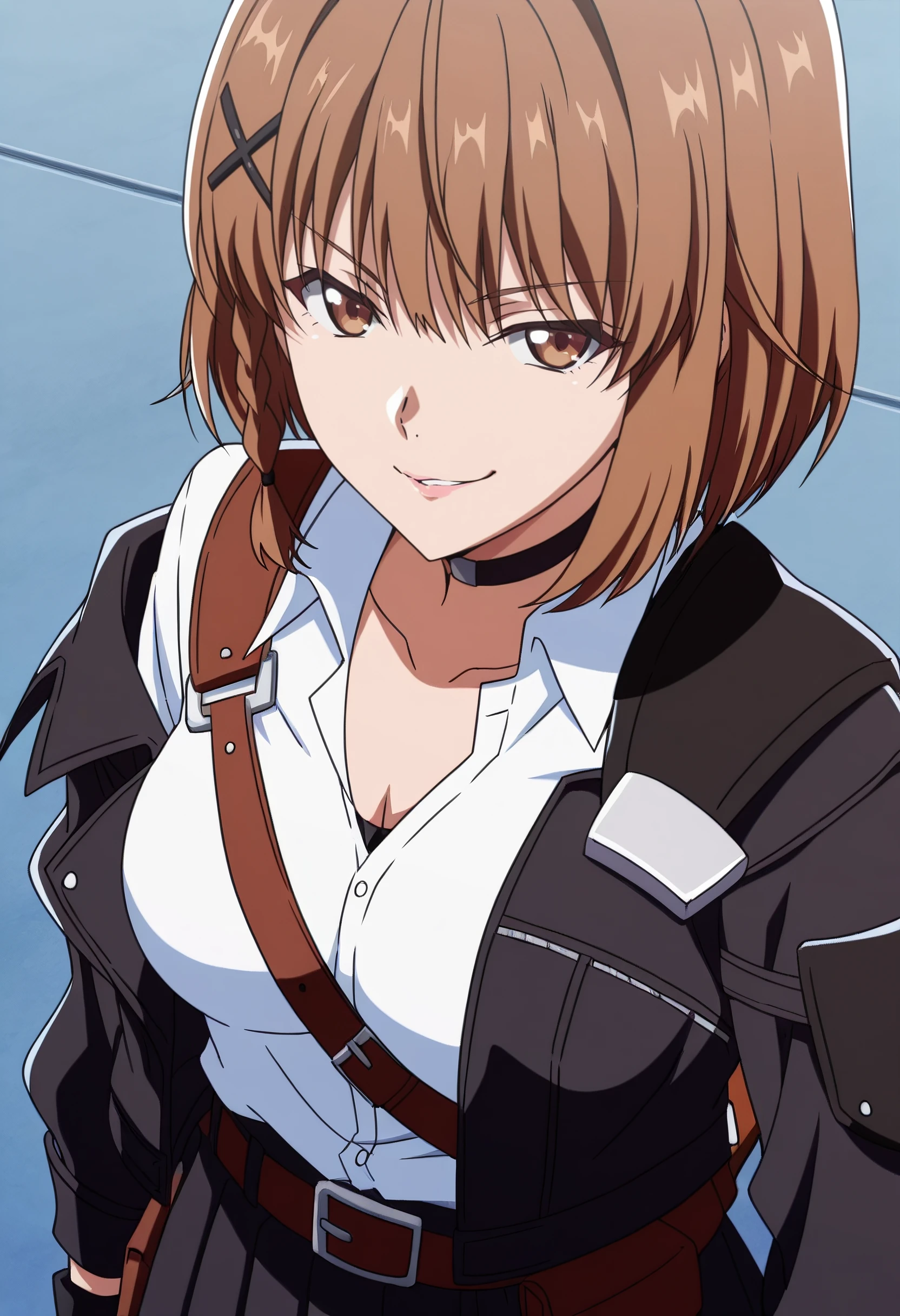 FFrIkusaba, brown hair, short hair, bangs, eyebrows visible through hair, brown eyes, braid,
