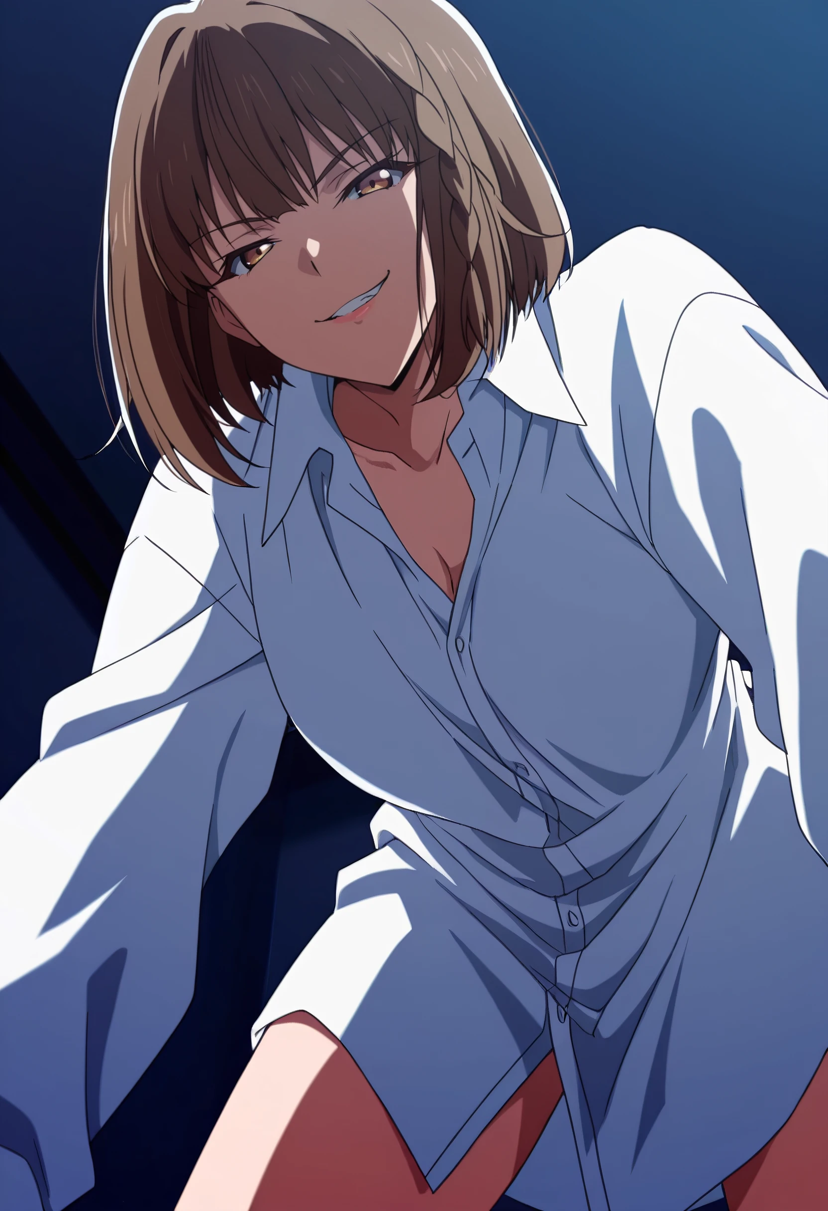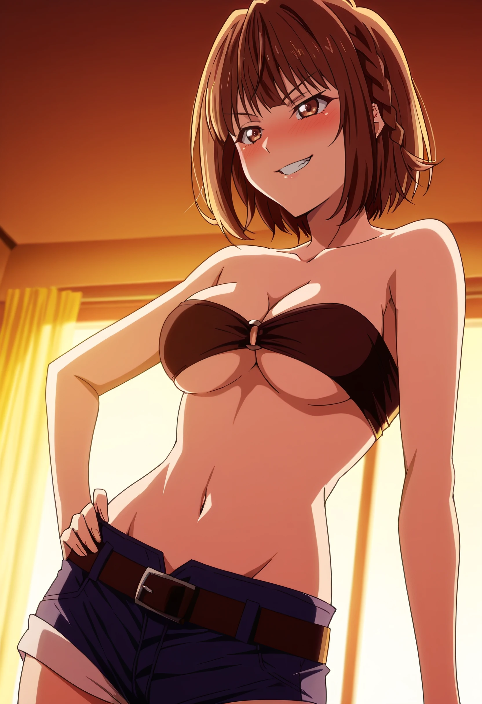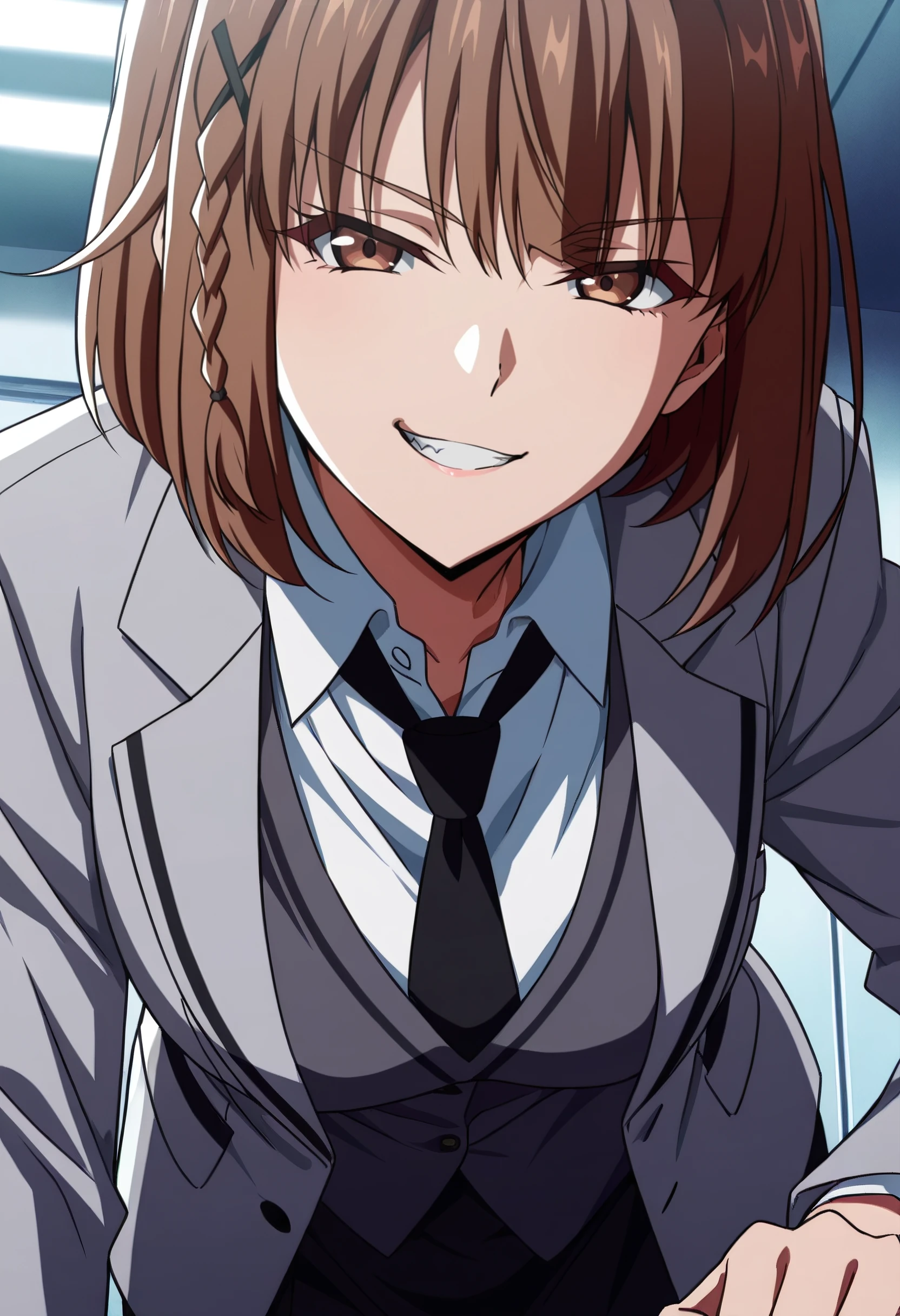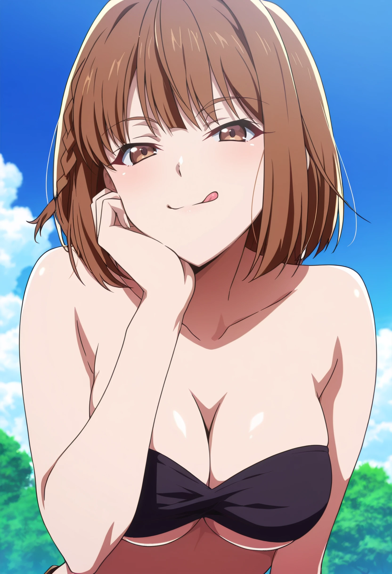 FFrIkusaba, brown hair, short hair, bangs, eyebrows visible through hair, brown eyes, braid,