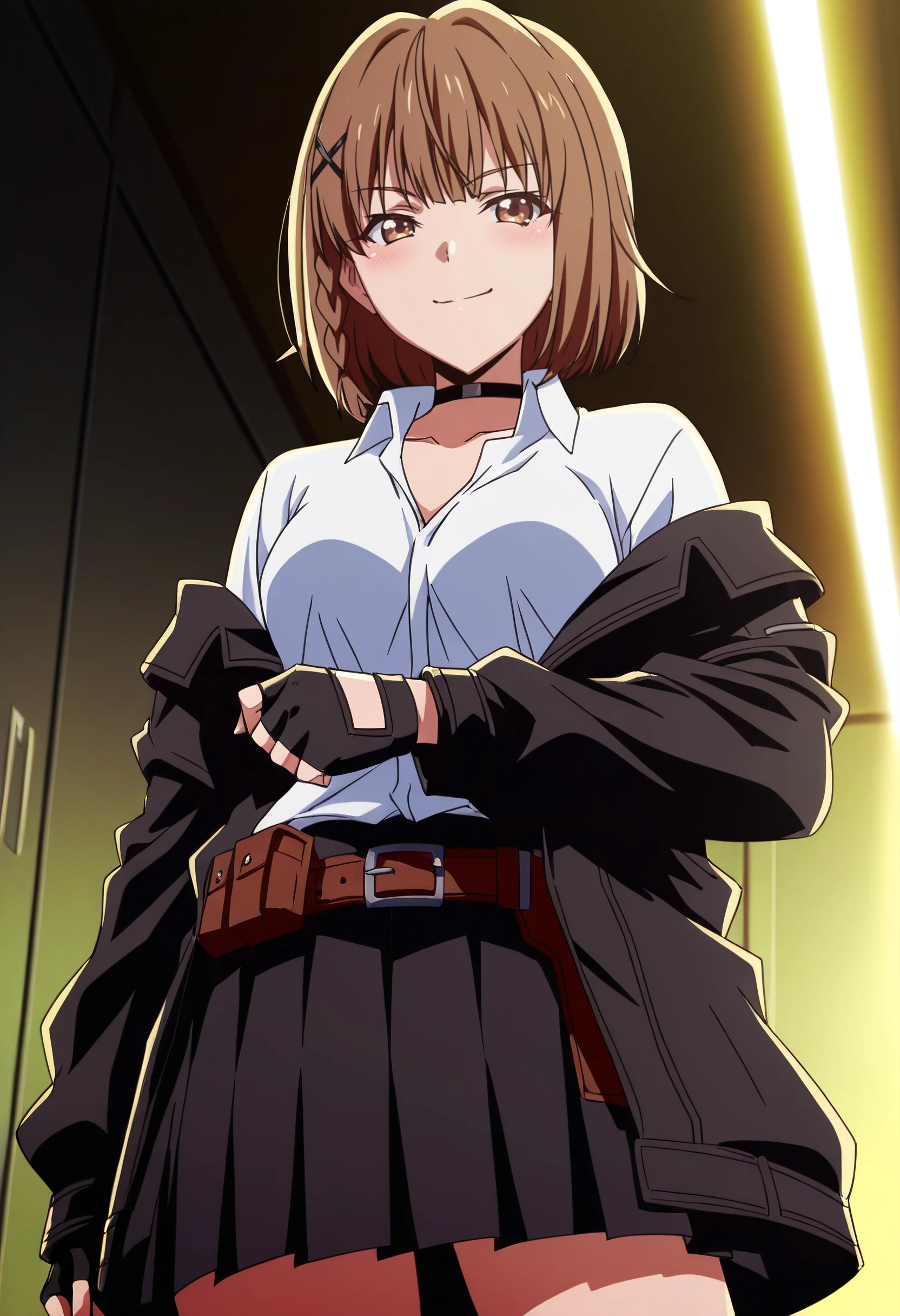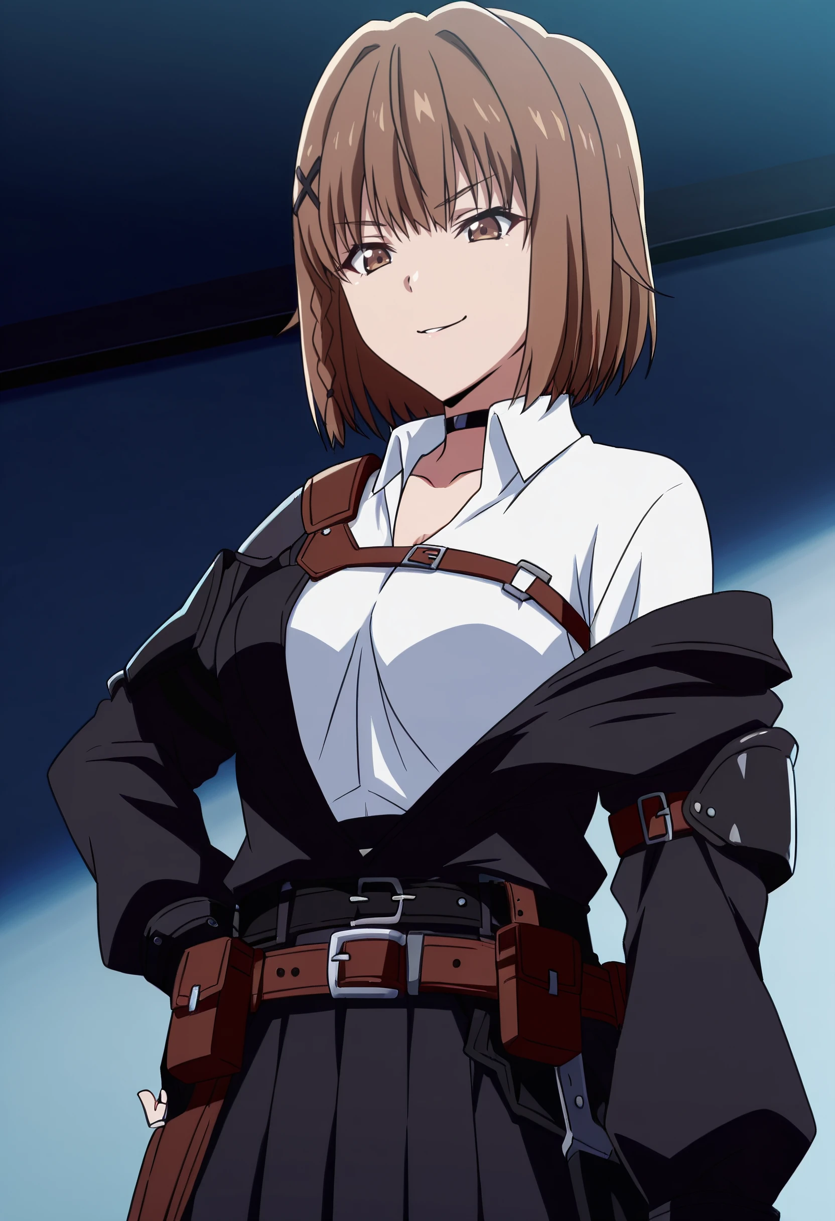 IkusabaOutfit, shirt, white shirt, skirt, hair ornament, collared shirt, choker, jacket, long sleeves, off shoulder, collarbone, x hair ornament, black choker, gloves, black skirt, black gloves, fingerless gloves, pleated skirt, belt, black jacket, open jacket,