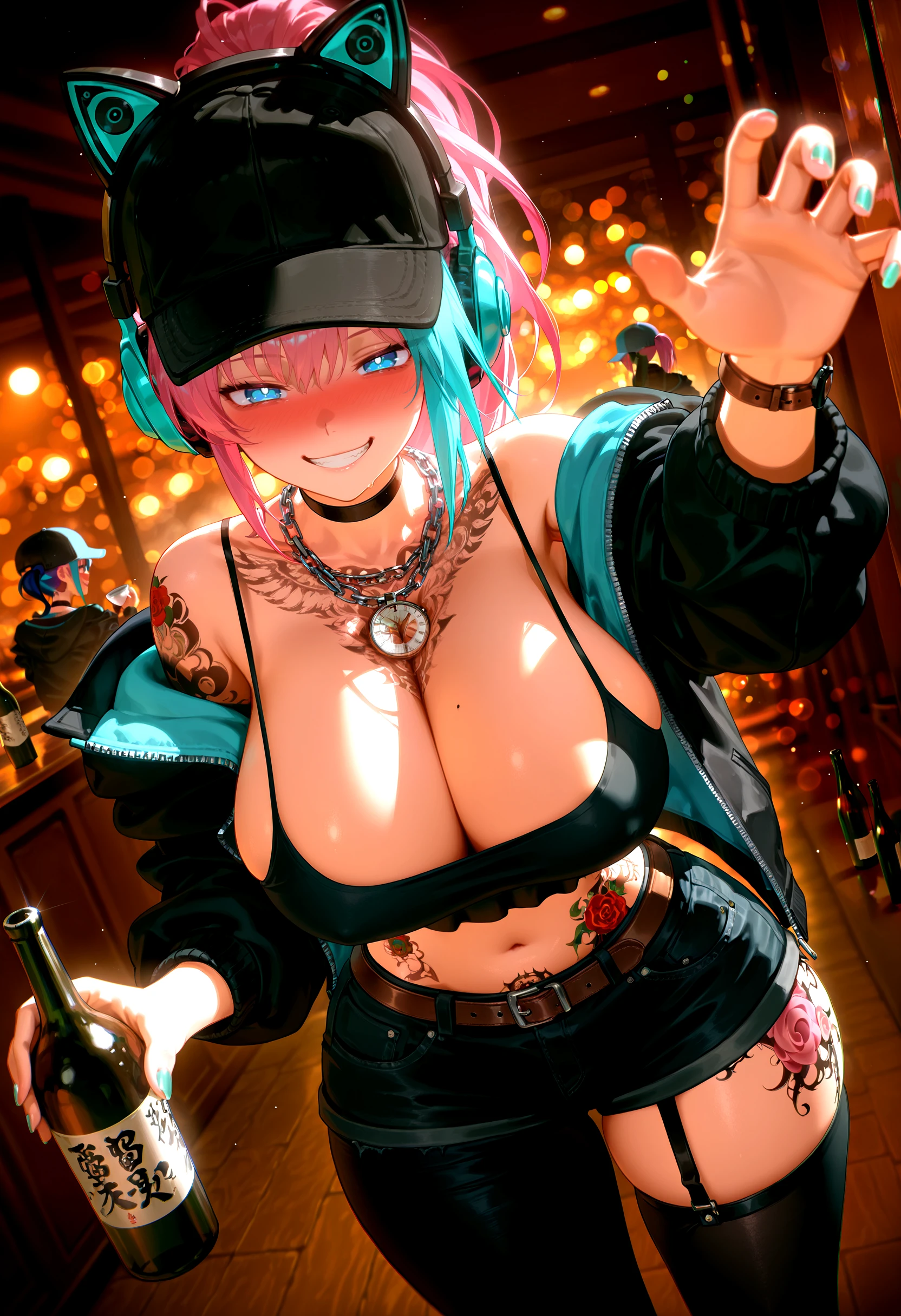 air_yuriko, blue eyes, bright pupils, white pupils, ponytail, bangs, blue hair, pink hair, multicolored hair, two-tone hair, huge breasts, (thick thighs:1.25), wide hips,