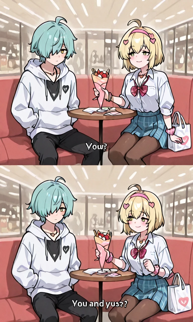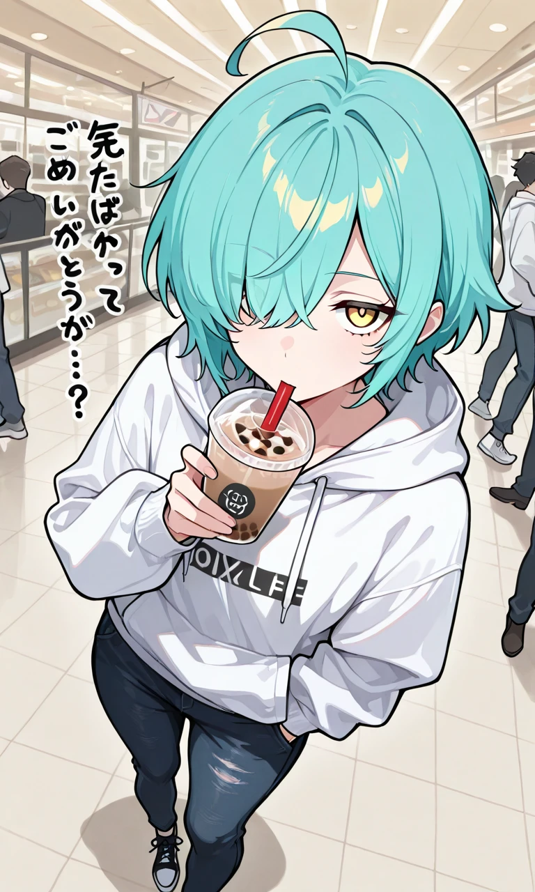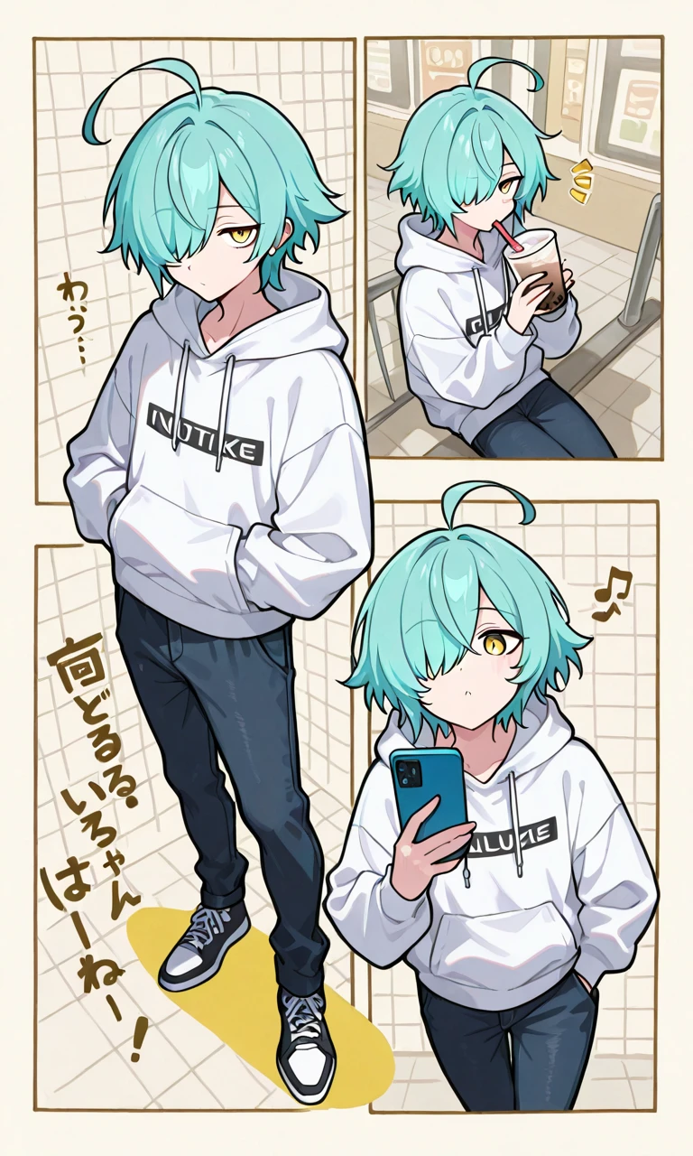 1boy, aqua hair, hair over one eye, ahoge, yellow eyes,🧥Outfit