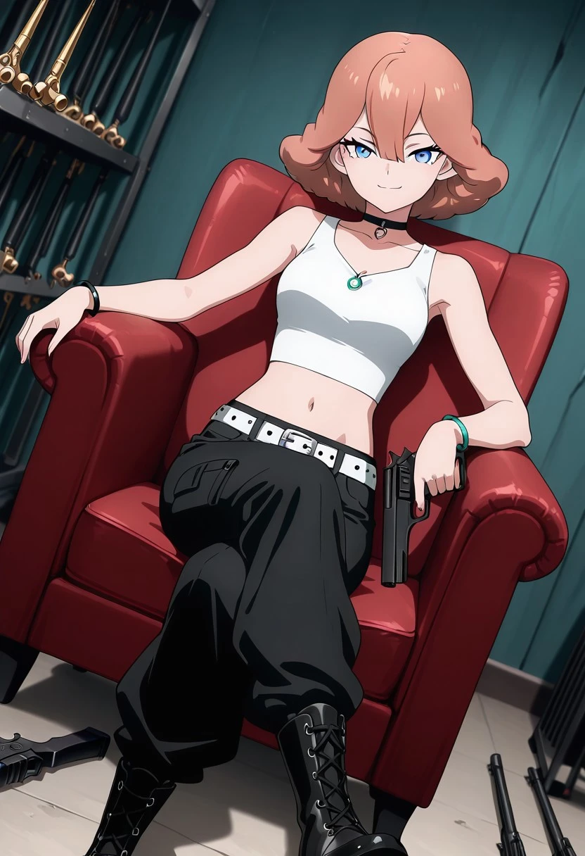choker, collarbone, white crop top, sleeveless, bracelet, navel, black pants, baggy pants, belt, boots, black footwear,
