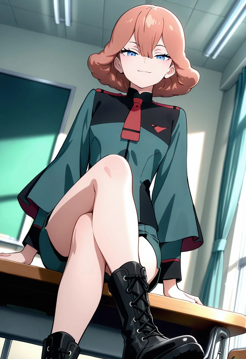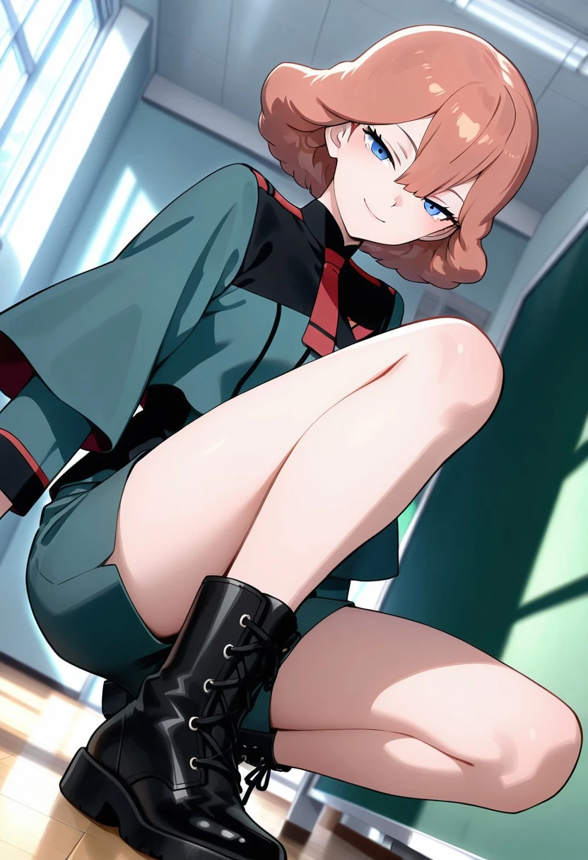 uniform, necktie, red necktie, jacket, green jacket, shorts, green shorts, boots, black footwear,