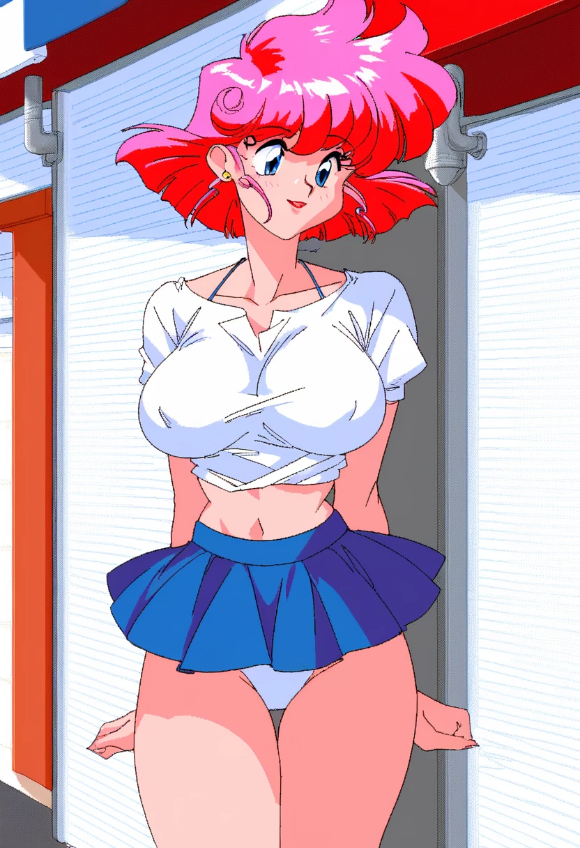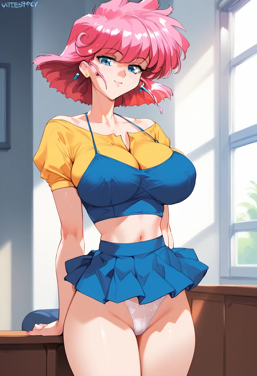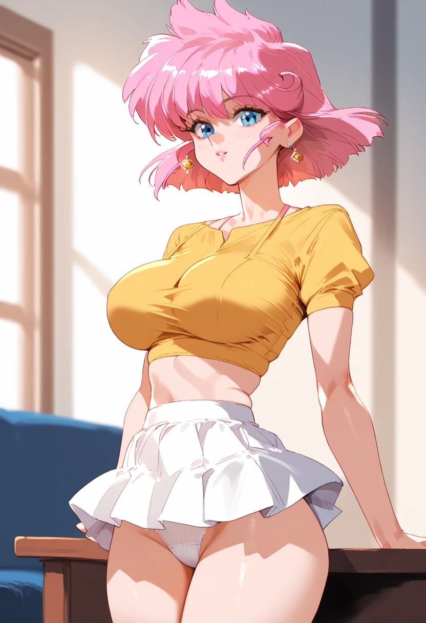 Trigger: ruribtr, pink hair female, short hair, earrings, large breasts, blue eyes, skirt, white panties, midriff