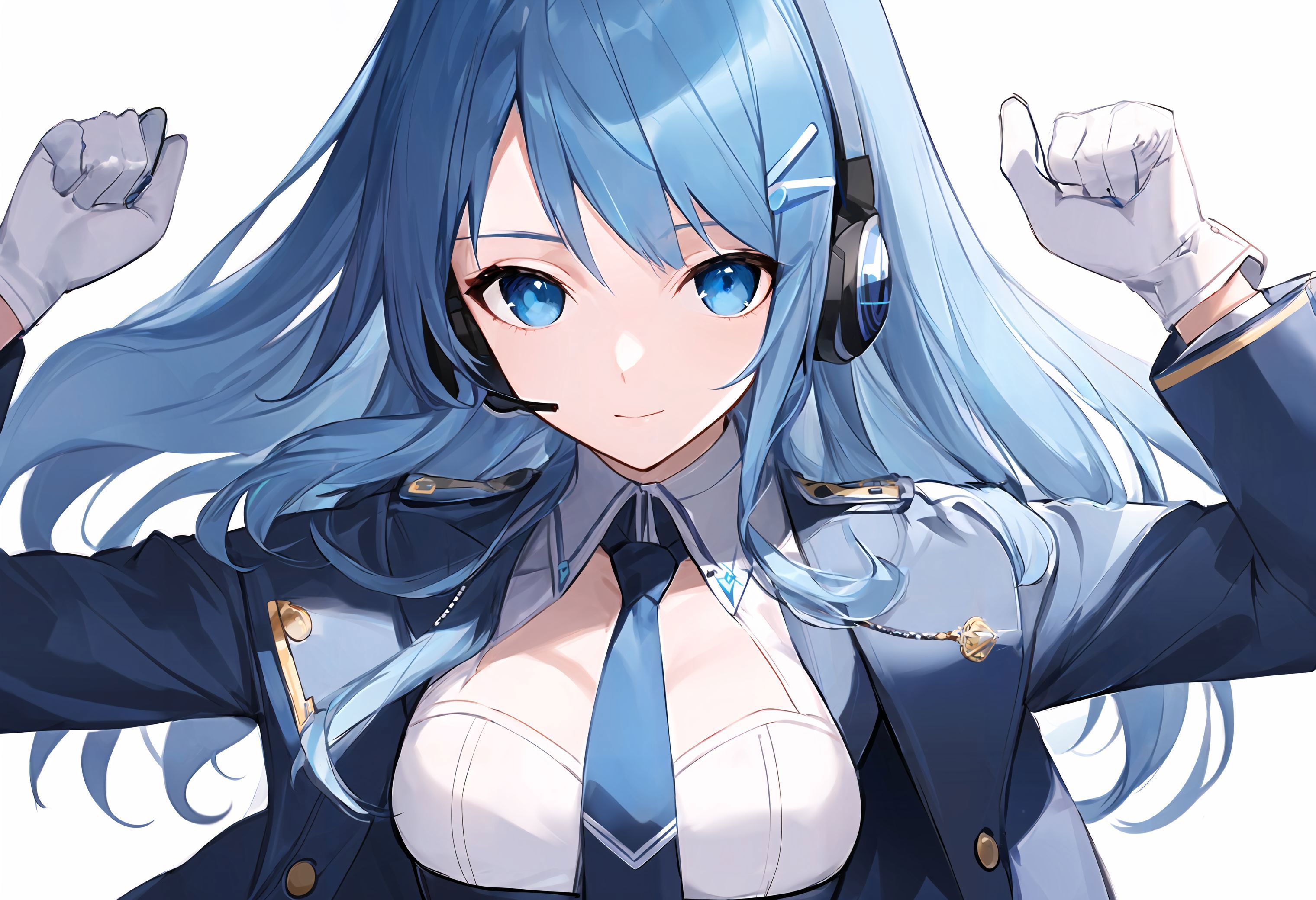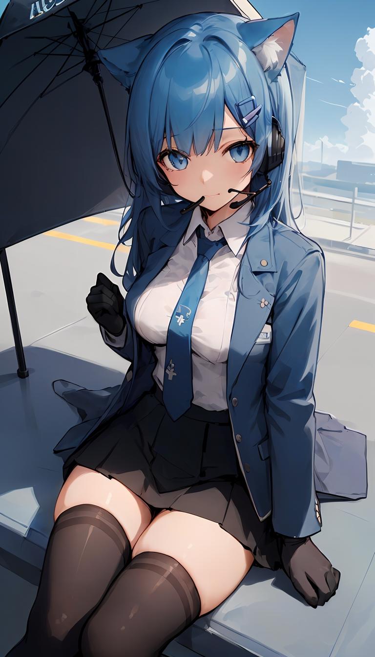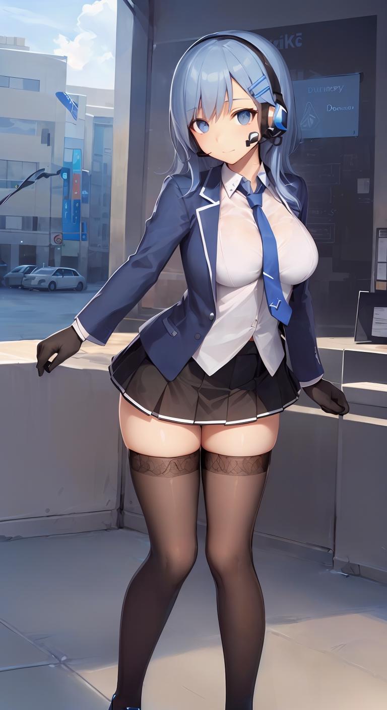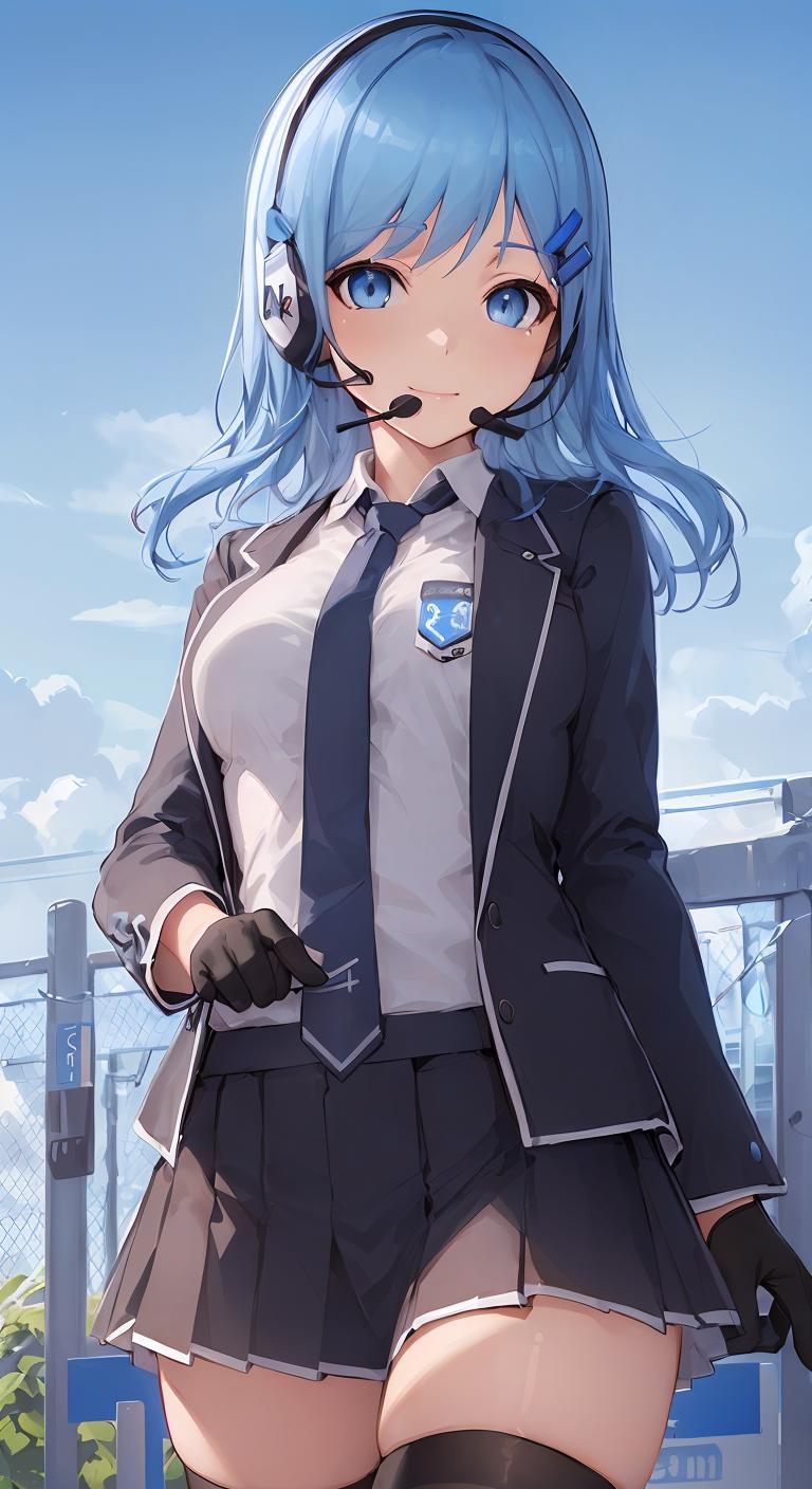 不会用的话直接复制粘贴以下的prompt可以比较还原训练集:1girl, solo, blue eyes, blue hair, long hair, hair ornament, gloves, necktie, looking at viewer, white gloves,hairclip, headset, personification, index finger raised, uniform, jacket, black necktie, shirt, long sleeves