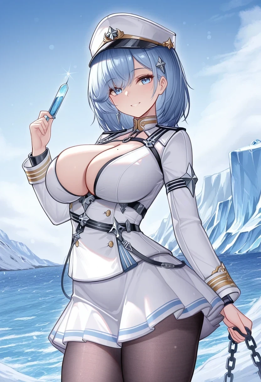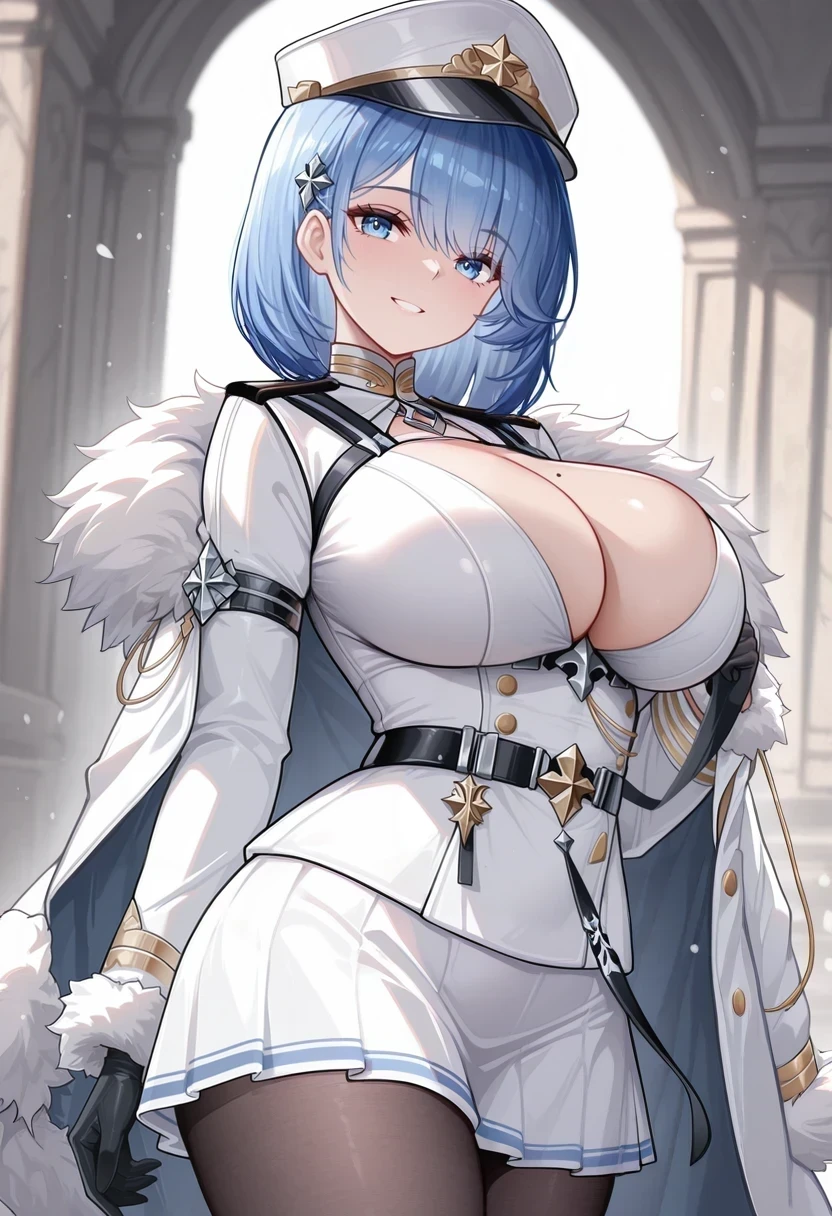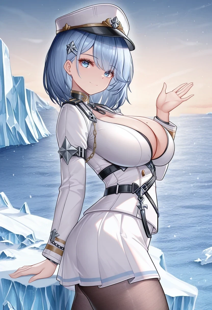 white jacket,military hat,white skirt,black pantyhose,hair ornament,cleavage,