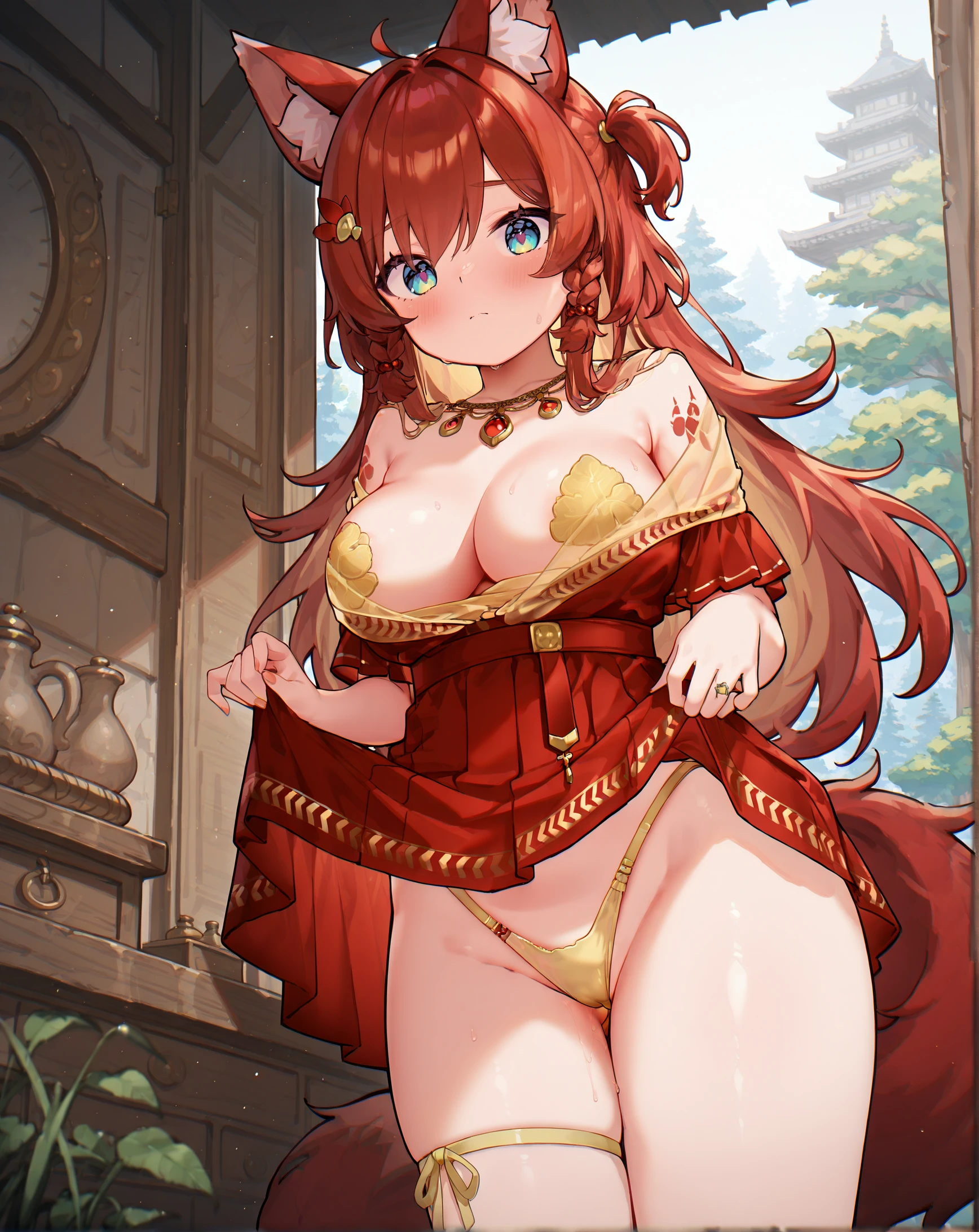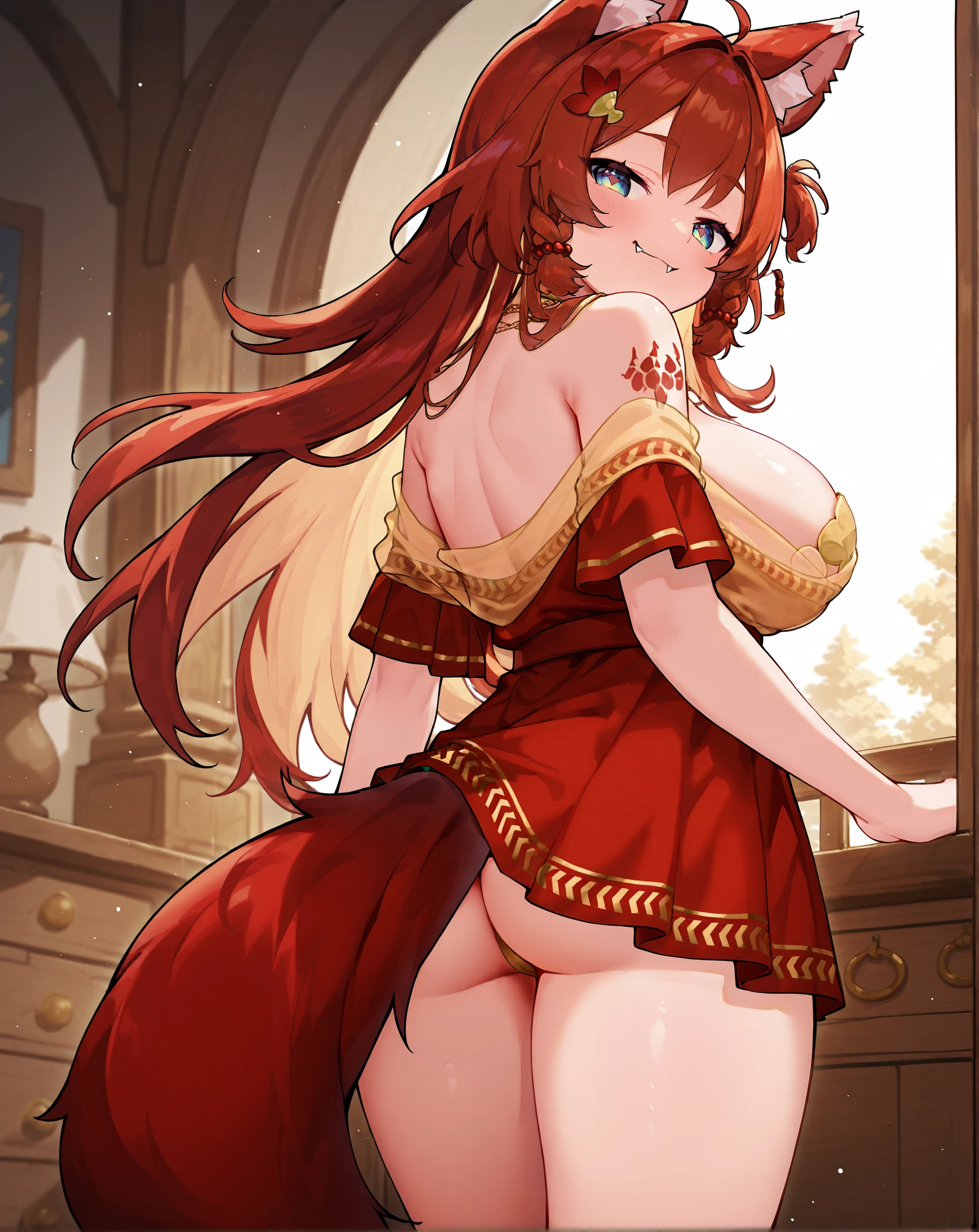 pichiroman, dress, sandals, paw print, shoulder tattoo, thigh strap, tunic,Description