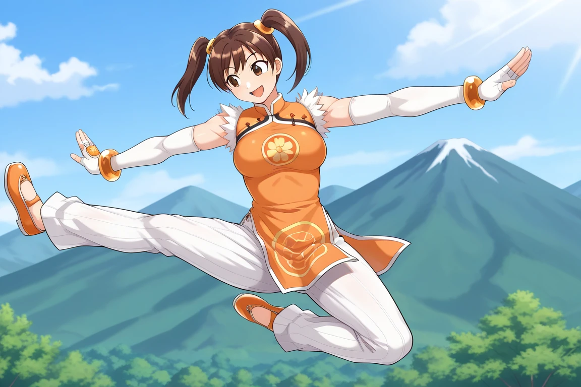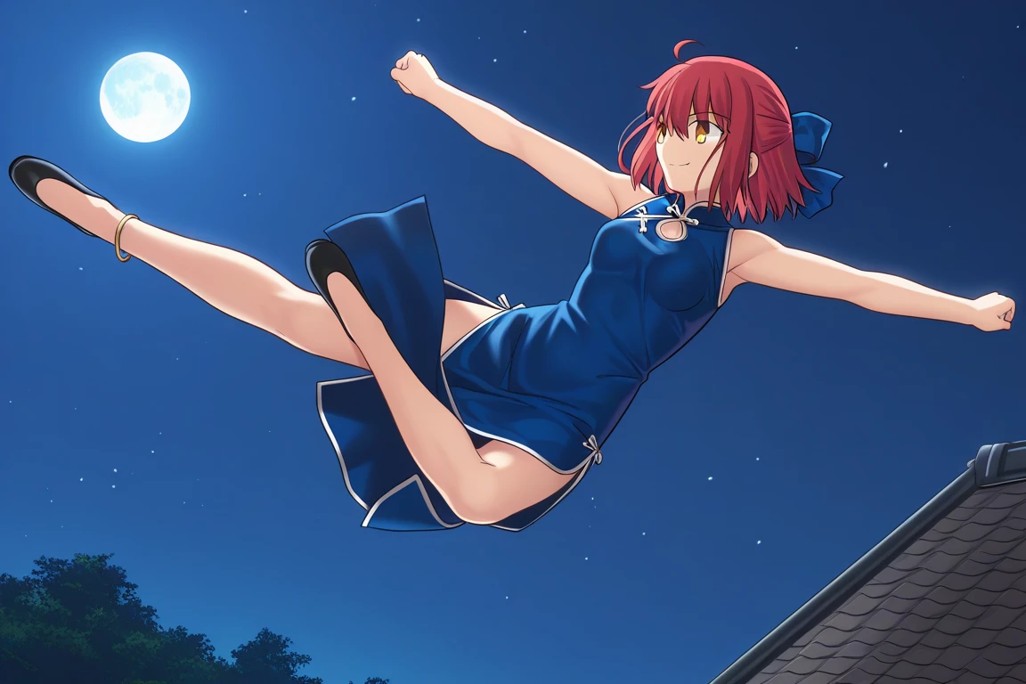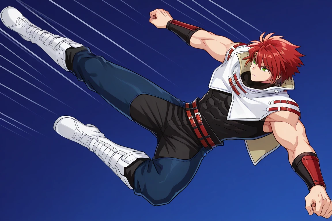 keywords: nantogokusatsuken, jumping, flying, flying kick, kicking, spread arms,