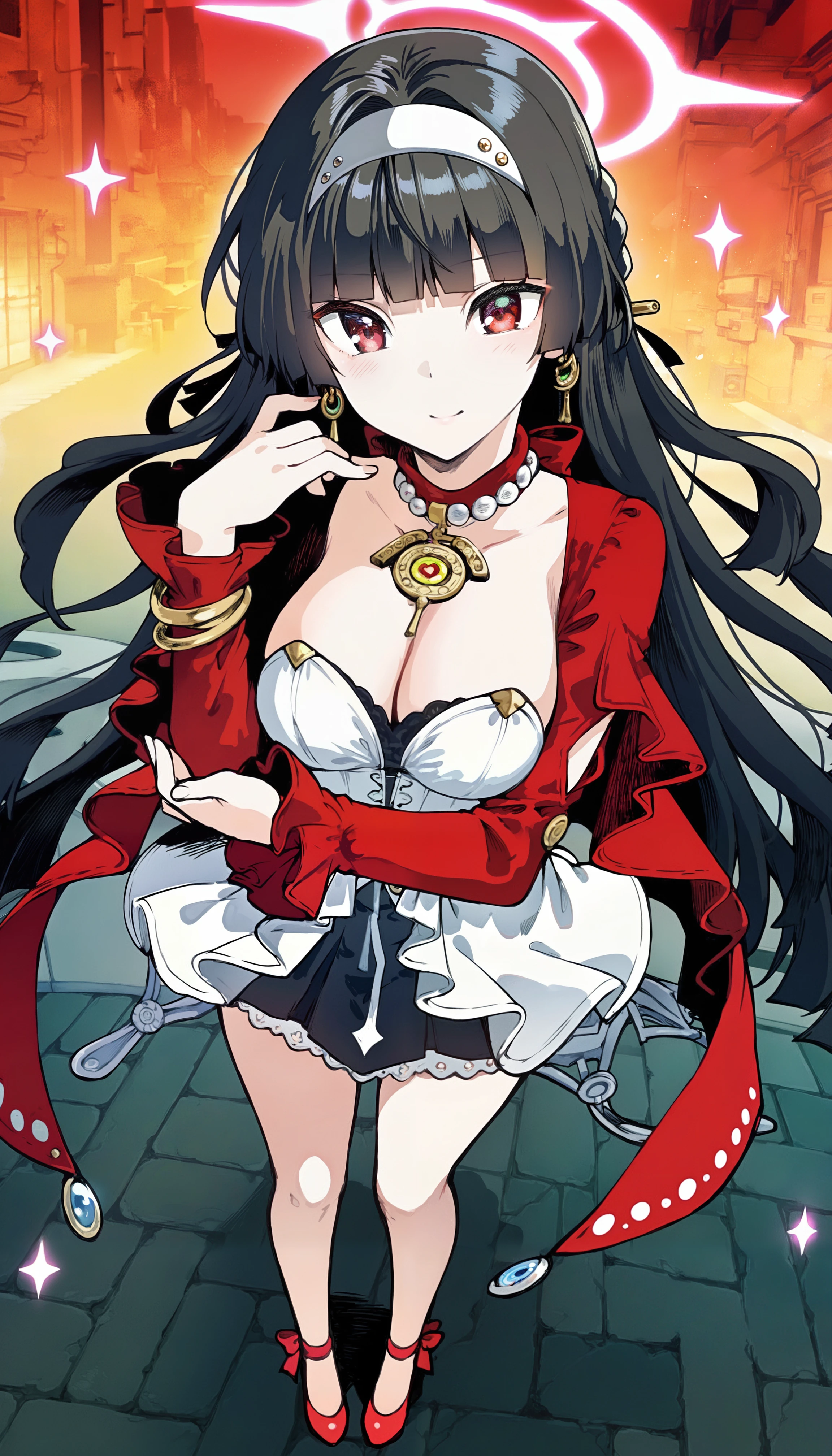 tag:tj_astra_yao,bangs,breasts,full body,red jacket,jewelry,long hair,white skirt,solo,standing,(red eyes:1.3),looking_at_viewer,black hair,blunt bangs , earrings ,hairband,necklace,