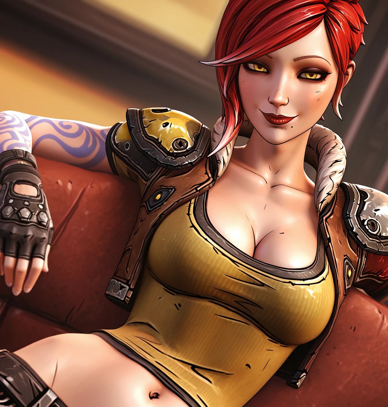 Lilith: (lilith \(borderlands\)), 1girl, solo, yellow eyes, short hair, shirt, large breasts, gloves, cleavage, medium breasts, brown eyes, jacket, collarbone, upper body, red hair, open clothes, midriff, navel, fingerless gloves, open jacket, (lips), makeup, swept bangs, tank top, lipstick, mole under mouth, brown jacket, cropped jacket, nose, red lips, shoulder pads, sleeveless, slender, arm tattoo, asymmetrical hair, collarbone, black eyeliner, eyelashes, cyberpunk
